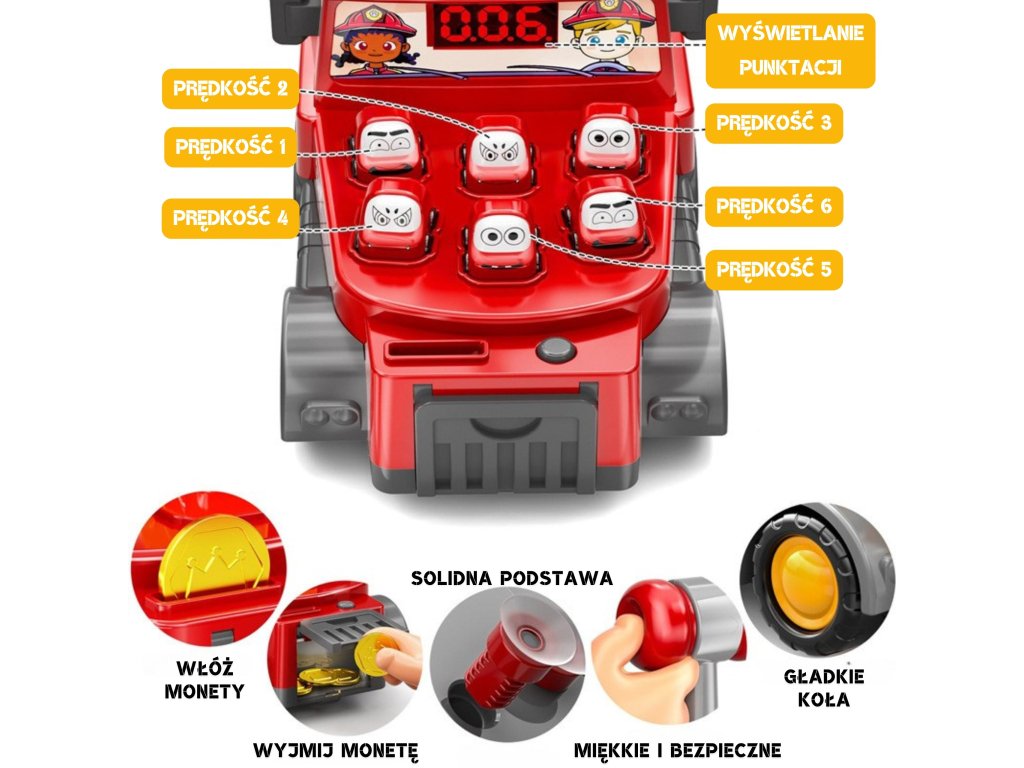 Hasičské auto 2w1 značkyWoopie je jedinečná hračka, ktorá deťom poskytne hodiny tvorivej, aktívnej a vzrušujúcej zábavy. Je to kombinácia dynamických arkádová hra "Hit a mole" s klasickýmauto na šoférovanie. Stačí vhodiť mincu, chytiť mäkké kladivo a získavať body zasiahnutím "krtkov" v podobe malých červených autíčok! Farebný dizajn, robustná konštrukcia a multifunkčnosť robí z hračky skutočný pútač pozornosti pre každého malého hasiča.