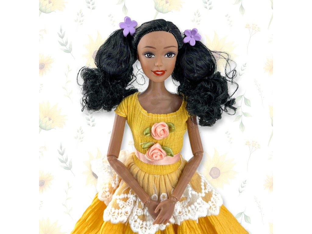 - Oblečenie: Žlté šaty s čipkou a ružovými kvetmi