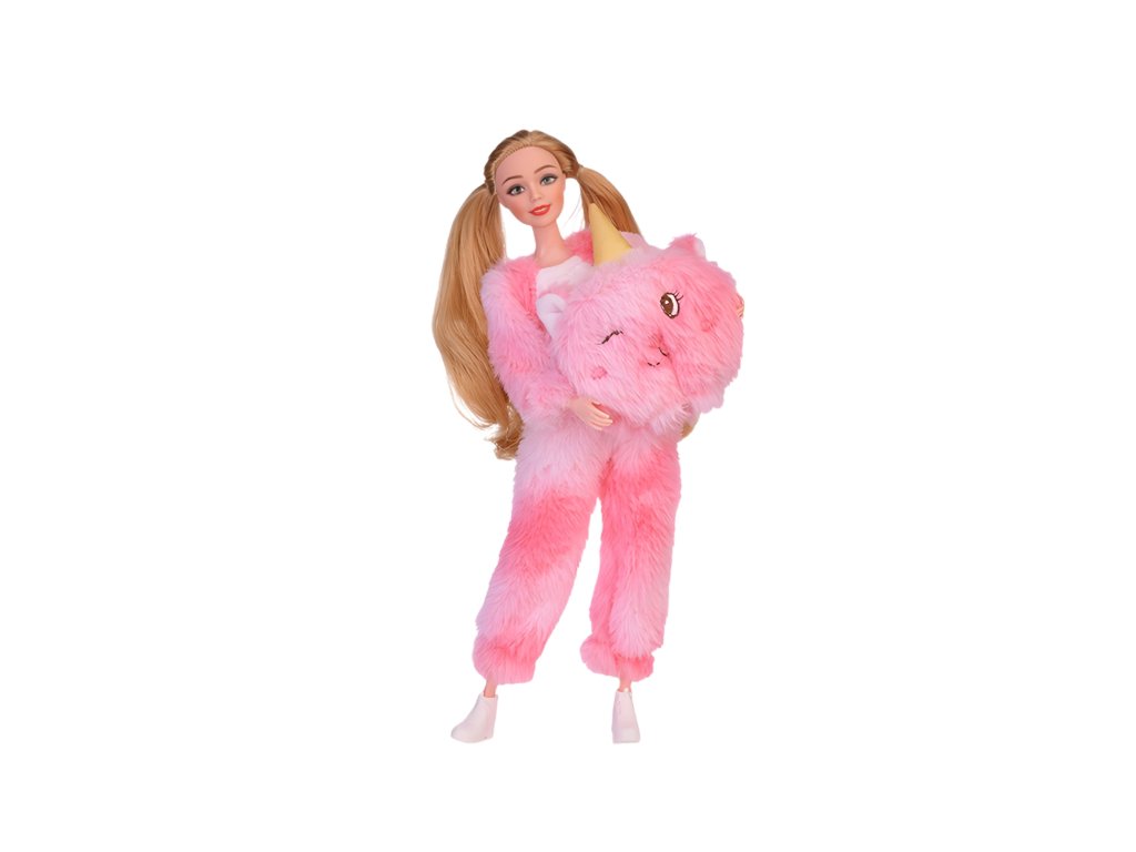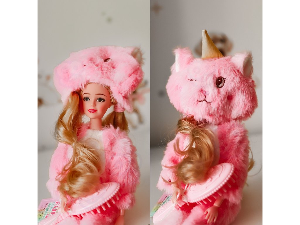 - - Bábika Emily v ružovom kožušinovom oblečení