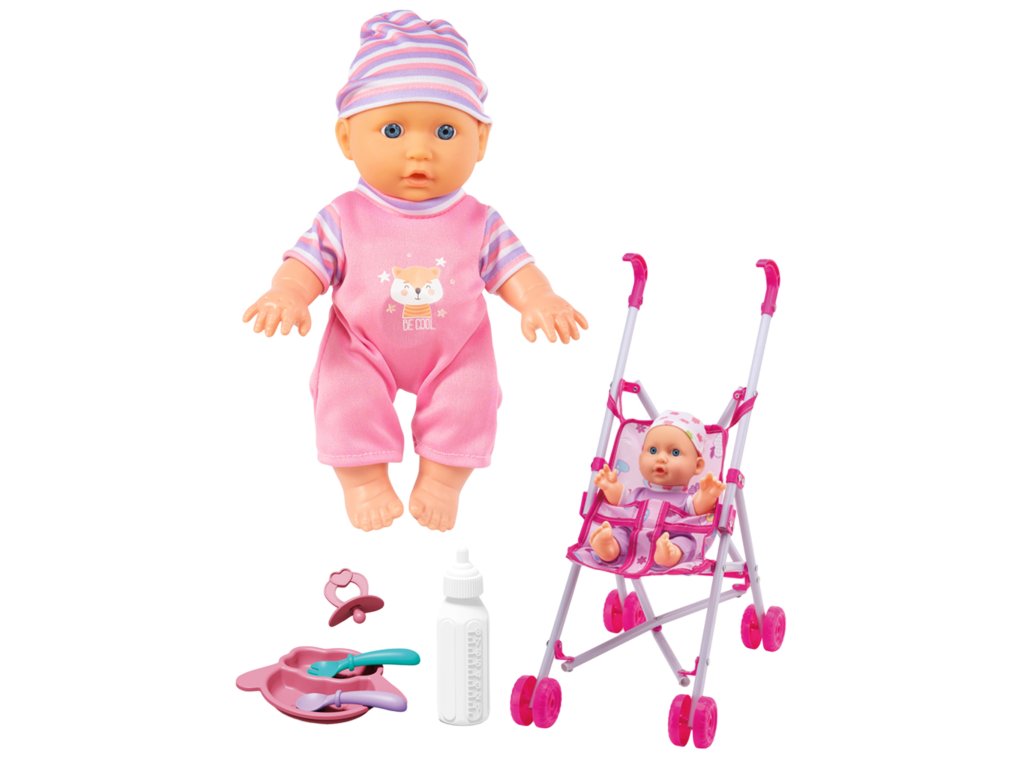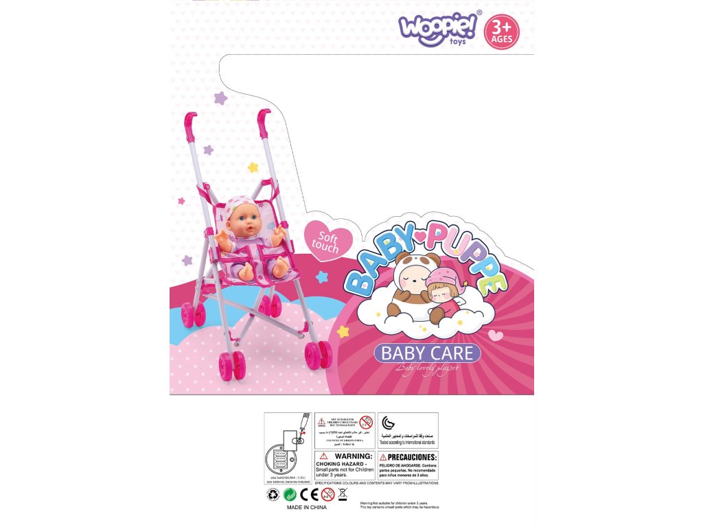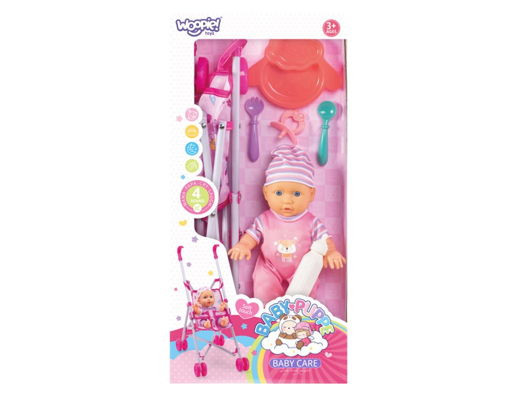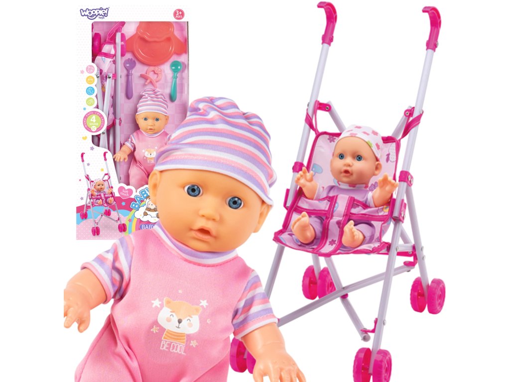 Bábika s kočíkom a súpravou na kŕmenie od značkyWOOPIE je ideálnyprvá bábika bábätkatí, ktorí chcú napodobňovať správanie dospelých pri starostlivosti o deti. Bábika vydáva zvukyzvuky t. j. mamička, otecko, plač alebo smiech, čo hre dodáva ešte väčšiu realistickosť. Dieťa ju môže kŕmiť alebo brať na prechádzky vďaka kočíku, ktorý je súčasťou súpravy.