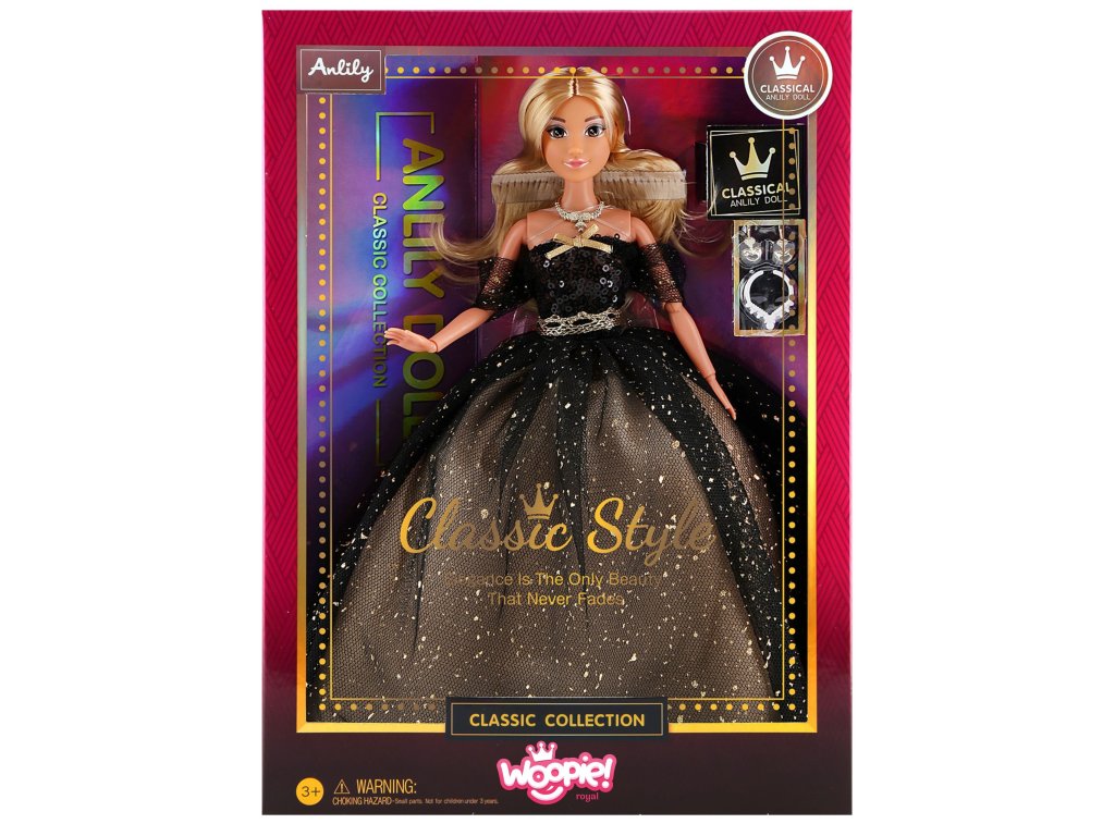 Bábika značky LilyWoopie je skutočnou ikonou štýlu a elegancie! Zaujme veľkolepým večerným outfitom v odtieňoch čiernej a zlatej, ktorý zdobia tisíce flitrov. Dlhé zlaté vlasy sú ideálne na vytváranie tých najkrajších účesov. Táto jedinečná bábika je inšpiráciou pre hru vo svete módy a elegantných večierkov.