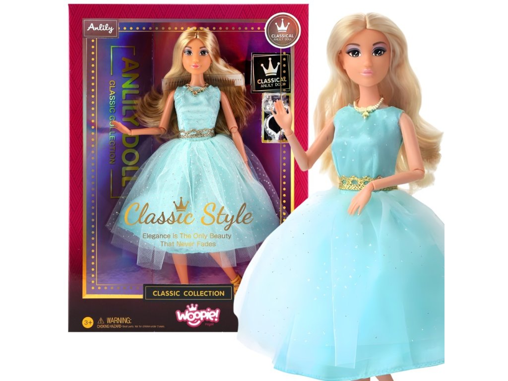 Zoznámte sa s krásnou bábikou Lily odWoopie Royal, ktorý zaujme nadčasovým štýlom a výnimočnou eleganciou. Táto očarujúca blondínka s dlhými lesklými vlasmi je oblečená do rozprávkových plesových šiat v tyrkysovom odtieni, ktoré sa trblietajú jemnými odleskami. Tylová sukňa dodáva kreácii ľahkosť a šarm, zatiaľ čo zlaté doplnky - náhrdelník a opasok - podčiarkujú jej charakter. Styling dopĺňajú elegantné zlaté lodičky na podpätku, vďaka ktorým bábika vyzerá ako skutočná plesová hviezda. Je dokonalou kamarátkou na hranie pre každého malého snílka, ktorý miluje svet módy, elegancie a víl