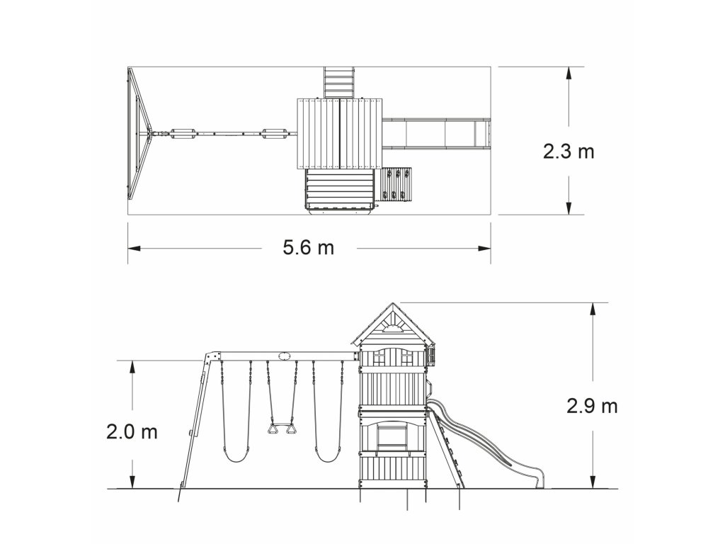 V spodnej časti nájdete priestranné pieskovisko, okno s tyčou a tri pevné hojdačky (dve jednoduché a jednu dvojitú).