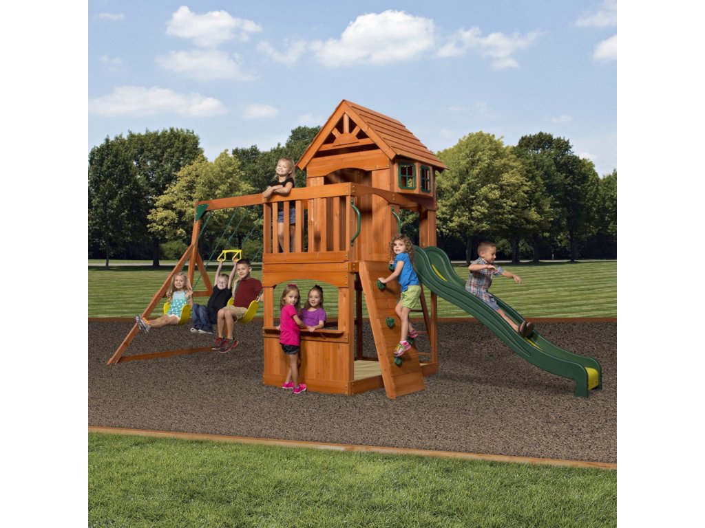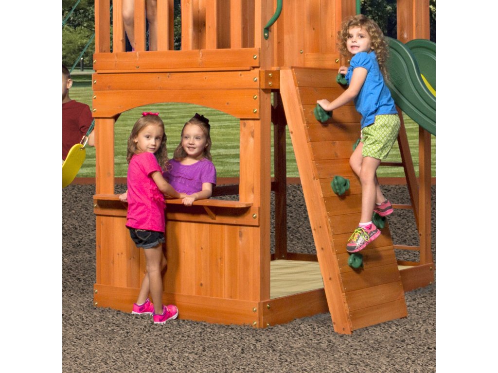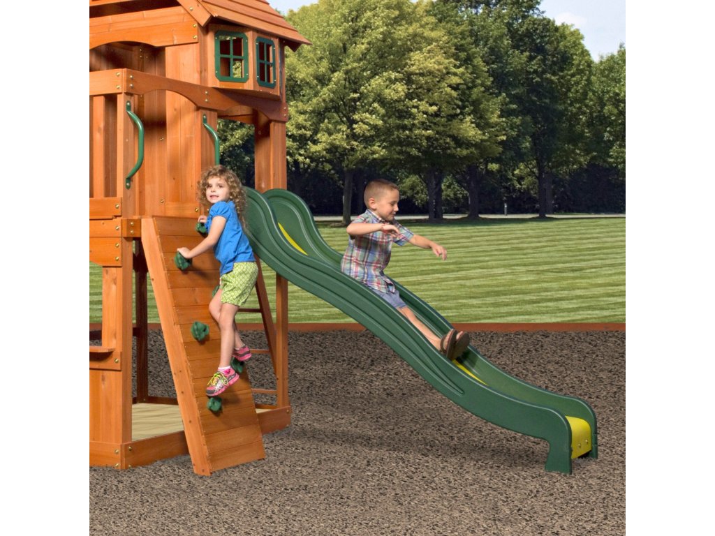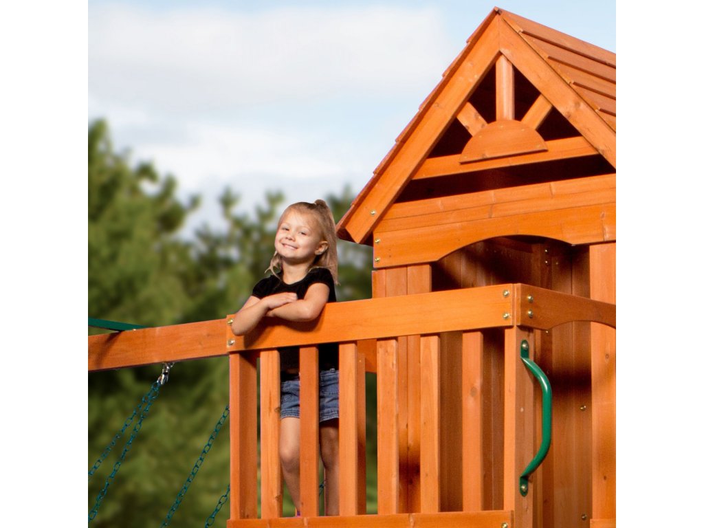 Obrovské detské ihrisko Sunnydale Backyard Discovery je skvelým doplnkom každej záhrady. Odteraz bude zábava v záhrade nekonečná! Drevené detské ihrisko Atlantic je dokonalým centrom aktivít, ktoré ponúka množstvo možností na hranie. Jeho súčasťou je plošina v podobe domčeka na koloch s dlhou zvlnenou šmýkačkou, na ktorú sa dá dostať po rebríku alebo po lezeckej stene, ktorá má v hornej časti úchyty pre bezpečnosť. Celé je to zastrešené krásnou drevenou strechou, ktorá vášmu dieťaťu poskytne úkryt pred slnkom. Ďalším prvkom je balkón, ktorý sa nachádza na hornej úrovni ihriska.