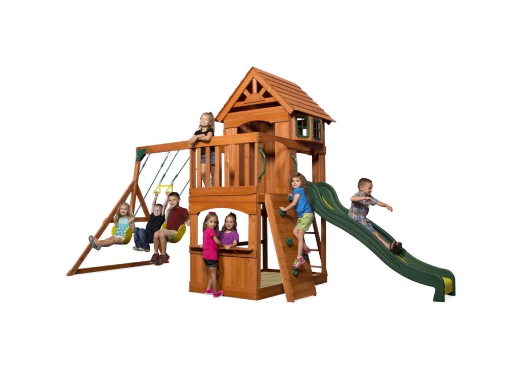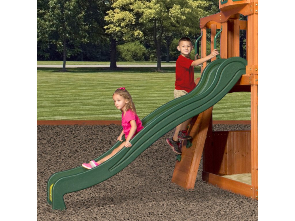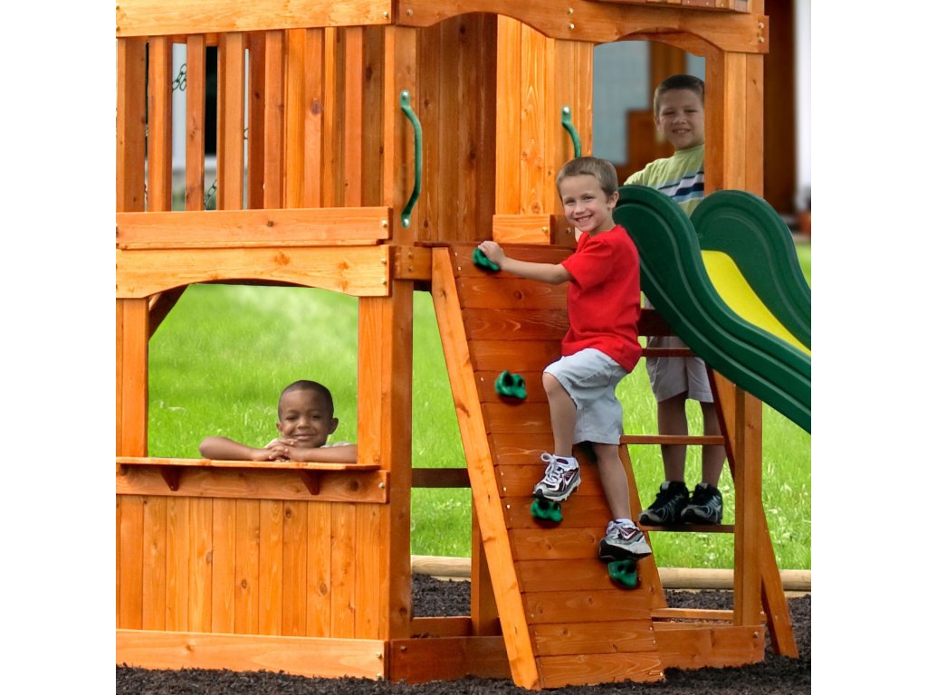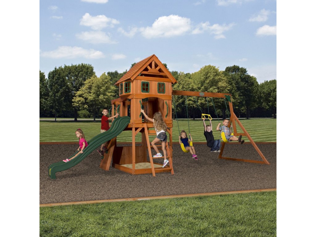 Obrovské detské ihrisko Sunnydale Backyard Discovery je skvelým doplnkom každej záhrady. Odteraz bude zábava v záhrade nekonečná! Drevené detské ihrisko Atlantic je dokonalým centrom aktivít, ktoré ponúka množstvo možností na hranie. Jeho súčasťou je plošina v podobe domčeka na koloch s dlhou zvlnenou šmýkačkou, na ktorú sa dá dostať po rebríku alebo po lezeckej stene, ktorá má v hornej časti úchyty pre bezpečnosť. Celé je to zastrešené krásnou drevenou strechou, ktorá vášmu dieťaťu poskytne úkryt pred slnkom. Ďalším prvkom je balkón, ktorý sa nachádza na hornej úrovni ihriska.