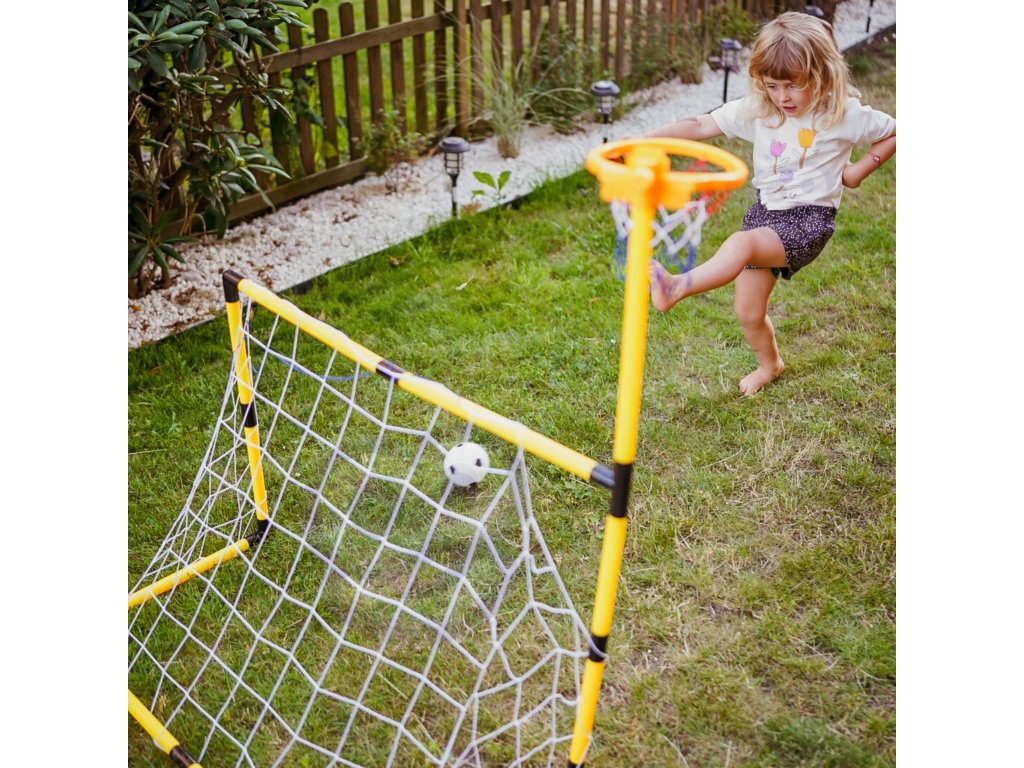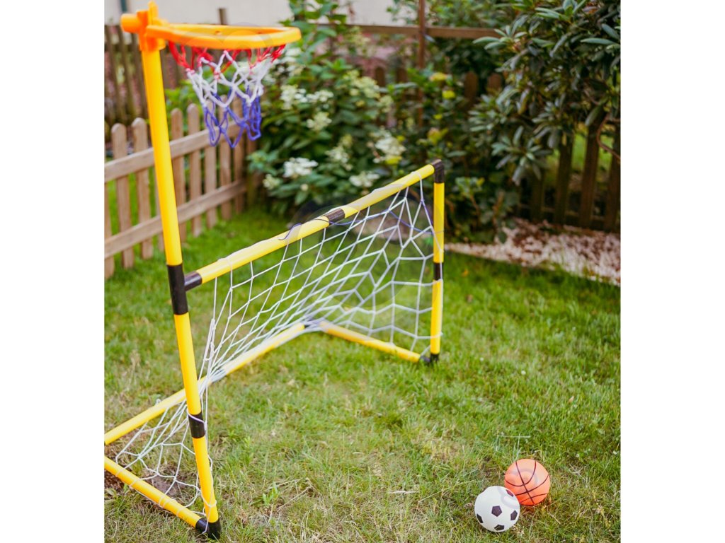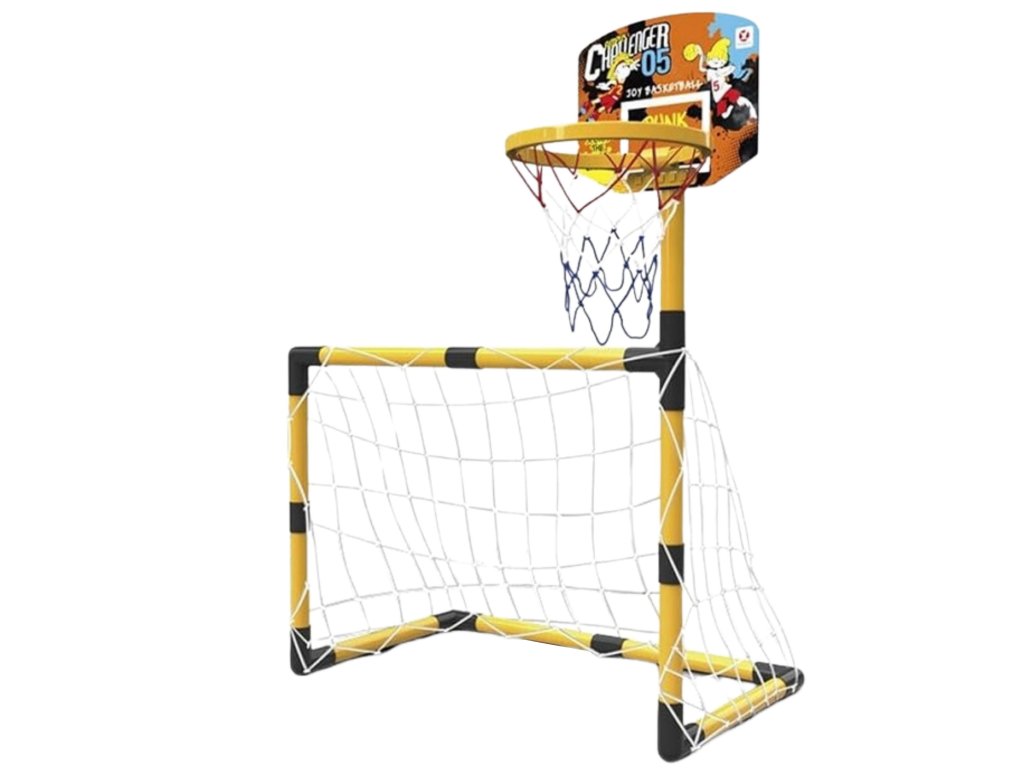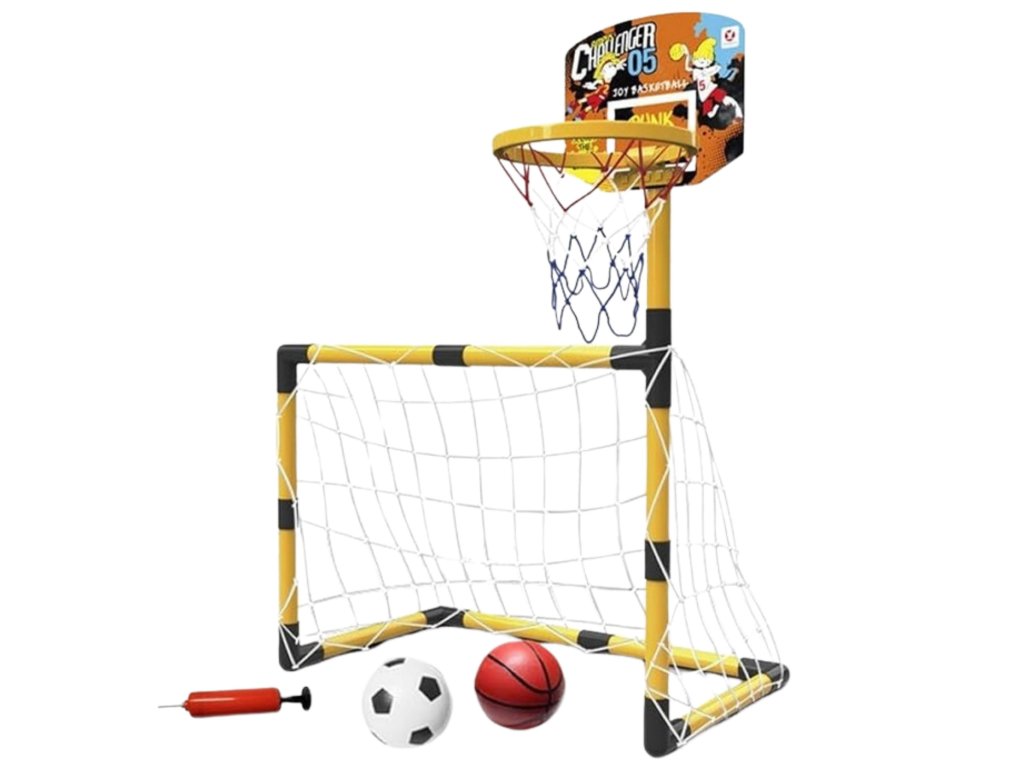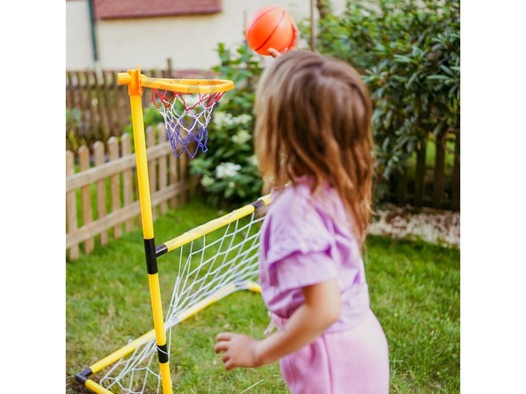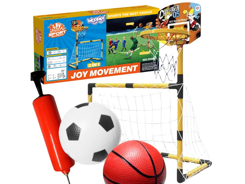 Súprava 2 v 1 z adresy Woopie je vysokokvalitná sada, ktorá kombinuje 2 športy - futbal a basketbal. Športová súprava pre deti je skvelým spôsobom, ako podporiť fyzickú aktivitu najmenších. Montáž je jednoduchá, astabilná konštrukcia. Materiály použité pri výrobe sú vhodné pre deti. Výška basketbalovej lopty je 125 cm, takže je ideálna pre najmenších hráčov.Súpravu možno používať v interiéri aj exteriéri, aby si vaše dieťa mohlo užívať aktívnu činnosť bez ohľadu na počasie.