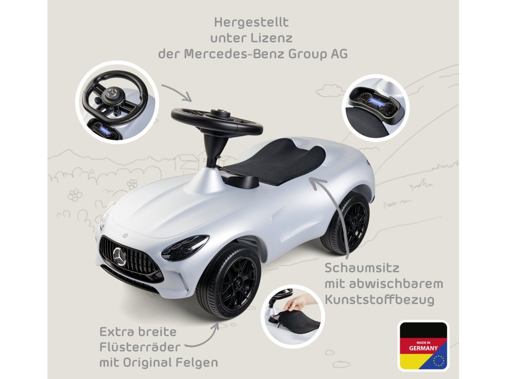 BIG Bobby Car Mercedes AMG GT Rider je unikátna jazdenka vytvorená v spolupráci so spoločnosťou Mercedes-AMG GmbH, aby sa aj najmenší fanúšikovia automobilov mohli cítiť ako za volantom skutočného športového vozidla. Vďaka štýlovému dizajnu, pozornosti venovanej detailom a pohodliu pri jazde je ideálnou voľbou pre malých vodičov od 18 mesiacov!