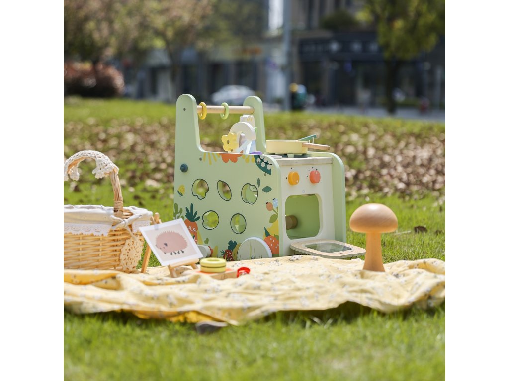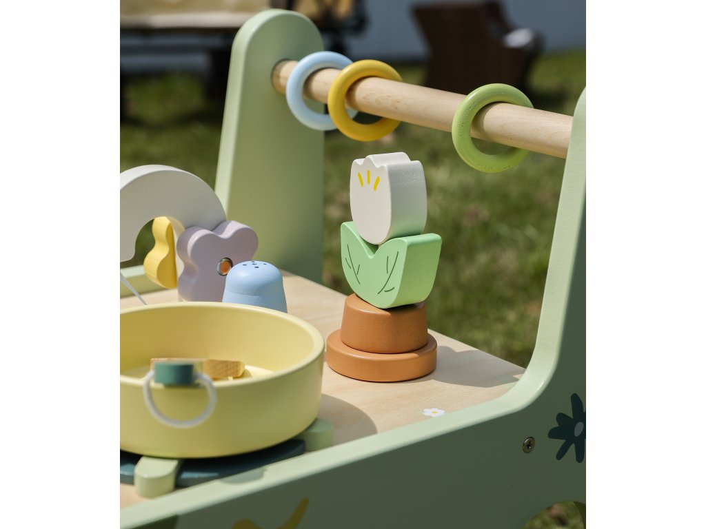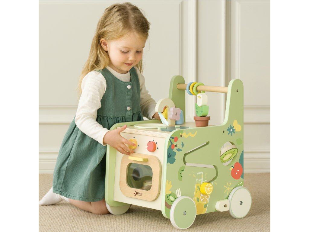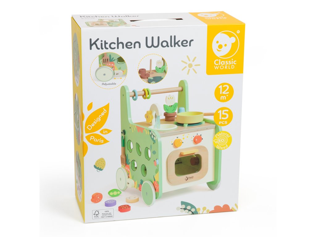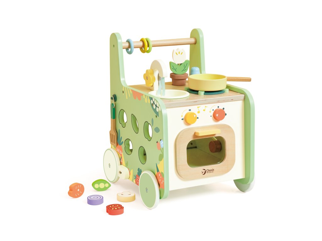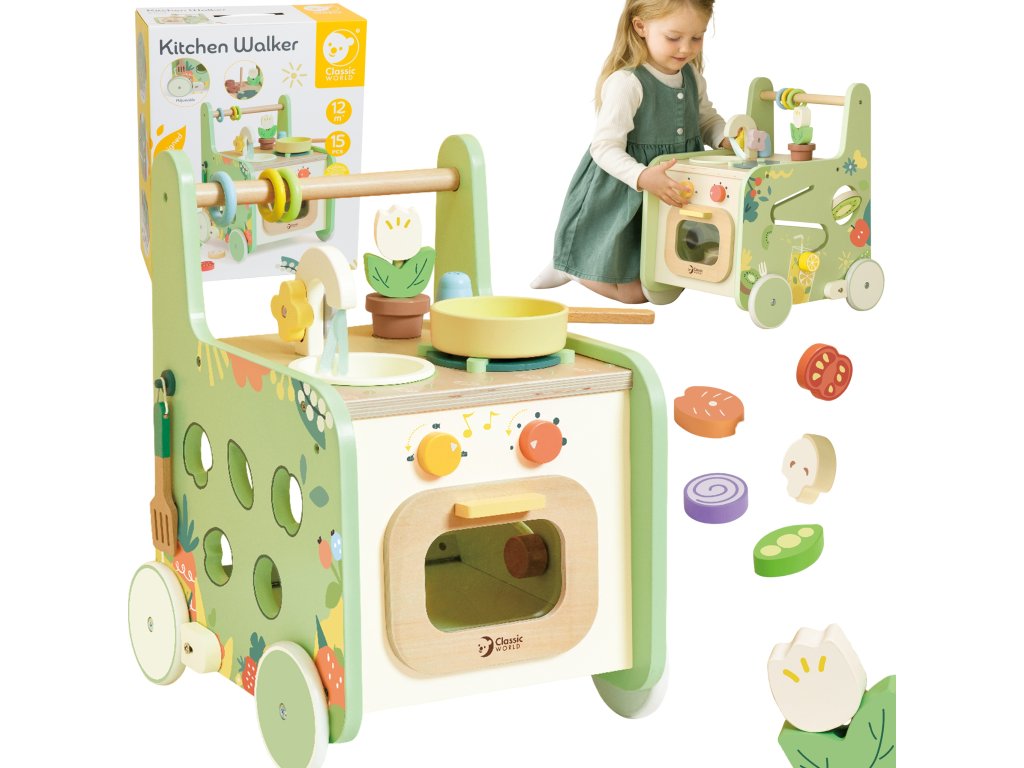 Drevený kuchynský tlačiak od značkyKlasický svet je ideálna hračka, ktorárastie spolu s vaším dieťatkom! Je to viac než len obyčajné chodítko, je to mobilná kuchynka plná rôznych aktivít, ktoré nielen podporujú učenie sa chodiť, ale aj rozvíjajú zmysly a manuálne zručnosti dieťaťa. Batoľatá sa môžu hrať na malých kuchárov, otáčať voličmi, smažiť na panvici a umývať zeleninu v dreze. Chodítko má stabilnú konštrukciu, ktorá poskytuje stabilnú oporu pri prvých krokoch a zároveň umožňuje dieťaťu bezpečne skúmať rôzne činnosti.