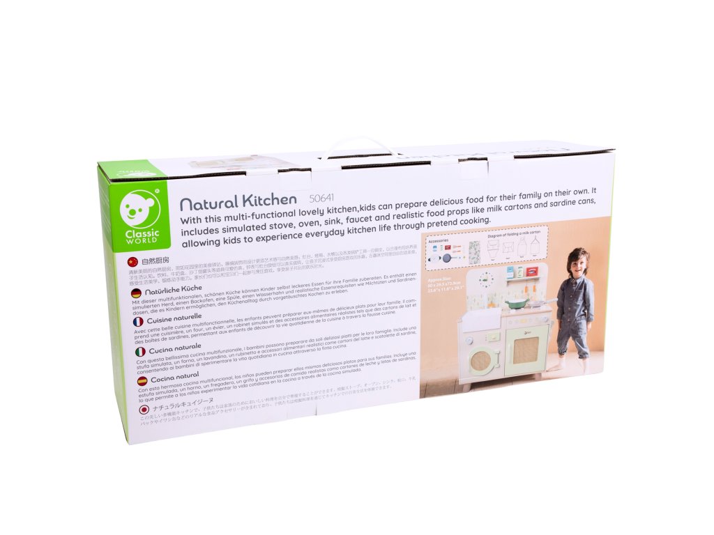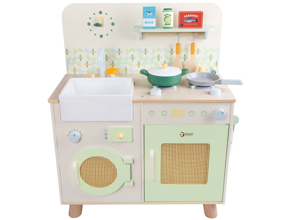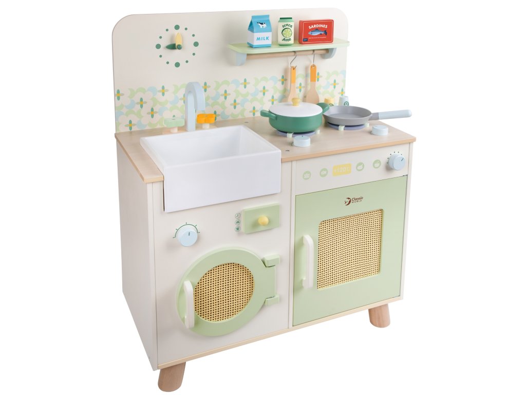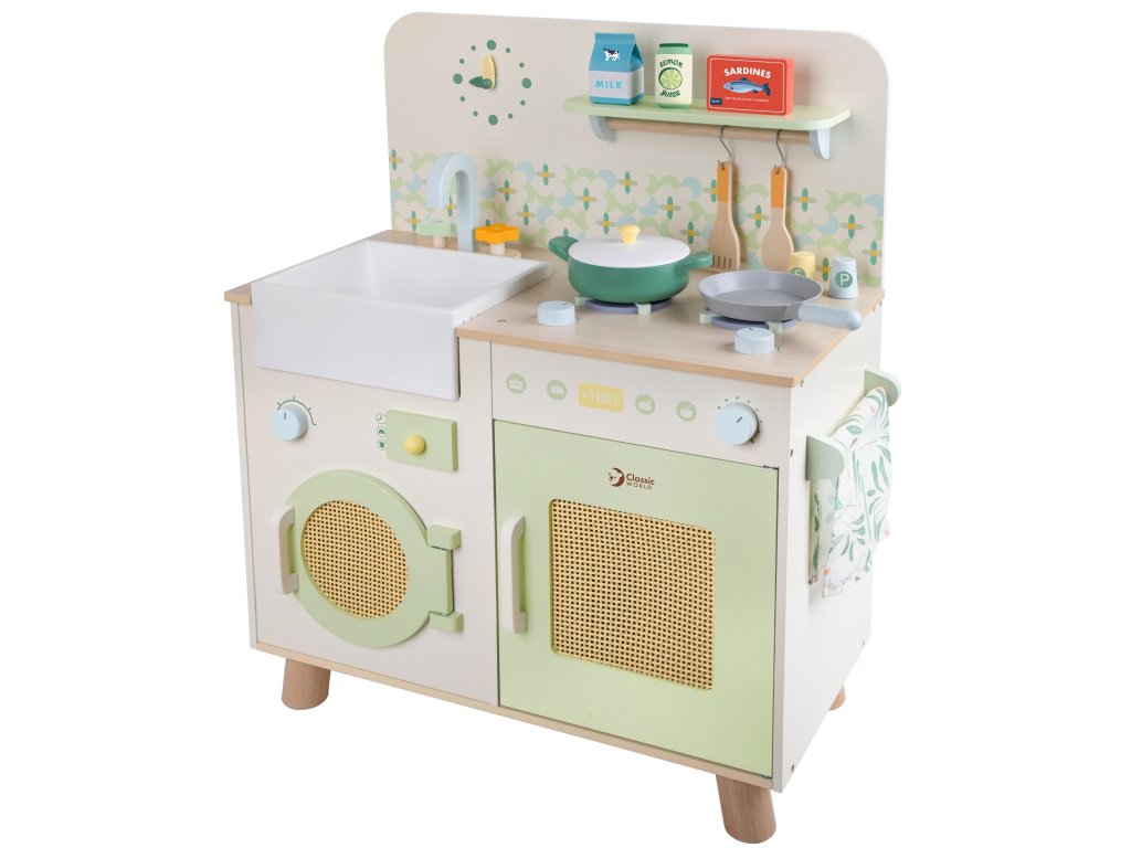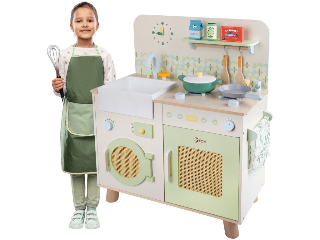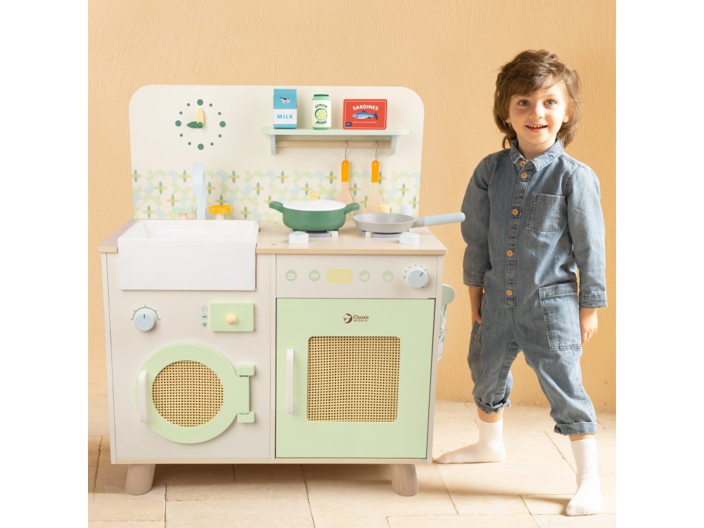 Táto štýlová multifunkčná kuchynka je ideálnym miestom pre kulinárske dobrodružstvá detí. Prírodné farby, realistické detaily a doplnky robia hru ešte pútavejšou. Deti si môžu zahrať každodenné situácie a zároveň rozvíjať kreativitu, samostatnosť a manuálne zručnosti.