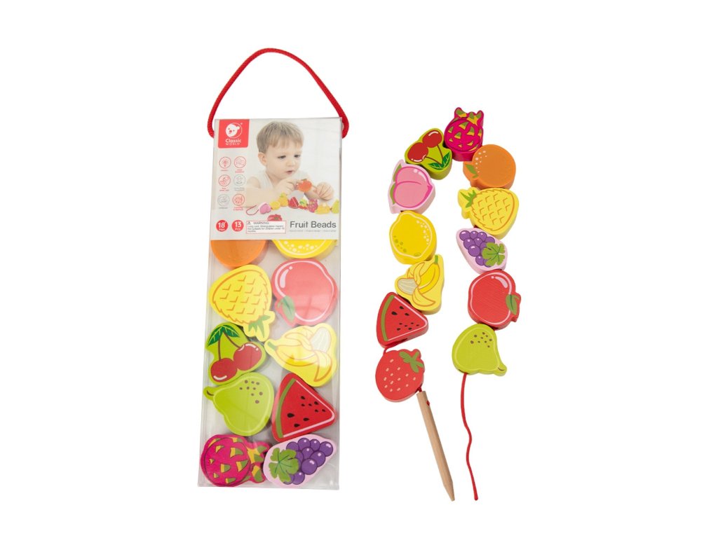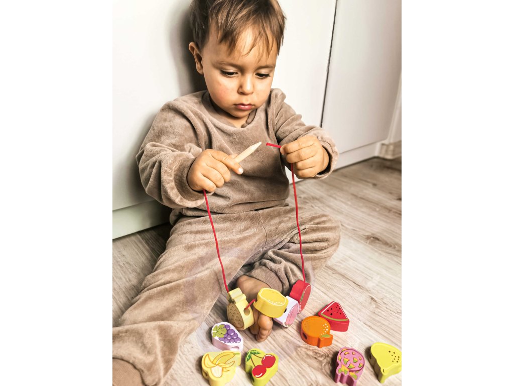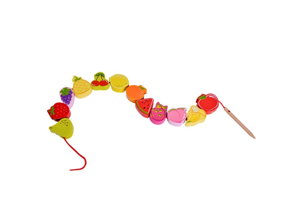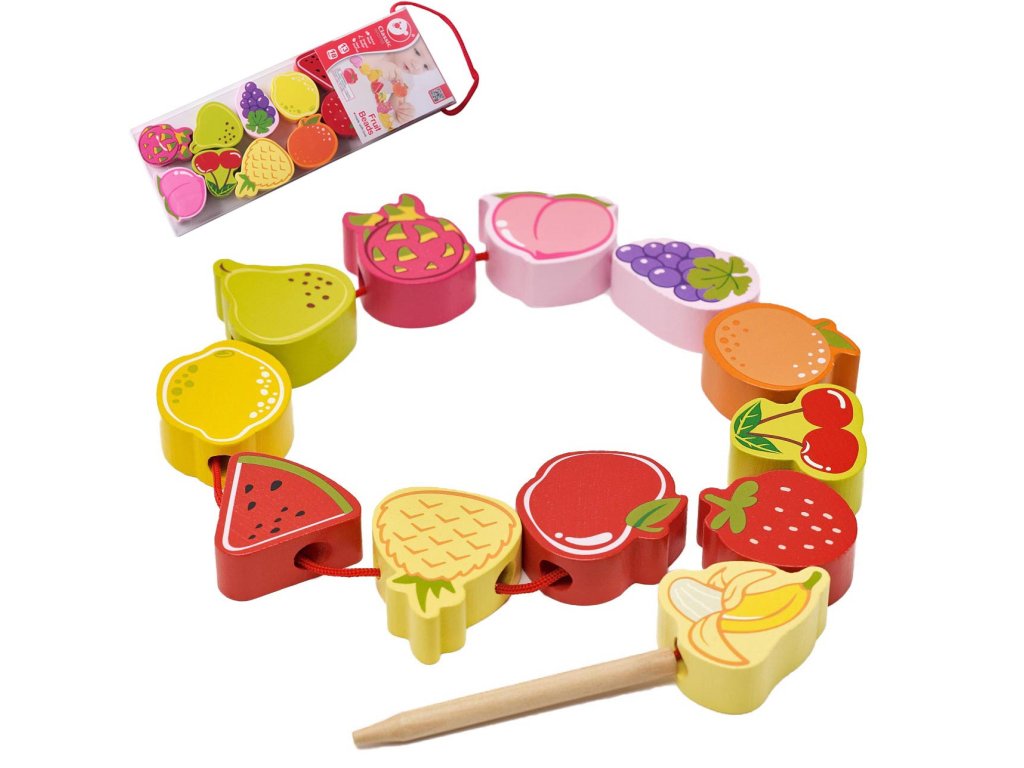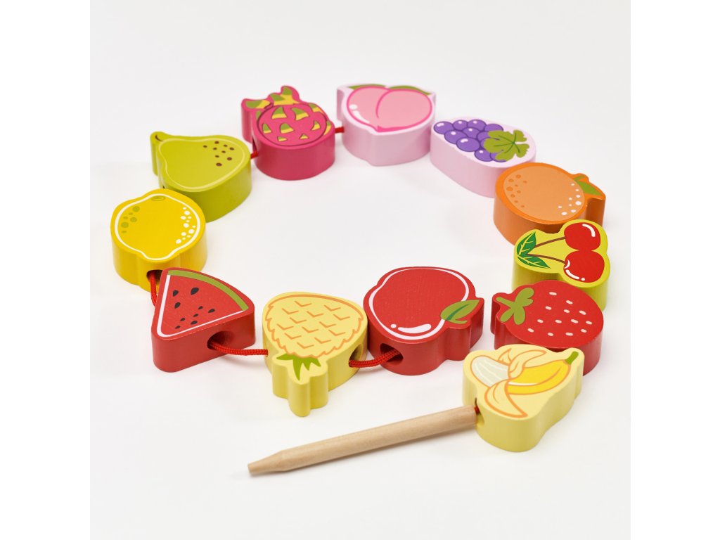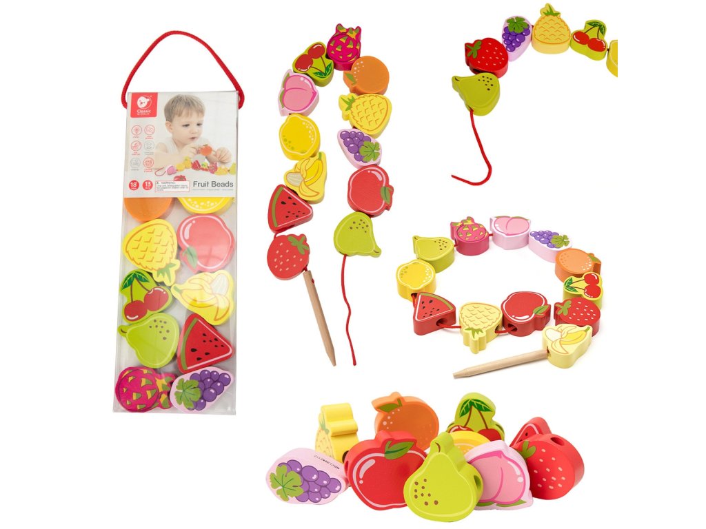 Drevený stroj na navliekanie nití s ovocím od renomovanej značkyKlasický svetje ideálna hračka pre vašich najmladších objaviteľov. Súprava sa skladá z12 drevených kociek v tvare ovocia,ktoré sú navlečené na šnúrke cez drevenú ihlu. Vďaka tejto hračke dieťarozvíja ich motorické zručnosti a obohacuje ich predstavivosť. Cieľom hračky je tiežnaučiť dieťa názvy ovocia a jeho farby.Súprava stimulujezvedavosť batoľaťa a poskytne mu hodiny zábavybloky môžete ľubovoľne rozmiestniť.