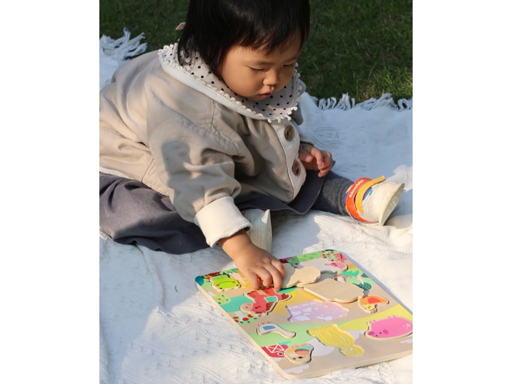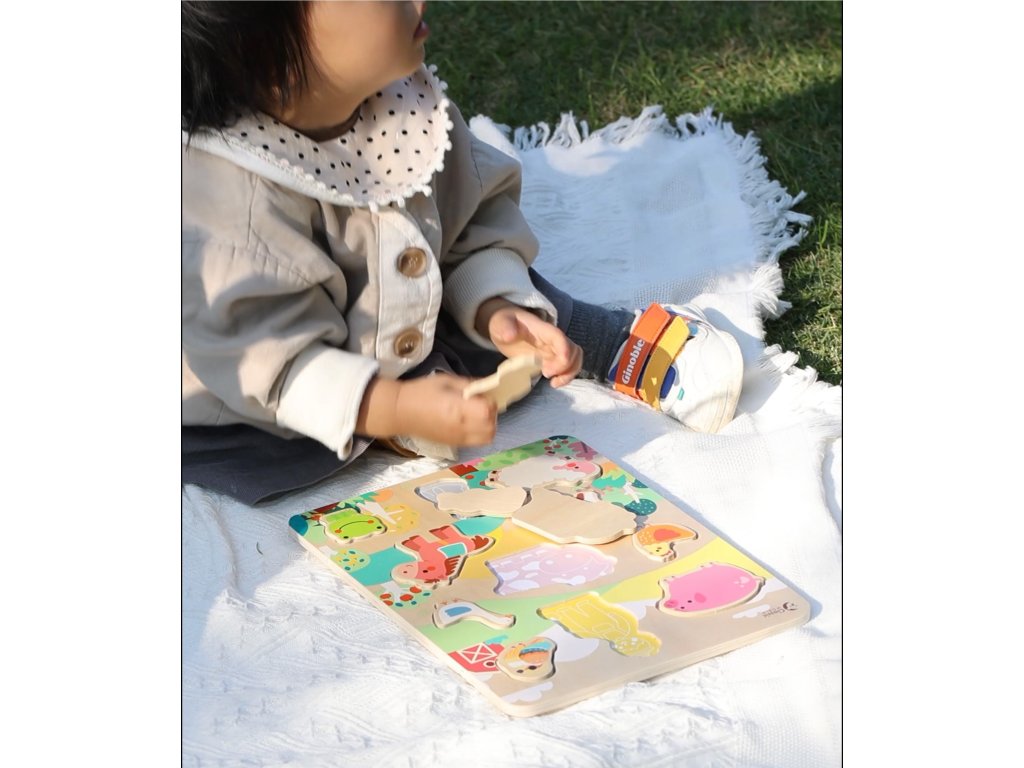 Farebná skladačka s motívom farmy obsahuje drevené figúrky zvierat, ktoré sa dajú priradiť k doske. Je vyrobená z bezpečného dreva, rozvíja manuálne zručnosti, koordináciu ruka-oko, predstavivosť a učí rozpoznávať zvieratá.