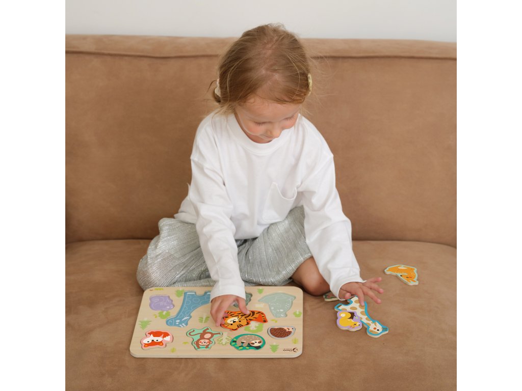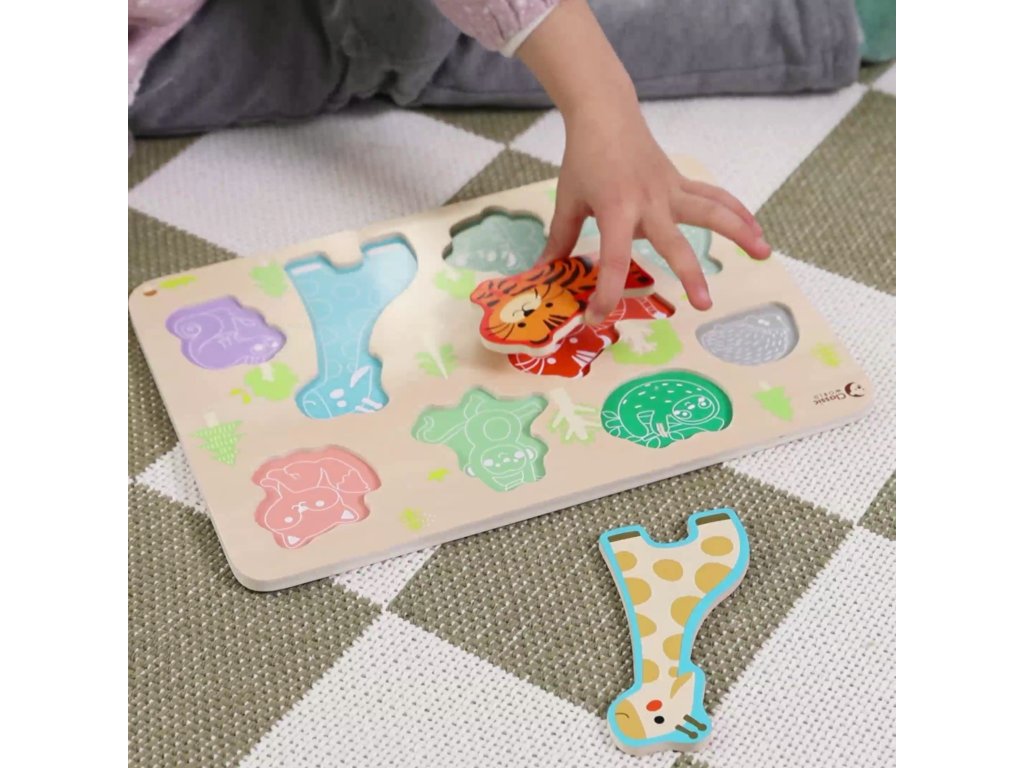 Drevené puzzle so zvieratkami je vzdelávacia hračka pre deti. Batoľa priraďuje farebné zvieratká, ako napríklad žirafu alebo líšku, na miesta na doske s lesnými motívmi.