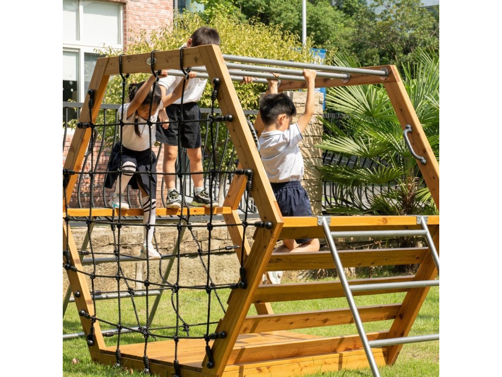 Táto konštrukcianavrhnuté s ohľadom na deti, ktoré milujú lezenie, visenie, plazenie a vytváranie vlastných prekážkových dráh. Ideálne do záhrady, detskej izby alebo rekreačnej oblasti!Šesťuholníkový tvar konštrukcie je pútavý a poskytuje stabilitu, zatiaľ čo rôzne prvky podporujú všestrannú aktivitu.