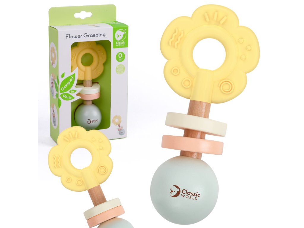 CLASSIC WORLD Pastelové drevené hrkálky 2v1 Kvetina 0+
