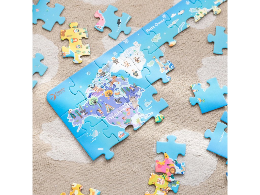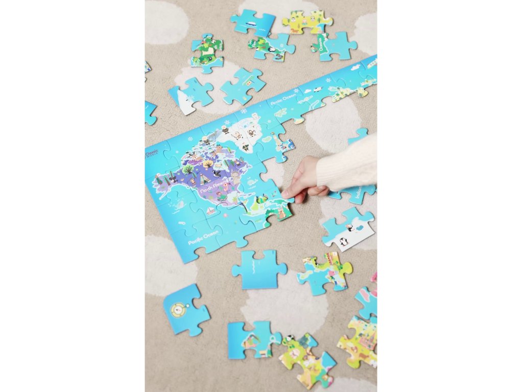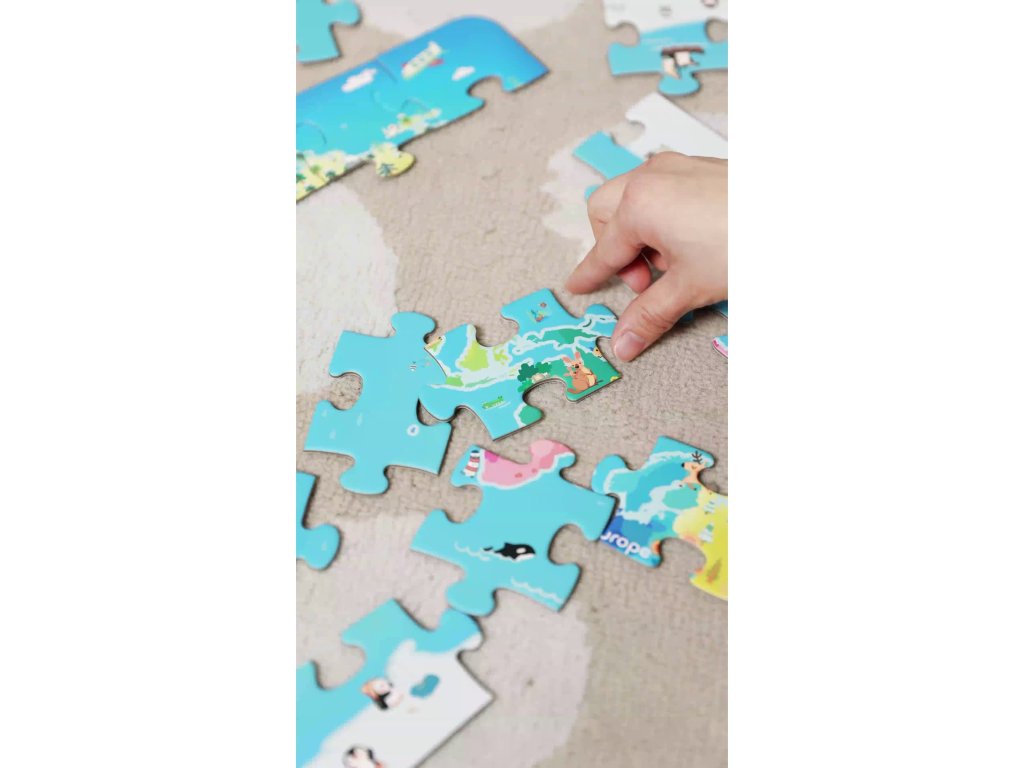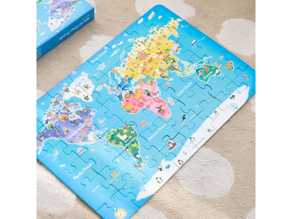 Farebné puzzle s mapou sveta rozvíjajú pozorovacie schopnosti, manuálnu zručnosť, predstavivosť a geografické znalosti. Dieťa sa zaujímavým a interaktívnym spôsobom dozvie o kontinentoch, oceánoch a rozmanitosti našej zemegule.