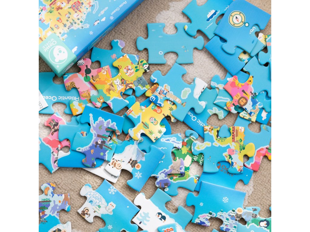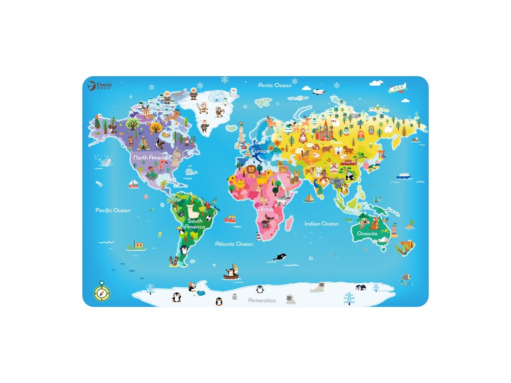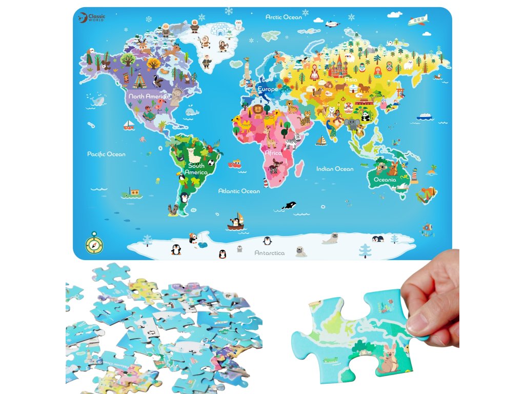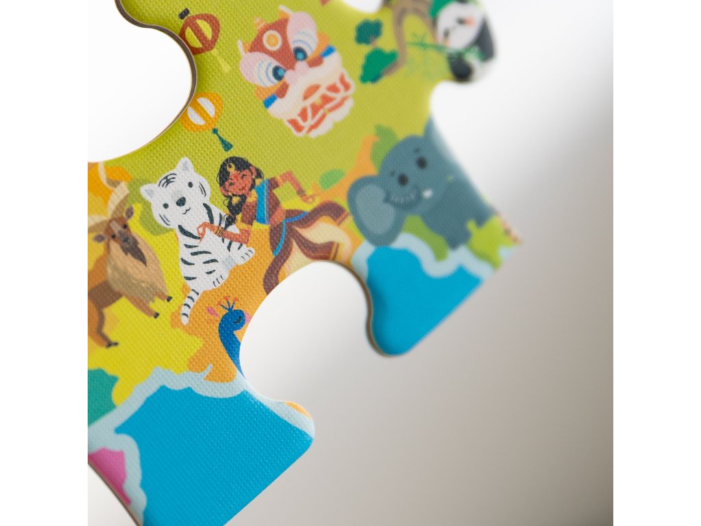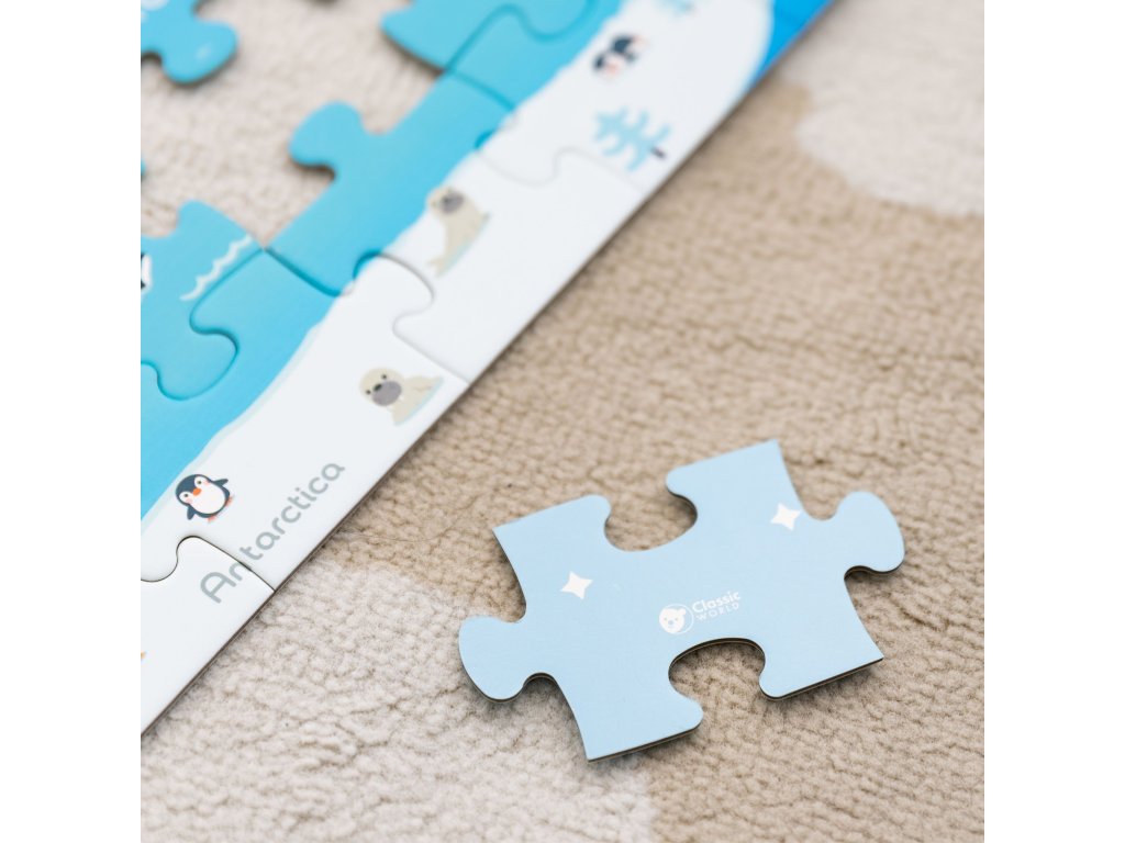 Farebné puzzle s mapou sveta rozvíjajú pozorovacie schopnosti, manuálnu zručnosť, predstavivosť a geografické znalosti. Dieťa sa zaujímavým a interaktívnym spôsobom dozvie o kontinentoch, oceánoch a rozmanitosti našej zemegule.