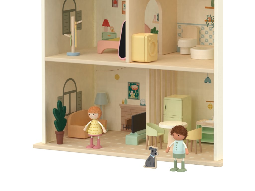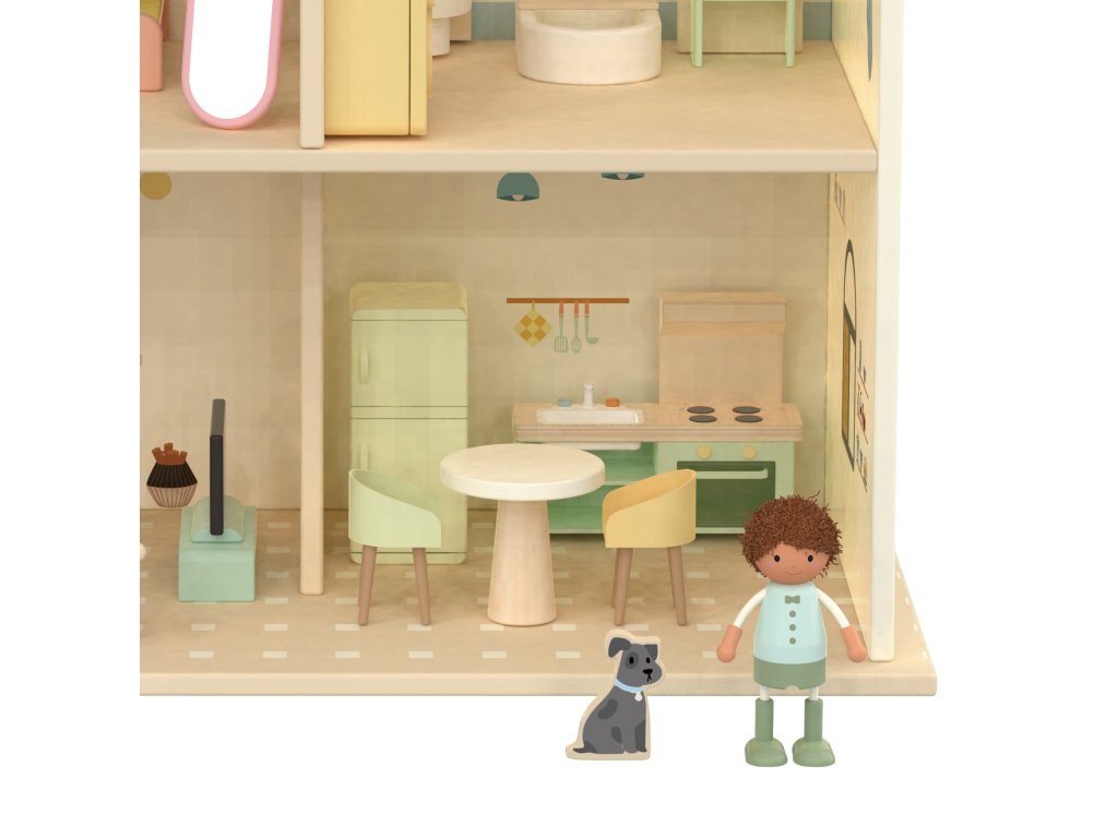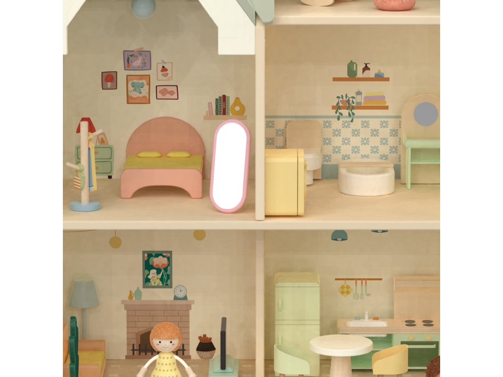 Tento krásny dvojpodlažný domček s podkrovím je skutočnou lahôdkou pre malých milovníkov kreatívnej hry. Je plný šarmu, farieb a funkčných detailov a umožňuje deťom vytvárať vlastné príbehy a scény z každodenného života. Starostlivo vyrobený nábytok, prepracované interiéry a priložené figúrky podporujú hodiny zábavy pri hraní rolí.