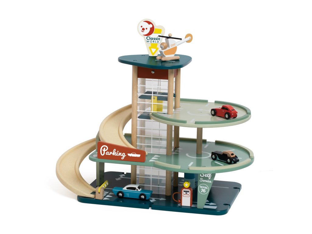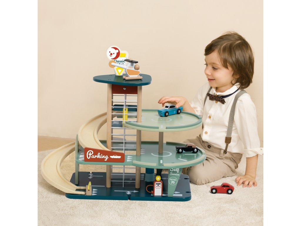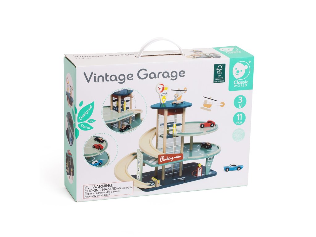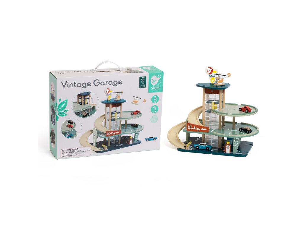 Vintage drevená garáž od značkyKLASICKÝ SVETje jedinečná hračka, ktorá vaše dieťa prenesie do zlatých čias motorizmu 50. rokov minulého storočia.Tento štýlový,trojpodlažné parkovisko bola vyrobená z najkvalitnejšíchdrevo FSC a inovatívne bioplastové prvky, vďaka čomu je bezpečnou a ekologickou voľbou. Súprava ponúka množstvo aktivít vrátanefunkčný výťah, autoumyváreň, výdajňa pohonných hmôt a pristávacia plocha pre vrtuľníky, ktoré poskytujú hodiny tvorivej zábavy. Vďaka možnosti kombinovať základňu s ďalšími dráhami sa Vintage Garage stane centrom rozšíreného sveta malého fanúšika áut.