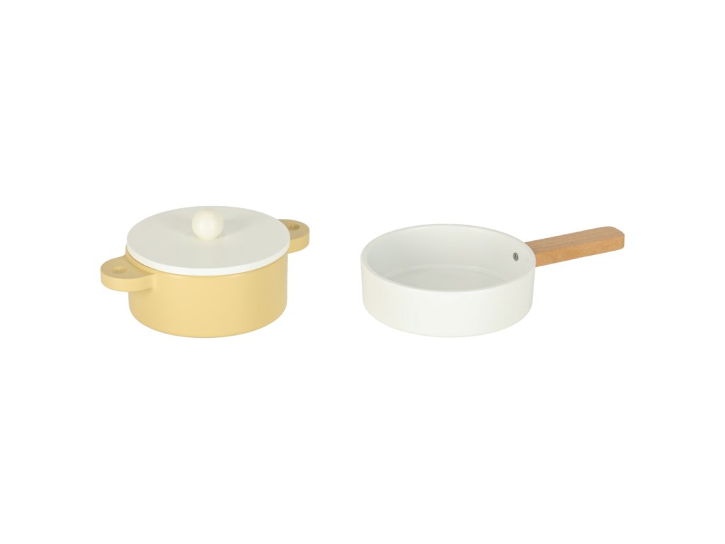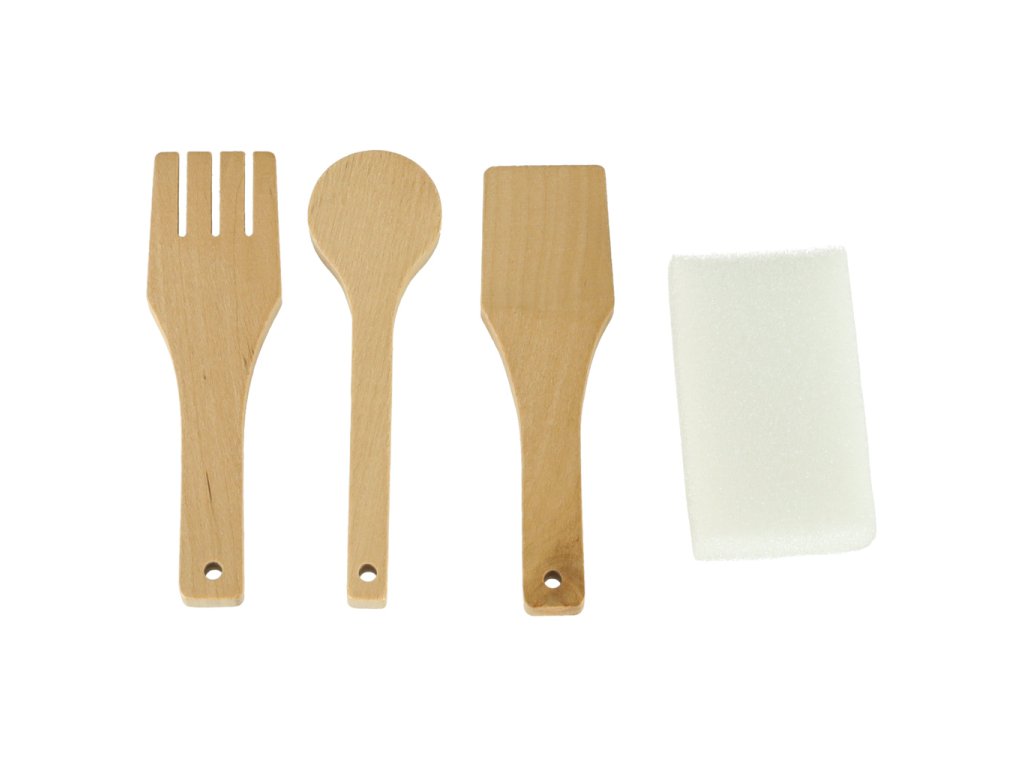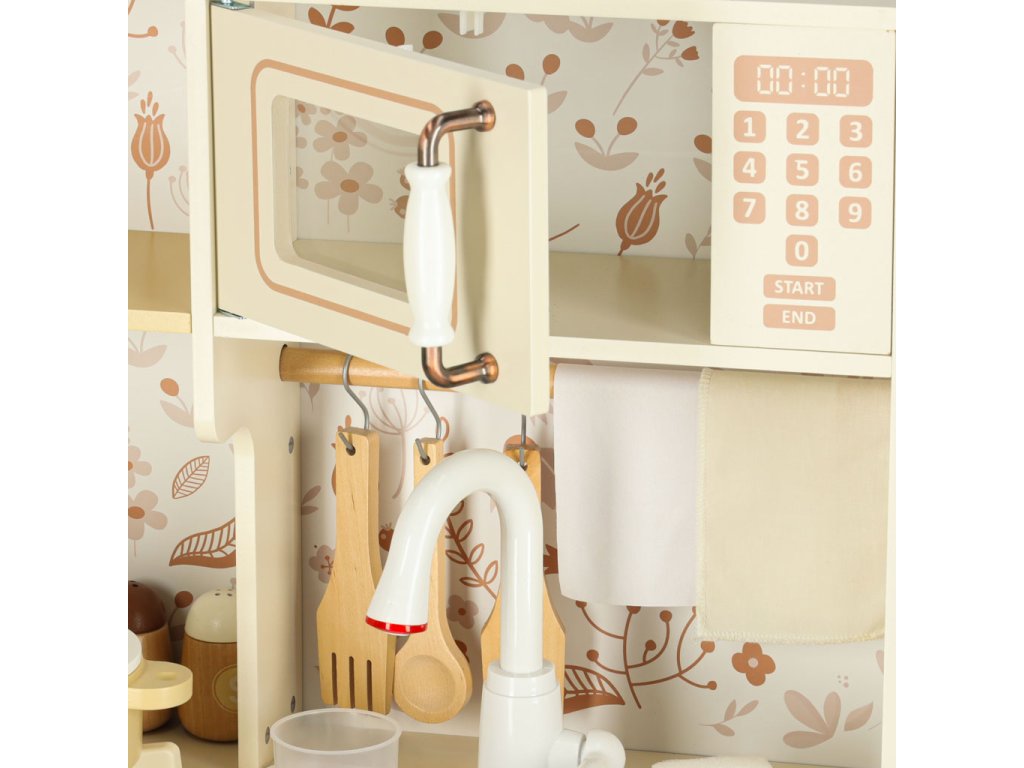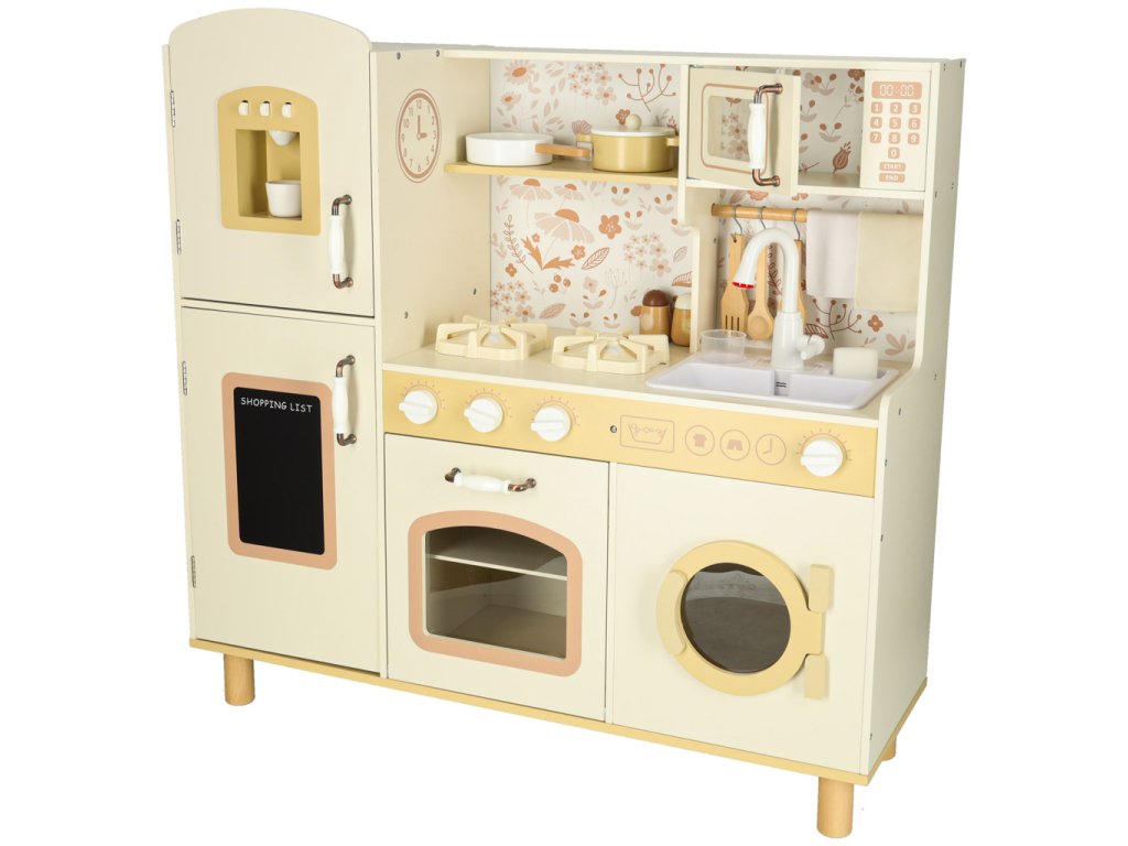 Súčasťou drevenej detskej kuchynky je príslušenstvo, ako napríkladšálka, hrniec, panvica, kuchynskéšpachtle, soľnička a korenička, ako ajpráčka, mikrovlnná rúra,rúra, drez s funkciou vylievania a úložné skrinky. Vďaka tomu sa tvorivá hra stane každodennou činnosťou adieťa sa naučí voľne sa pohybovať a udržiavať svoj kuchynský priestor uprataný.