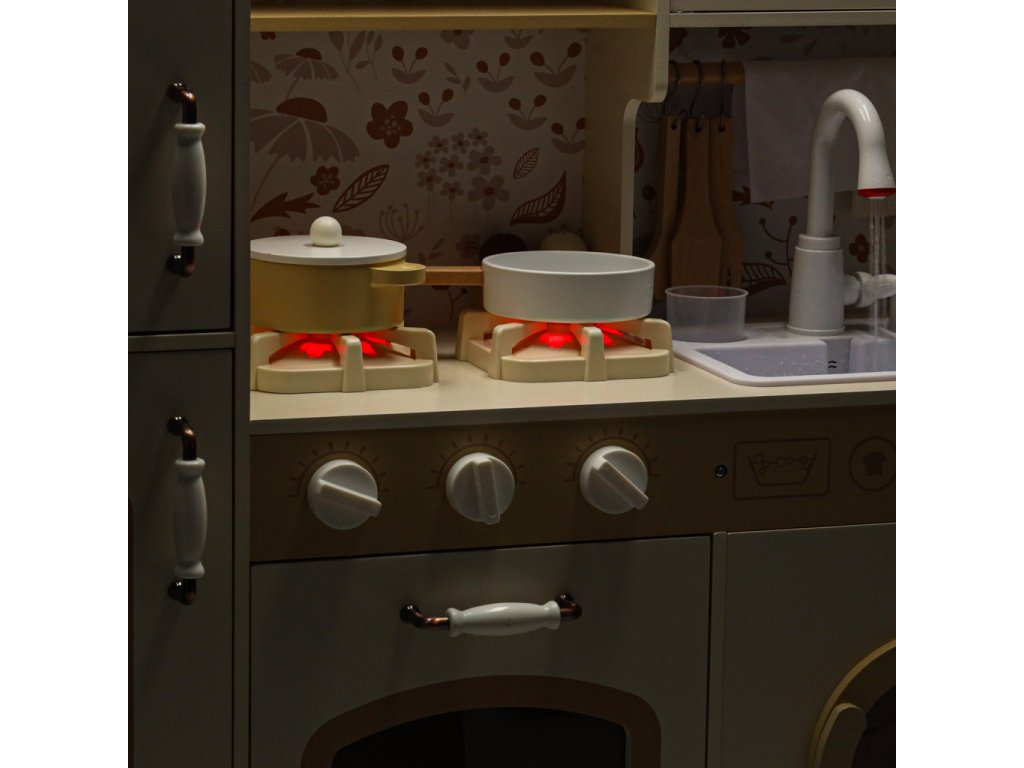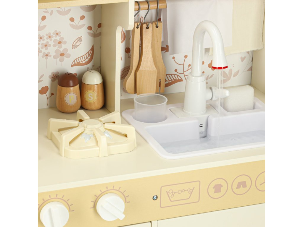 ● Drevená kuchynka je vybavená interaktívnymi prvkami - svietiacimi horákmi, realistickými zvukmi pri varení, kohútikom s prúdom vody, vďaka čomu sa hra stáva realistickým dobrodružstvom v reálnom živote