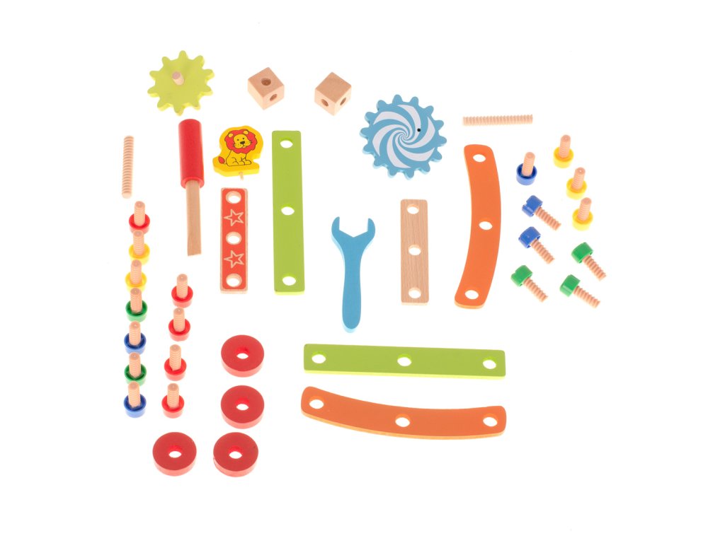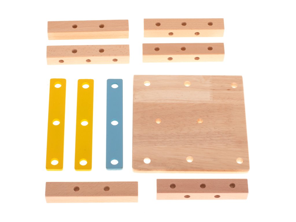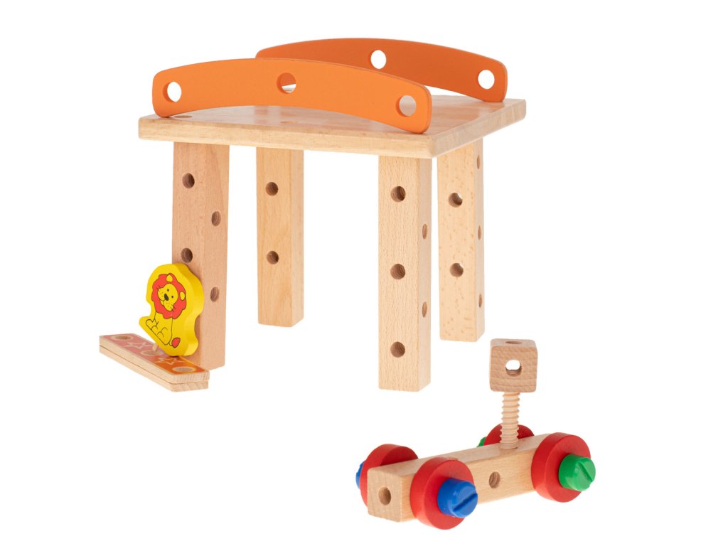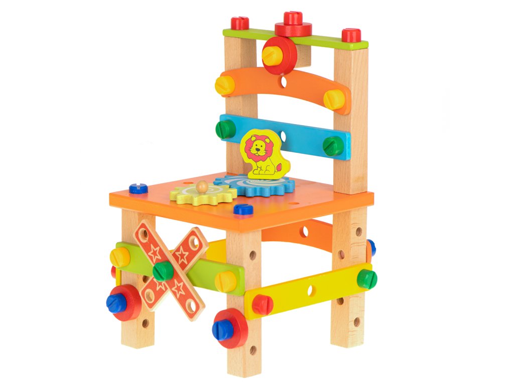 Úžasná farebná drevená hračka, ktorá umožňuje postaviť dielňu s funkciou stoličky a ďalšie stavby podľa vlastného výberu.