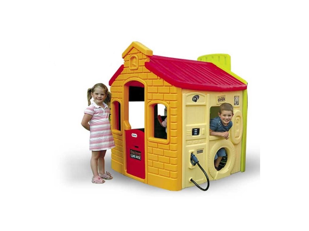 Plastový záhradný domček Americká spoločnosť Little Tikes ponúka nekonečnú interaktívnu zábavu. Štyri rôzne motívy na stenách domčeka podnietia kreatívnu a nápaditú hru. Stena so športovými motívmi je vybavená obručou, loptou a diskom na hádzanie loptičiek. Stena s benzínovou pumpou je vybavená výdajným stojanom na palivo, telefónom a špeciálne tvarovanými detailmi. Stena s obchodom s potravinami / barom rýchleho občerstvenia je vybavená pojazdným oknom s okenicami, pokladňou, policou vo vnútri domčeka a tvarovanými doplnkami. Škola je vybavená stolom, tabuľou, abecedou a číslami. Tieto plastové domčeky majú interiér vybavený sporákom, dielňou a pokladňou, ktoré zodpovedajú štýlu hry. Domček má dvojité steny, takže je chránený pred škodlivými účinkami slnka a počasia a je odolný aj voči prudkým nárazom.