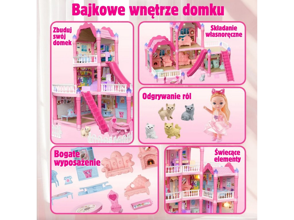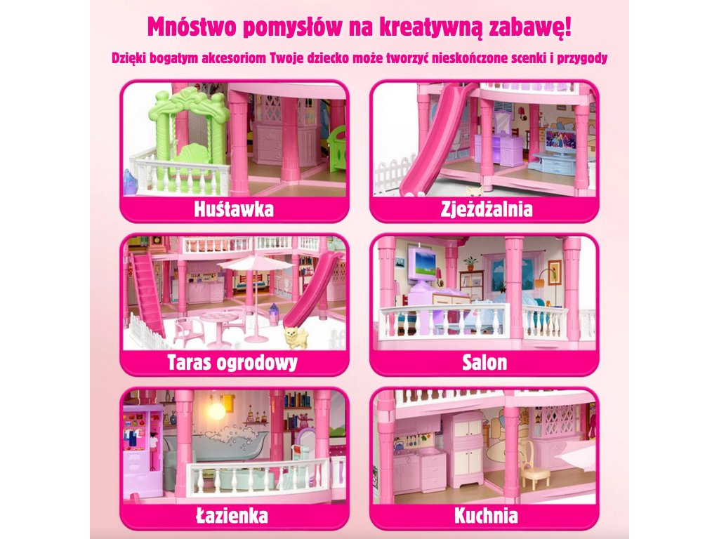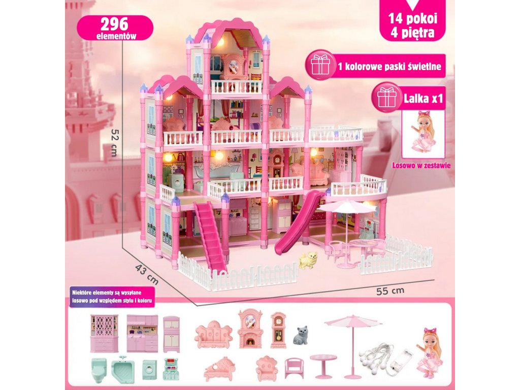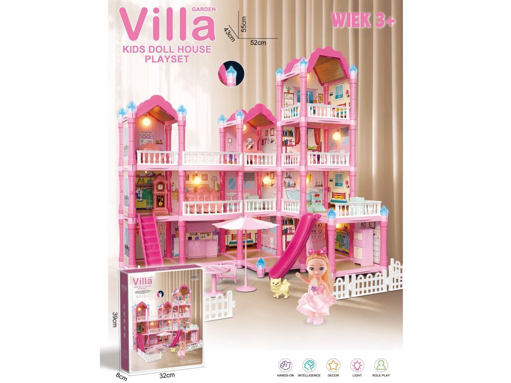 Zoznámte sa s úžasnými,trojposchodový domček pre bábiky s ružovou strechou, ktorá sa stane obľúbeným ihriskom vášho dieťaťa! Tentokrásna vila pôsobivých rozmerov bol navrhnutý spozornosť k detailomvďaka čomu vyzerá ako skutočný dom. Súprava obsahujeaž 296 prvkov vrátane rozsiahleho interiéru akrásny nábytokdom je vybavený špeciálnou súpravou, ktorá umožňuje malej dizajnérke, aby si sama zariadila každú miestnosťnočné osvetleniečo mu dodáva magický charakter. Je to ideálna hračka na rozvojkreativita, predstavivosť a manuálne zručnosti. Súprava obsahuje všetko, čo potrebujete na vytvorenie vysnívaného domčeka pre bábiky: od nábytku cez doplnky až po rozkošný domček pre bábiky. Hra na domček ešte nikdy nebola taká realistická a pútavá!Šmykľavka, schody a terasa sú ďalšie prvky, ktoré hru spestria a umožnia odohrať viacero scenárov. Vďaka robustnej konštrukcii domček poskytuje hodiny fantastickej a bezpečnej hry.