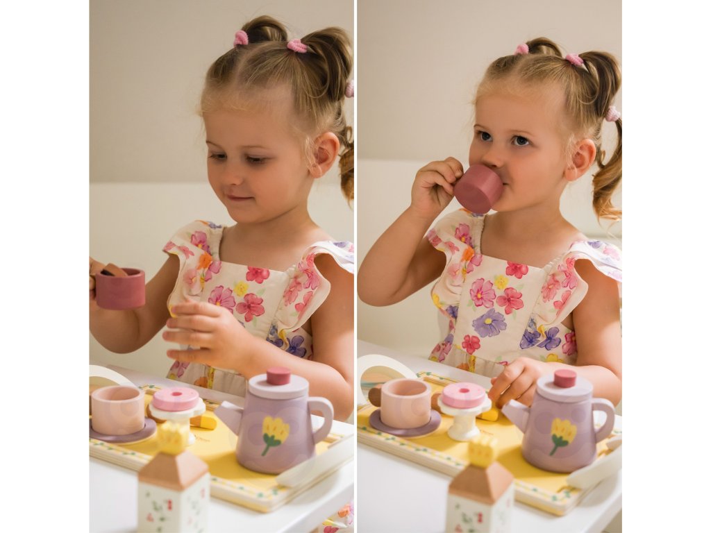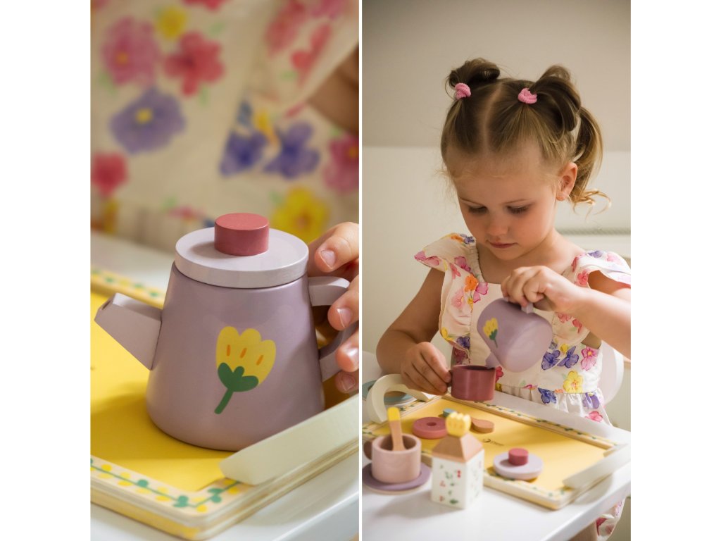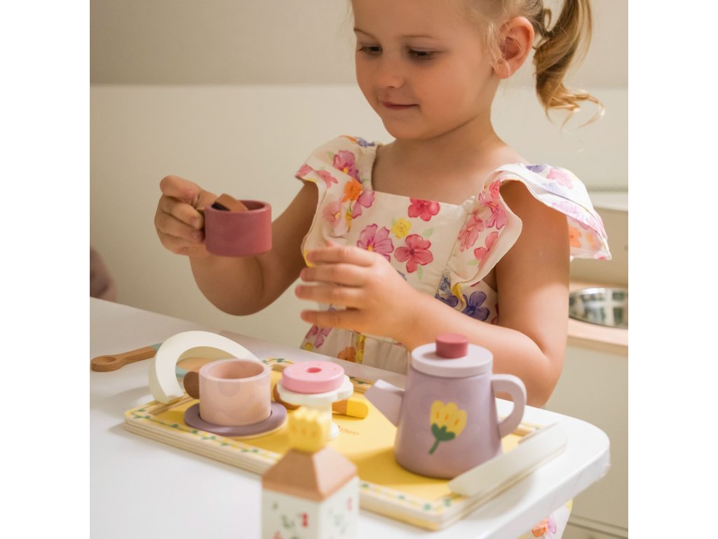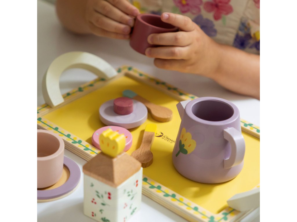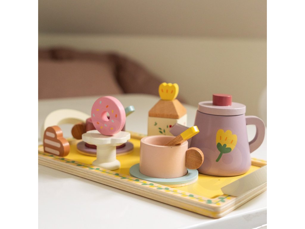 Drevené súprava na prípravu čaju a dezertov umožní vášmu dieťaťu prijímať hostí a podávaťčaj adezerty pre celú rodinu. Naučí vásspôsoby i zdieľanie zručností s ostatnými pri hre.