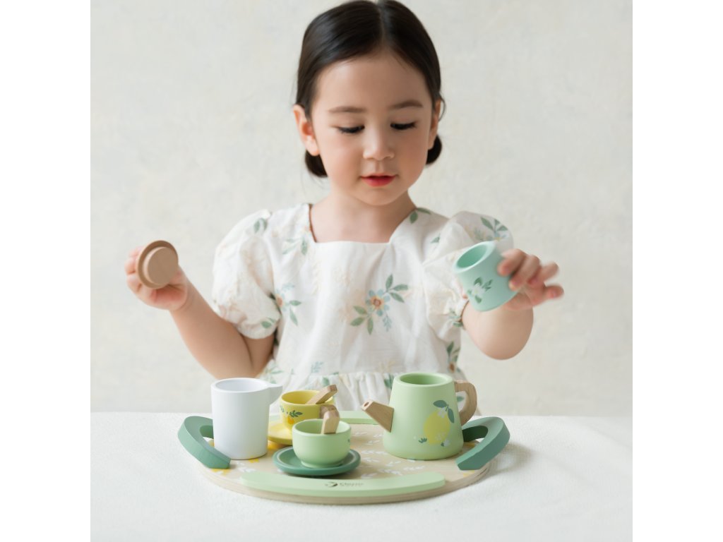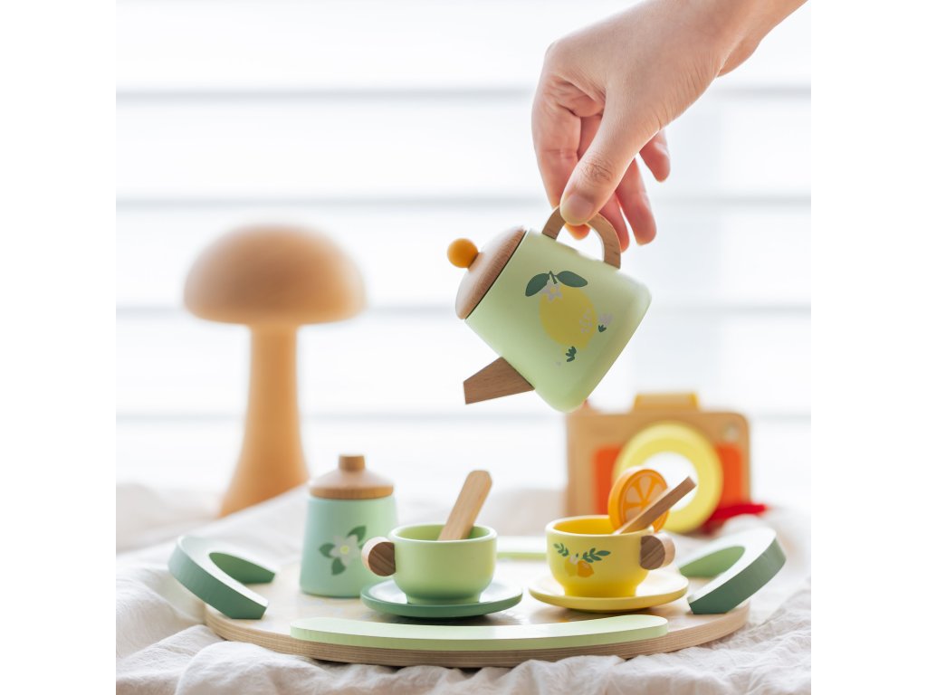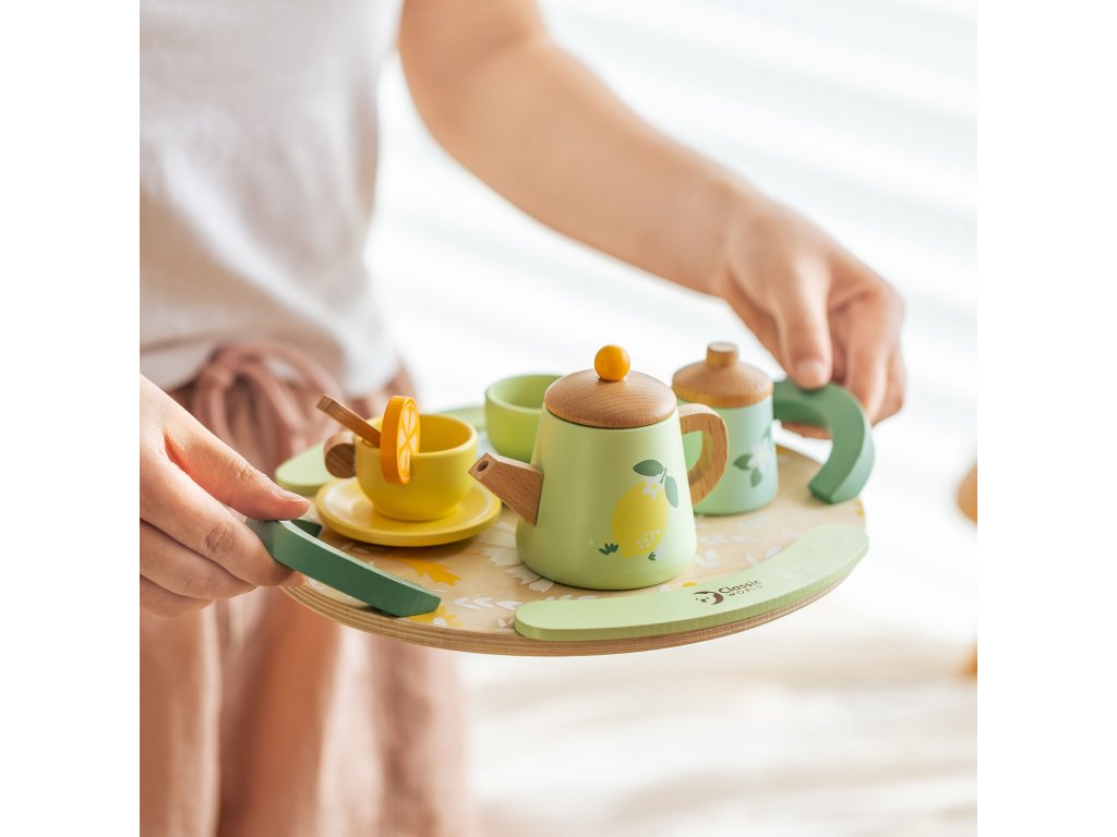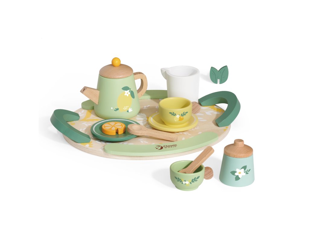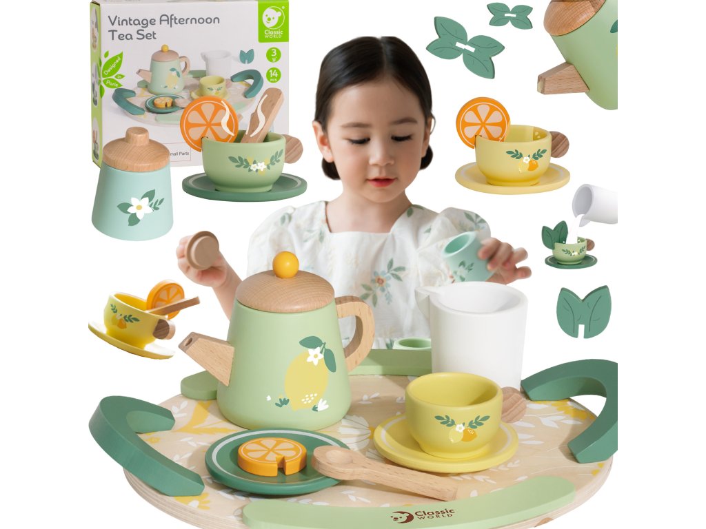 Čajová súprava od spoločnostiKlasický svet je skvelým nápadom na hodiny zábavy pre vaše dieťa. Vaše dieťatko vás nejedenkrát prekvapí a podálahodný čaj. Premeňte popoludňajší čaj na krásny rituál s rôznymi doplnkami, vrátane: dvoch šálky v rôznych farbách,kanvica a podnos v kvetoch a rôznych čajových doplnkoch. Krásnepastelové farby ešte viac povzbudí vaše dieťa k hre. Súprava bola z masívneho dreva, aby si vaše dieťatko mohlo bezpečne dopriať porciu chutného čaj.