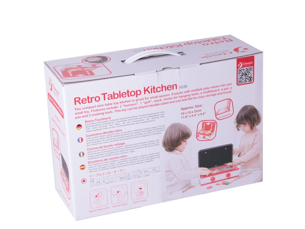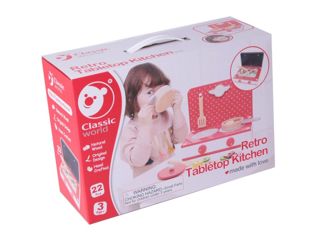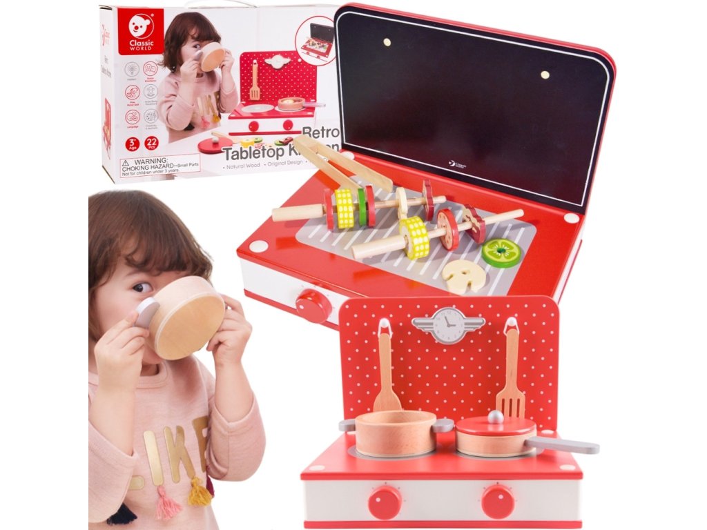 Máte domazačínajúci šampión kuchyňa? Alebo možno chce malý len nnapodobňovať mamu a otca? Tak či onak, stolová kuchyňa Klasický svet obsahuje všetko, čo potrebujete na prípravu jedla.Jasne červená farba tohtosporáky osloví všetky deti, pretože v súbore mámehrnce ipanvice, ako aj"pripravené" potraviny. Naše dieťa pripraví jedlo v krátkom čase. Okrem tohohrnce,panvice,príbory istravovanie, existuje aj súborpalice na naberanie potravín a všetky kúsky potravín majú v strede otvory.