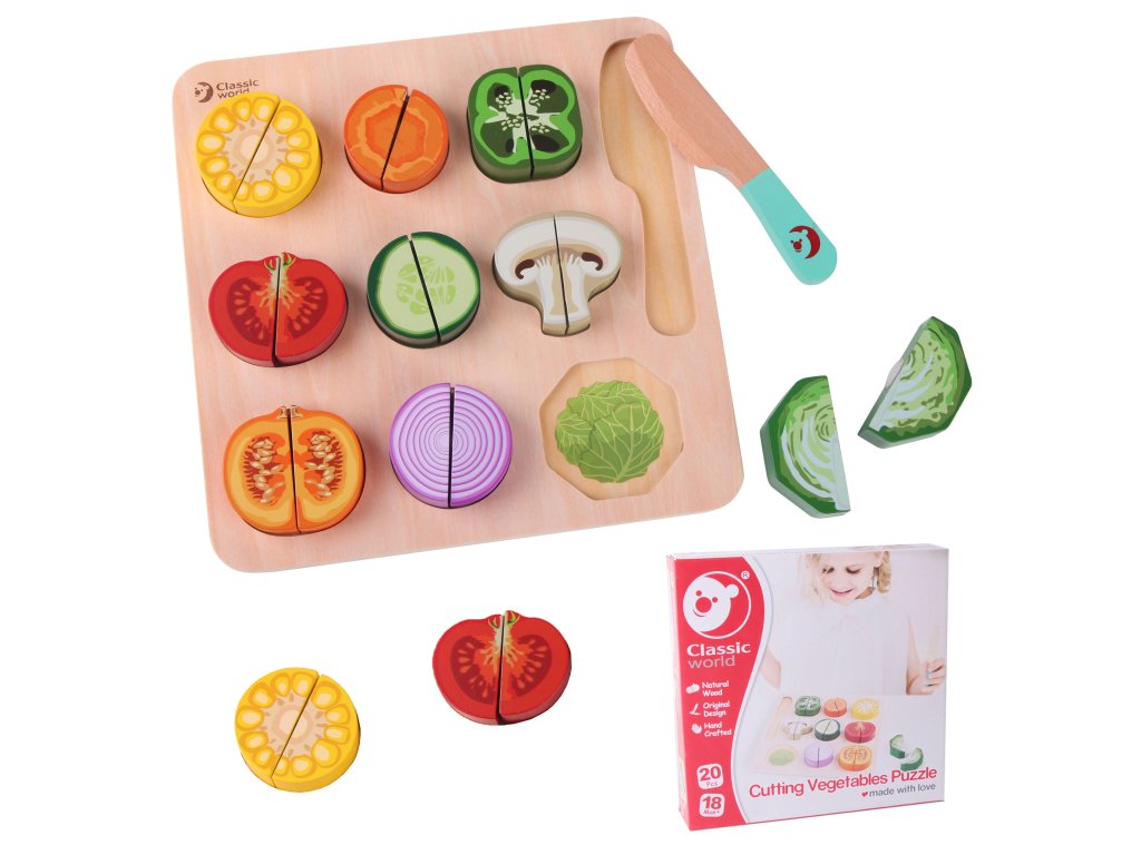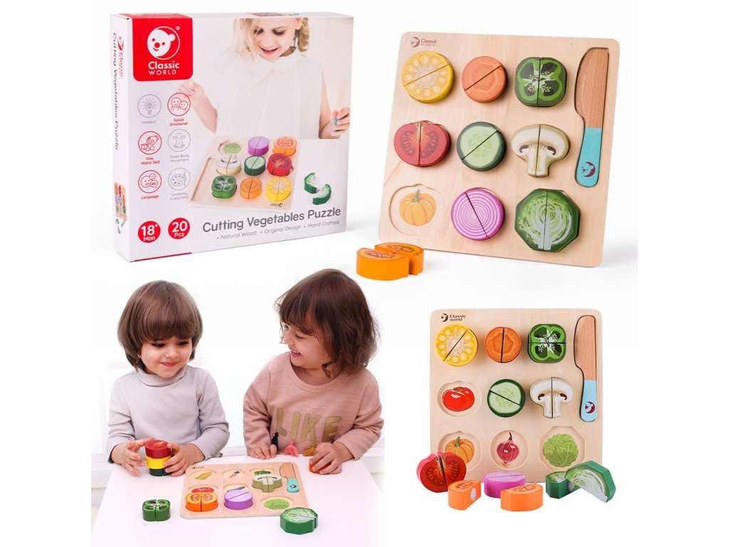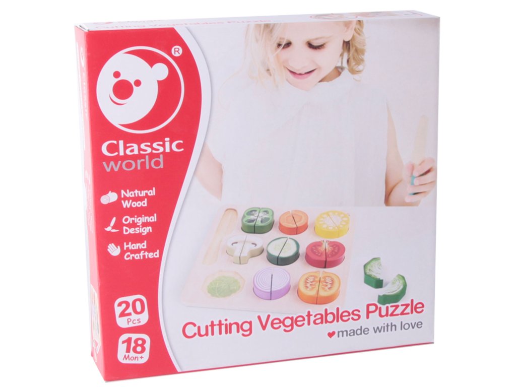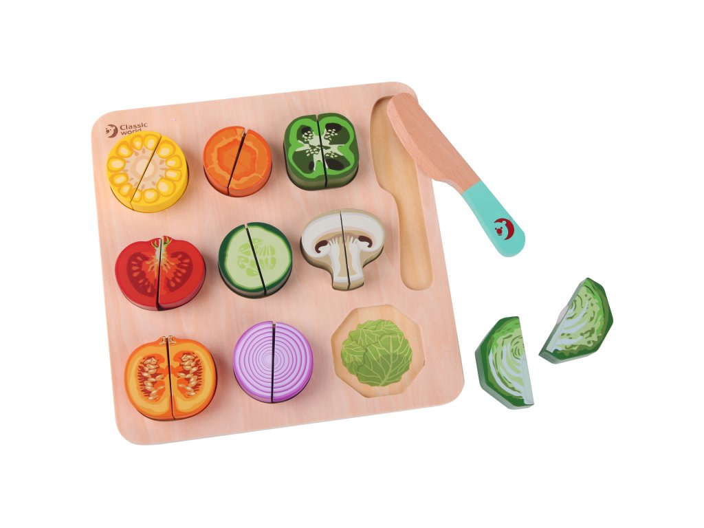 Drevená súprava na krájanie zeleniny od Klasický svetsada farebnej zeleniny je skvelým doplnkom zábavy pre malých kuchárov, ktorí sa radi hrajú na domček alebo varenie. Hra umožní hranie rolí už od útleho veku a má aj vzdelávaciu funkciu. Výrobok je senzačným nápadom na zábavu, najmä počas nepriaznivého počasia.