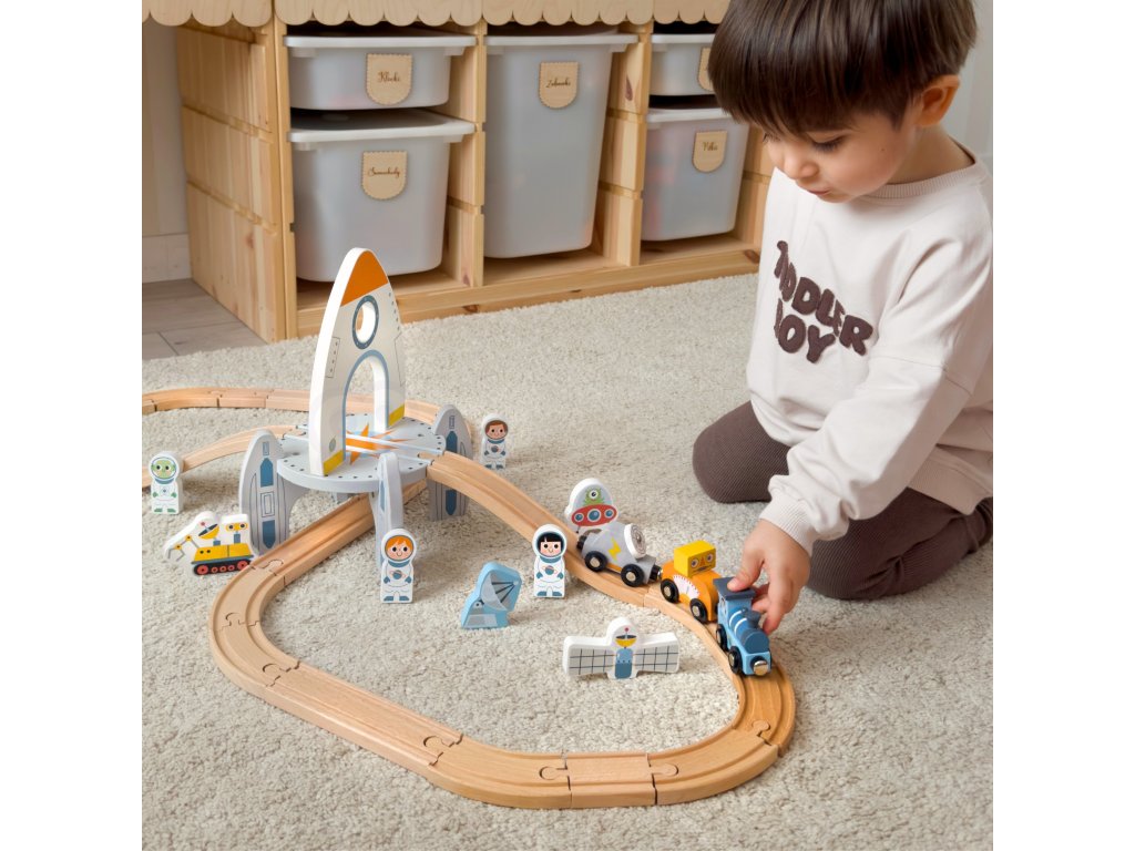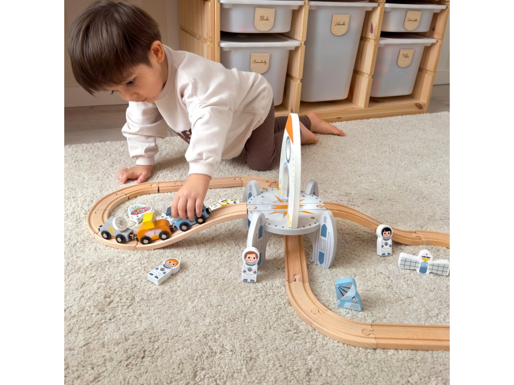 JedinečnéDrevený vesmírny vlak značkyTooky Toy naviacúrovňová konštrukcia, ktorý upúta pozornosť svojím estetickým dizajnom a prvkami inšpirovanými vesmírom. Navrhnuté prerozvoj predstavivosti a manuálnych zručností u detí. Hračka deťom približuje svet vesmíru vďaka tematickým prvkom, ako sú figúrky kozmonautov, vesmírna družica, rover a lietajúci tanier. Konštrukcia obsahuje viacúrovňové usporiadanie dráhy, ktoré zvyšuje hravú dynamiku. Stredobodom dráhy je veľká vesmírna raketa, ktorá je dekoratívnym aj konštrukčným prvkom. Zostavenie dráhy a umiestnenie figúrok a vozidiel umožňuje deťomrozvíjať manuálne zručnosti, koordináciu rúk a očí a kreativitu. Vesmírna téma podnecuje predstavivosť a podporuje príbehy o medzihviezdnom cestovaní a objavovaní nových planét.