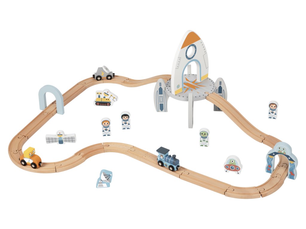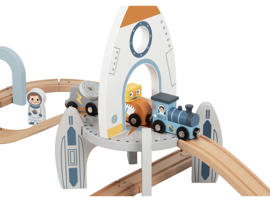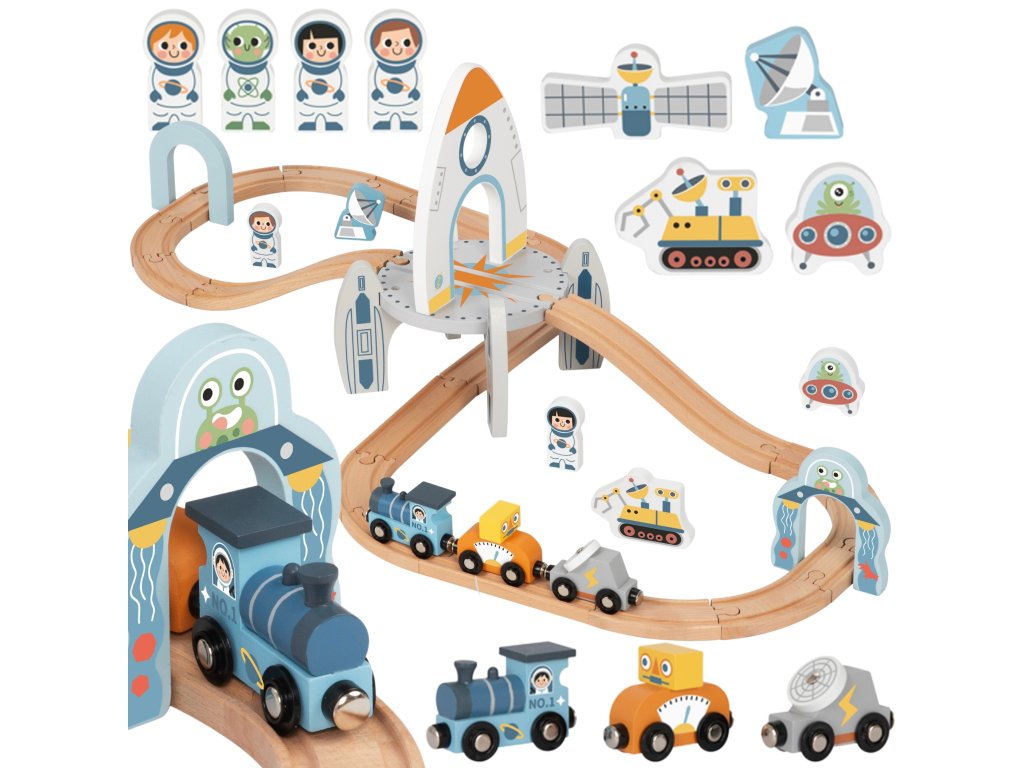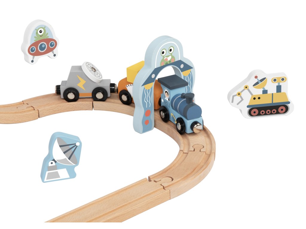 - - súprava obsahuje drevené skladacie koľaje, vlak s dvoma vagónmi, figúrky kozmonautov, vesmírne doplnky vrátane satelitu, rovera a lietajúceho taniera, ako aj raketu a luk s obrázkom mimozemšťana,
