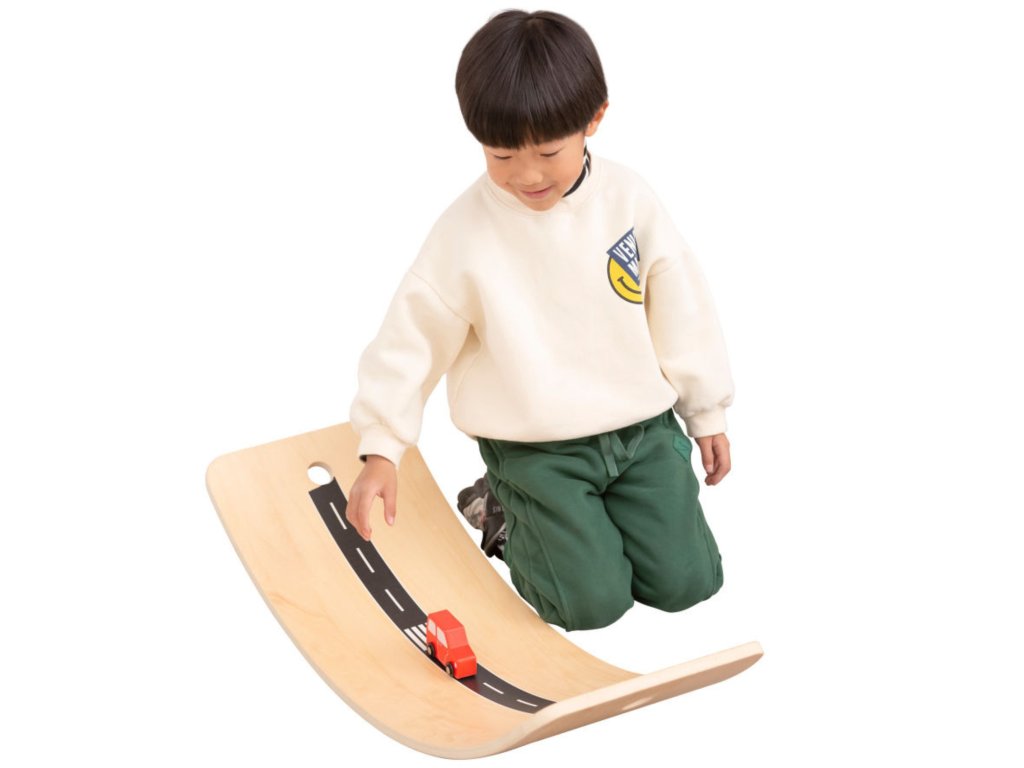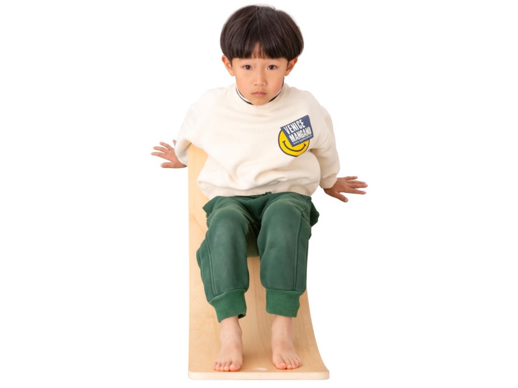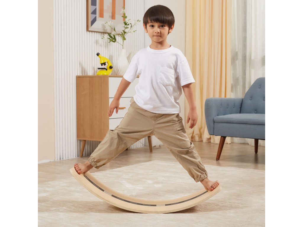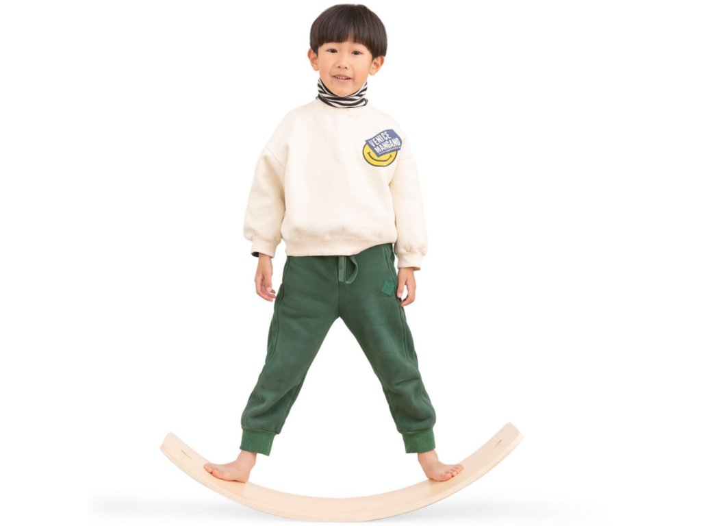 ✔️ Úlohou dieťaťa je balansovať na doske a zároveň udržať rovnováhu.