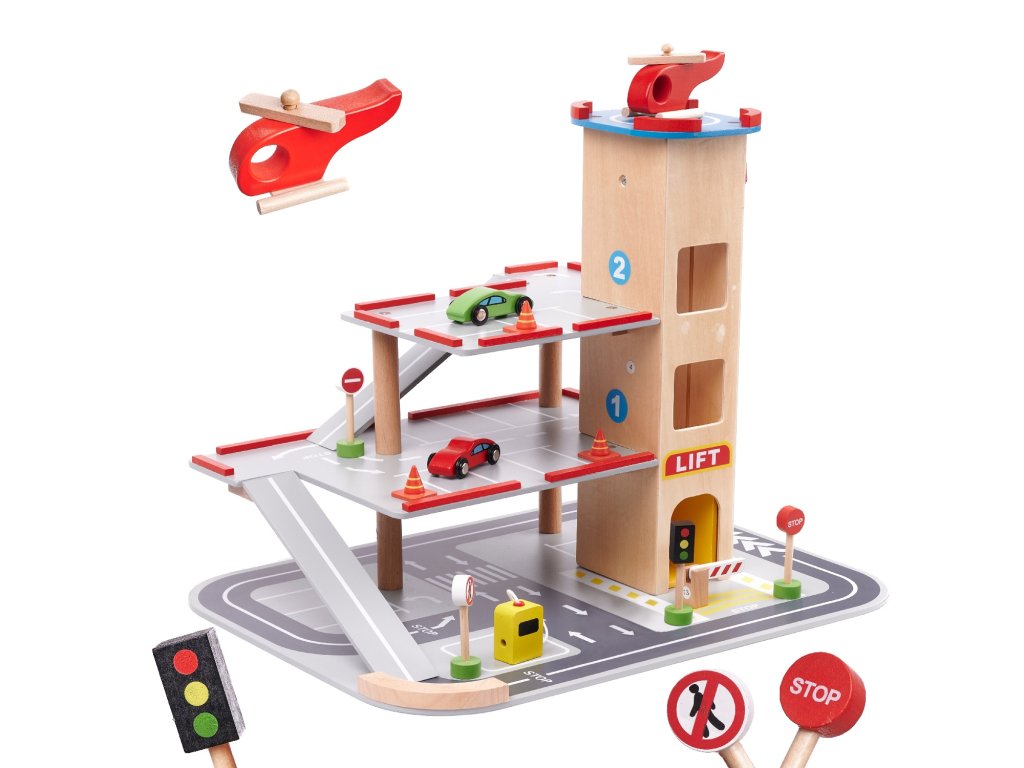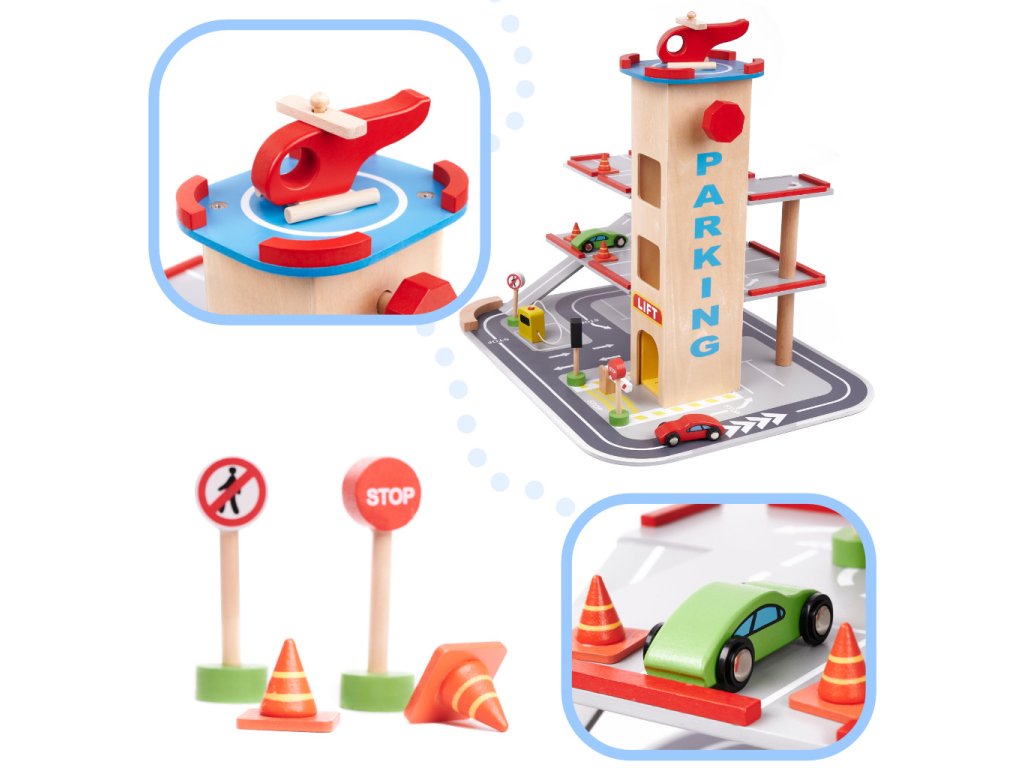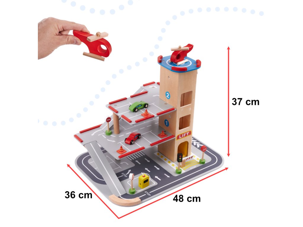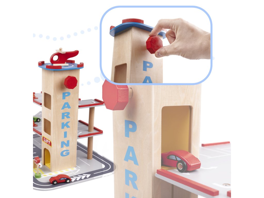 Krásna drevená mestská garáž má štyri úrovne! Prvé tri sú určené pre autíčka - je tu miesto pre drevené autíčka, ktoré sú súčasťou sady, ako aj pre mnohé iné vozidlá vášho dieťaťa. Do ďalších úrovní sa dostanete výťahom!
