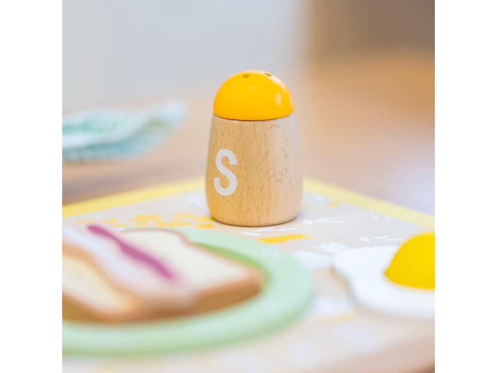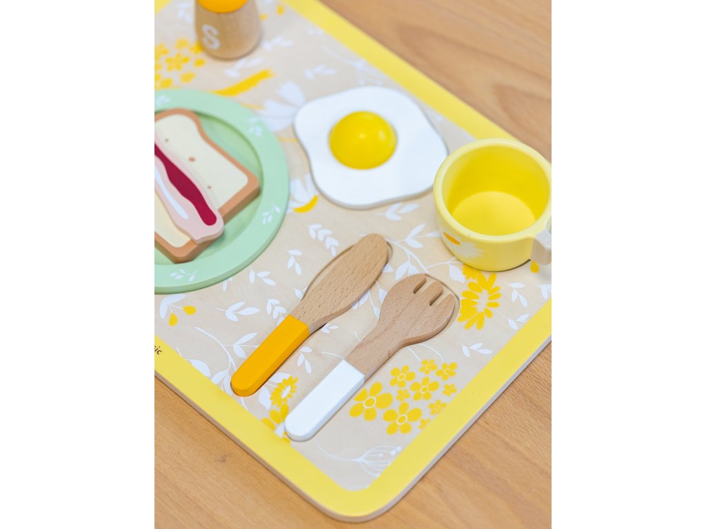 - - súprava obsahujetanier, príbor, šálka, soľ, korenie, vajce, toast, plátok slaniny, obrúsok a servírovací podnos,