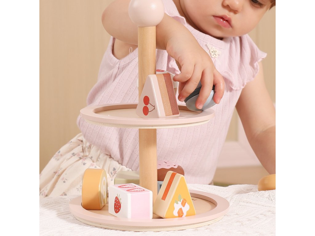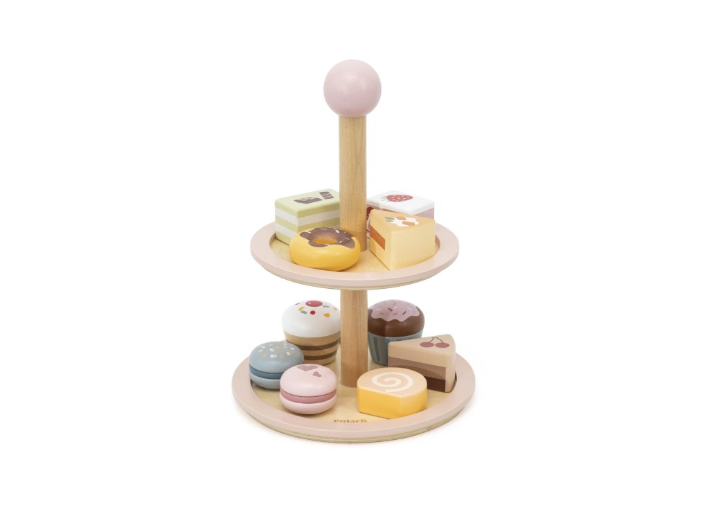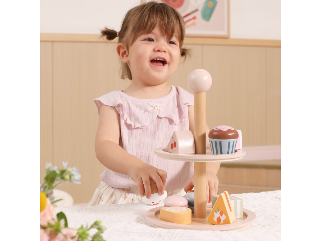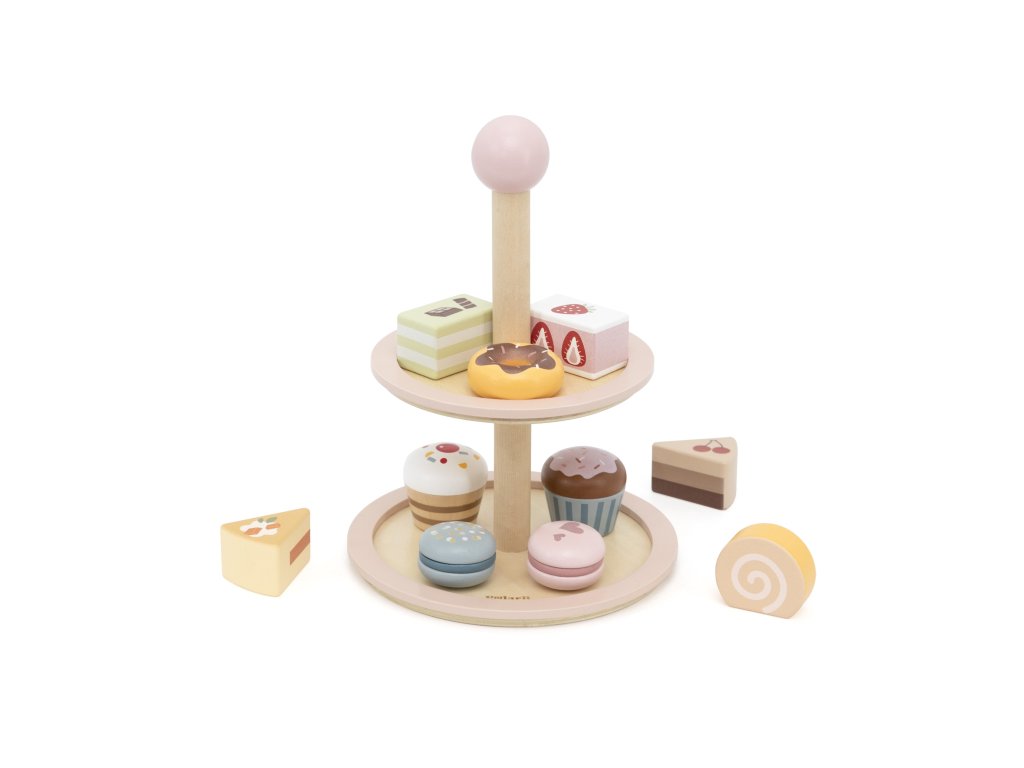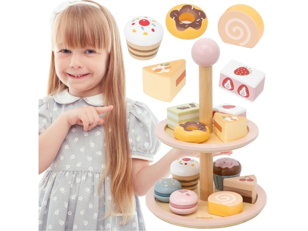 Pozvite svoje dieťa do sveta kaviarenských hier!Drevený stojan na tortu značkyViga PolarB je elegantný dvojposchodový tanier s farebnými sladkosťami, ktorý spríjemní každý popoludňajší čaj. Sada obsahuje až 10 rozkošných sušienok a koláčikov, vyrobené z bezpečných, netoxických materiálov. Vďaka hladkým okrajom a ideálnej veľkosti je hračka pohodlná na uchopenie malými rúčkami. Je to nielen skvelá zábava, ale aj spôsob, akorozvíjanie predstavivosti, tvorivosti a sociálnych zručností dieťaťa.