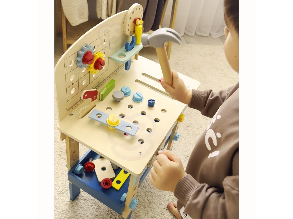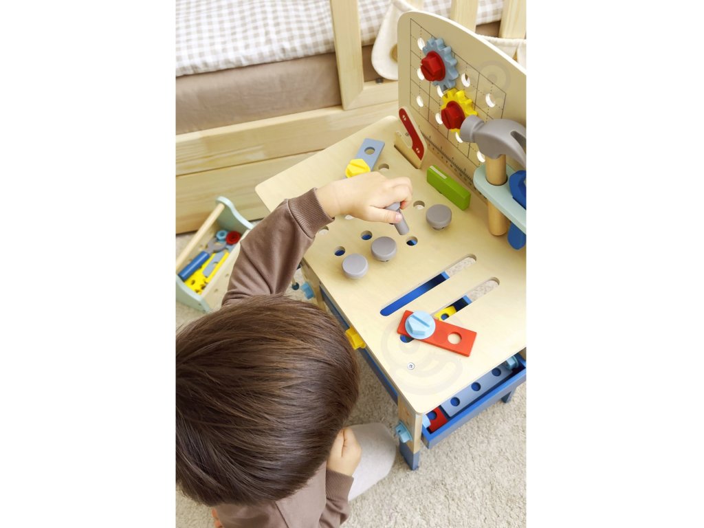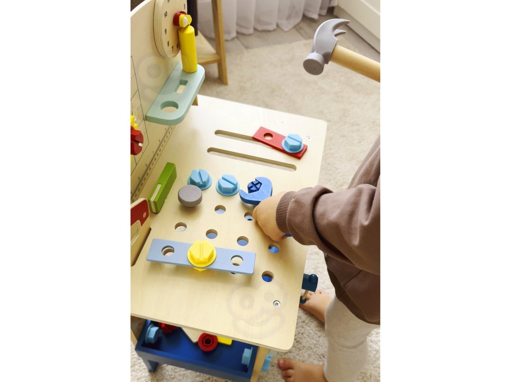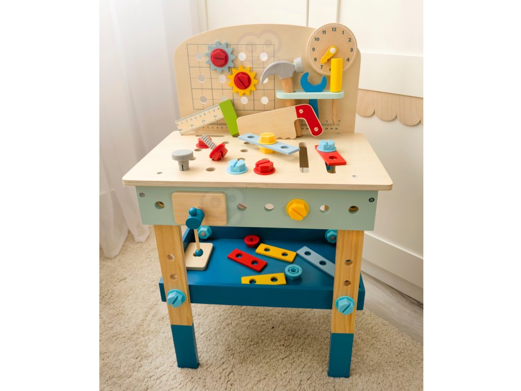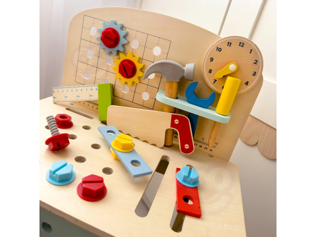 Stôl DIY od značkyHračka na hranie bude splneným snom malého majstra. Súprava obsahuje stôl s rôznyminástroje na hranie: píla, kladivo, kľúč, skrutkovač, zverák, meter, skrutky, matice, podložky a ozubené kolesá. Vďaka poličkám a úchytkám na stole bude mať dieťa po ruke potrebné náradie a príslušenstvo a komponenty súpravy sa dajú pripevniť na stôl. Hračkavyrobené spôsobom bezpečným pre deti, rohy a hrany sú zaoblené, aby nehrozilo nebezpečenstvo poranenia.