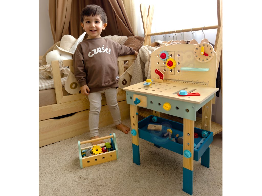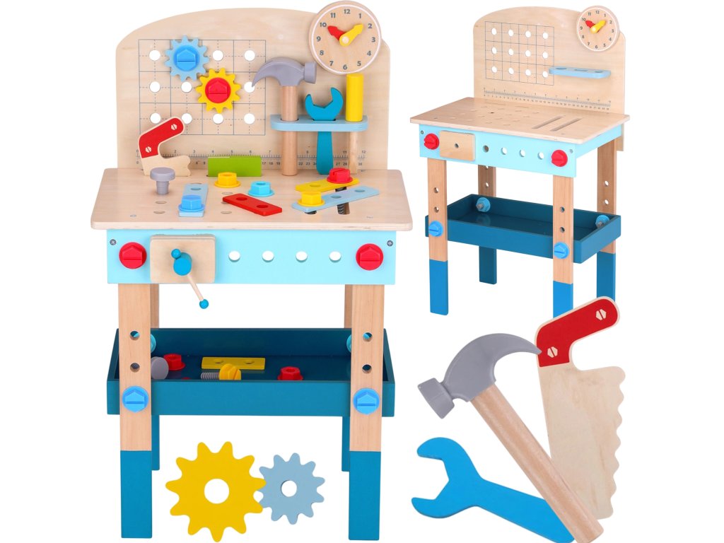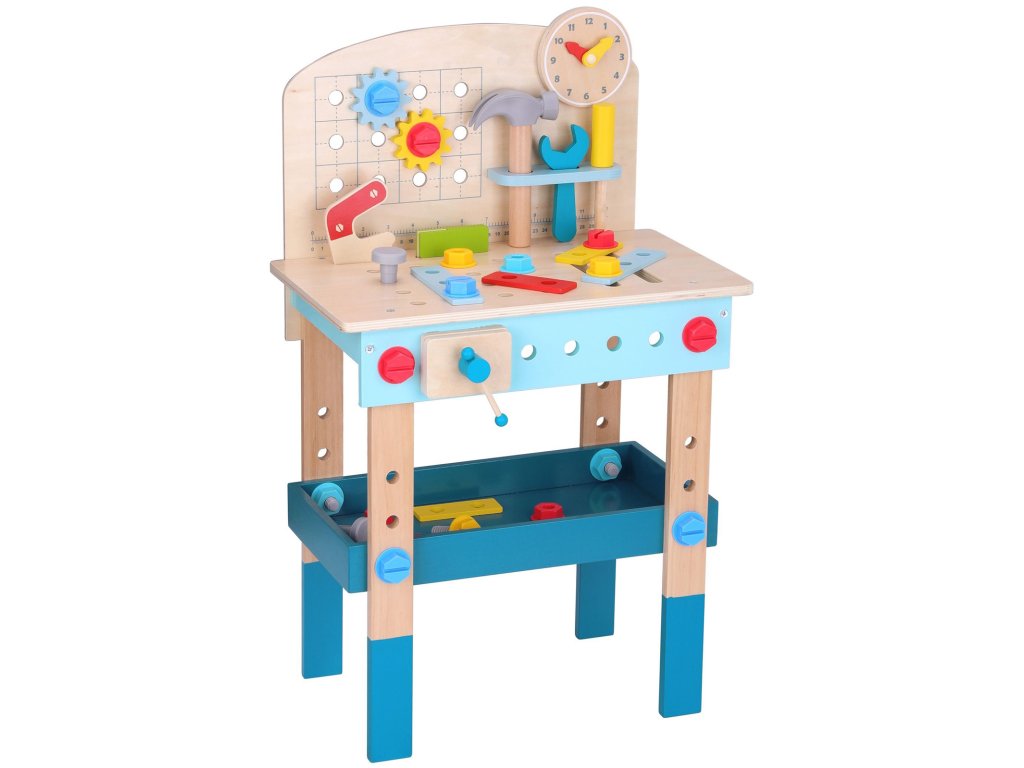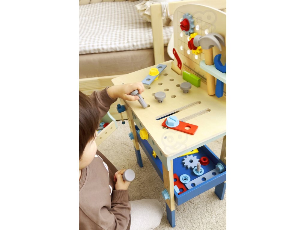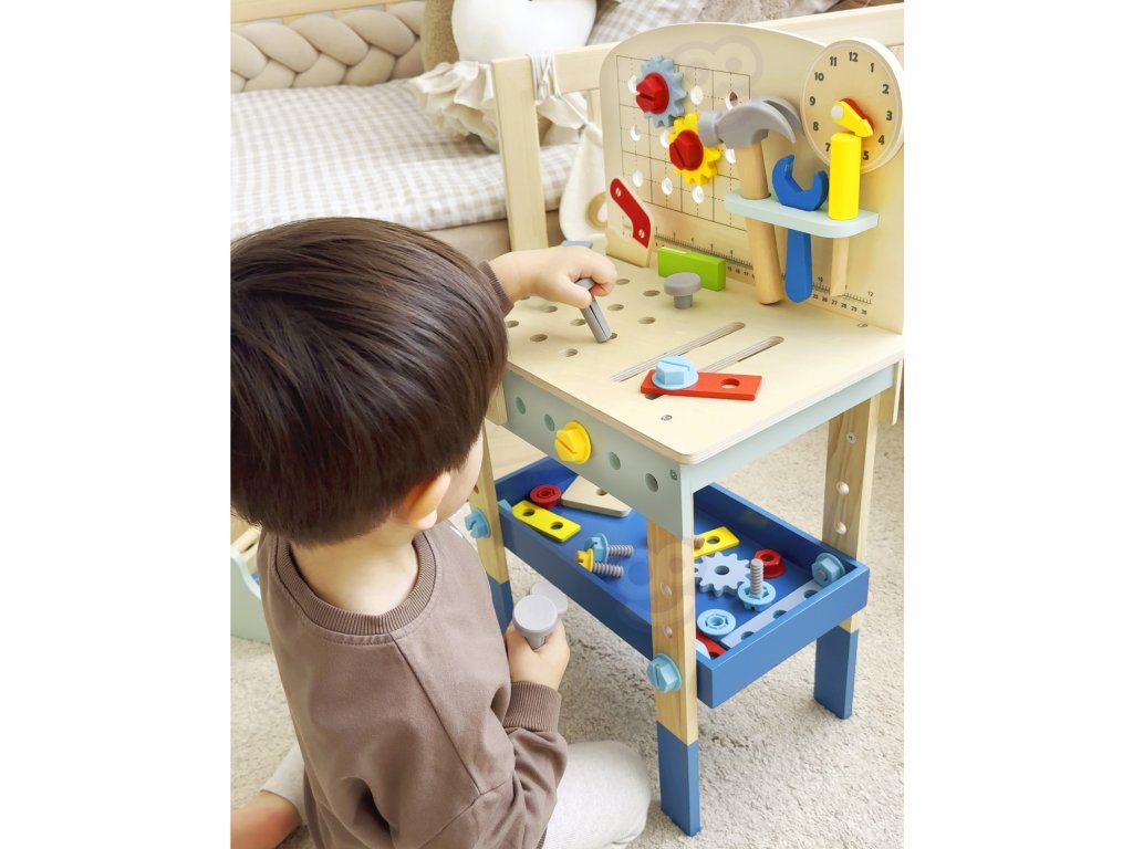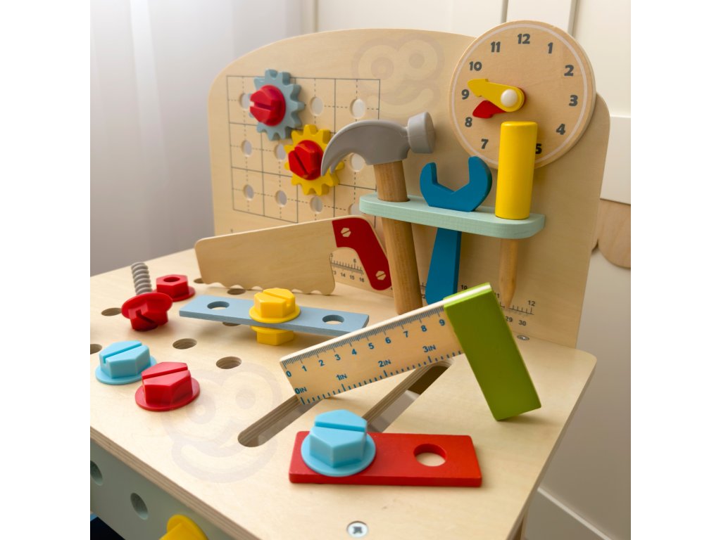 Stôl DIY od značkyHračka na hranie bude splneným snom malého majstra. Súprava obsahuje stôl s rôznyminástroje na hranie: píla, kladivo, kľúč, skrutkovač, zverák, meter, skrutky, matice, podložky a ozubené kolesá. Vďaka poličkám a úchytkám na stole bude mať dieťa po ruke potrebné náradie a príslušenstvo a komponenty súpravy sa dajú pripevniť na stôl. Hračkavyrobené spôsobom bezpečným pre deti, rohy a hrany sú zaoblené, aby nehrozilo nebezpečenstvo poranenia.