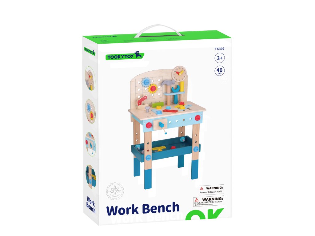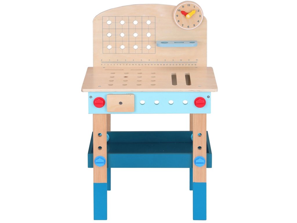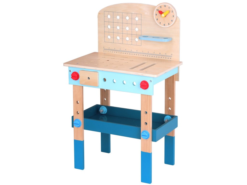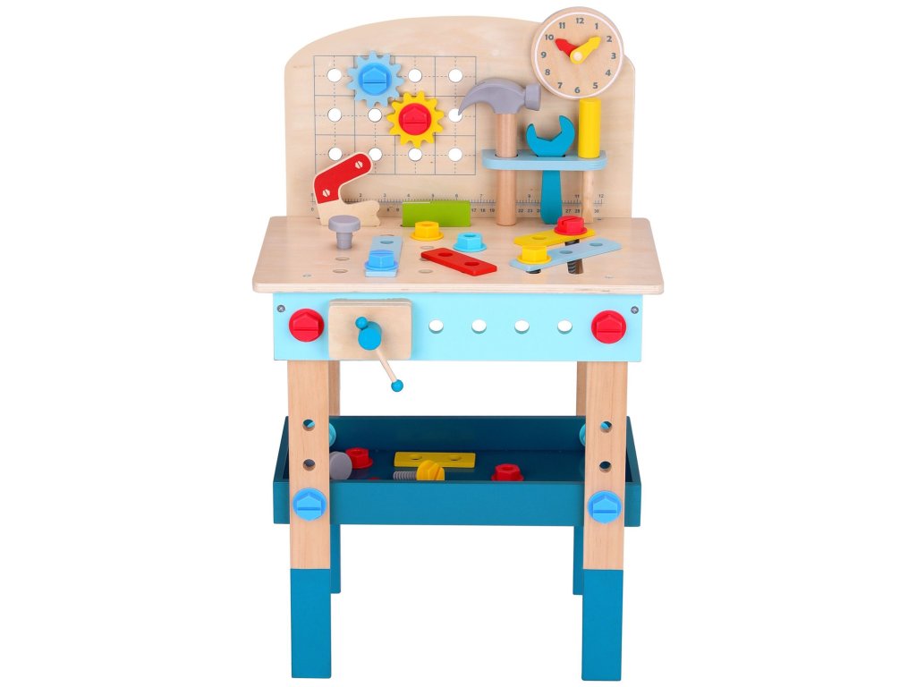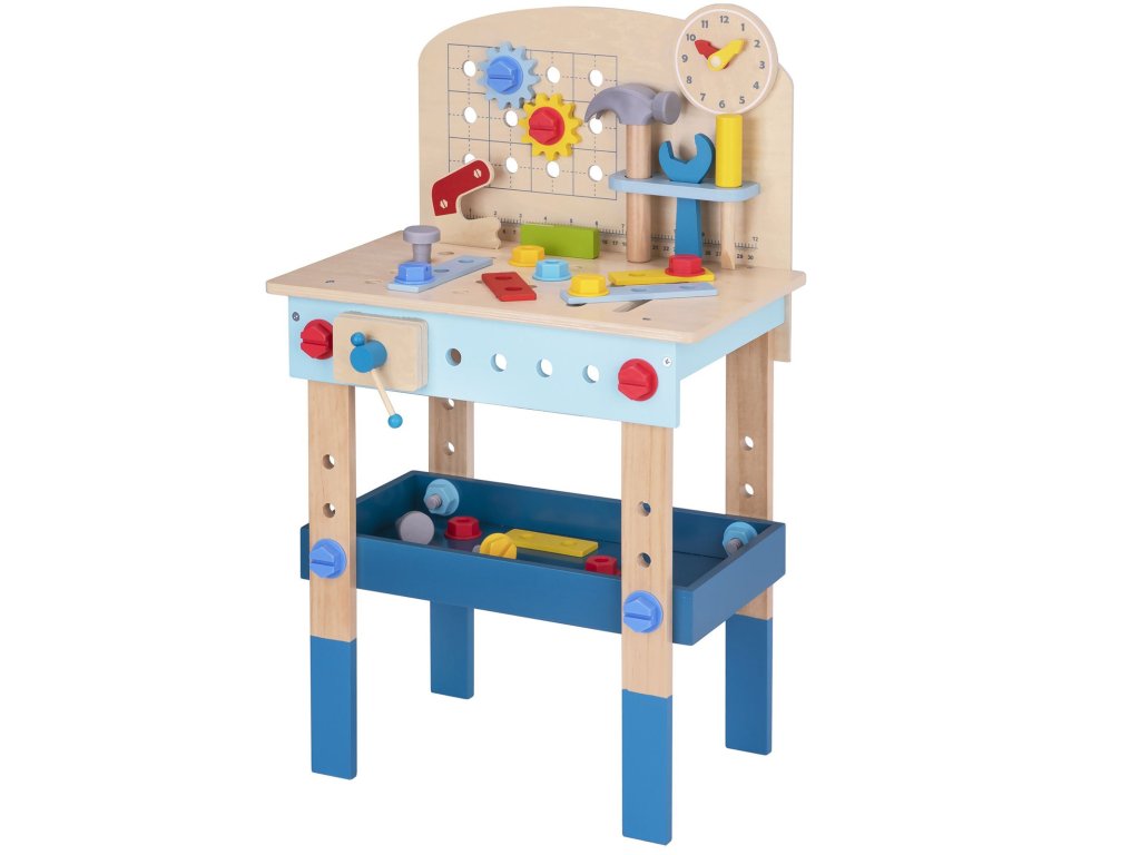 Stôl DIY od značkyHračka na hranie bude splneným snom malého majstra. Súprava obsahuje stôl s rôznyminástroje na hranie: píla, kladivo, kľúč, skrutkovač, zverák, meter, skrutky, matice, podložky a ozubené kolesá. Vďaka poličkám a úchytkám na stole bude mať dieťa po ruke potrebné náradie a príslušenstvo a komponenty súpravy sa dajú pripevniť na stôl. Hračkavyrobené spôsobom bezpečným pre deti, rohy a hrany sú zaoblené, aby nehrozilo nebezpečenstvo poranenia.