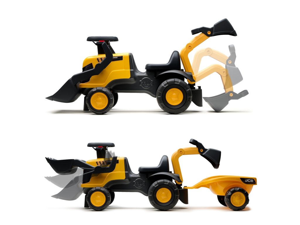 FALK Jazdiaci traktor JCB s prívesom a lopatou Tiché kolesá 1-3 roky