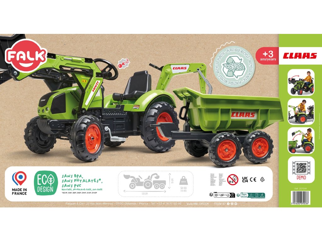 FALK Traktor CLAAS AVEC s prívesomvýrobca FALK je splneným snom mnohých vodičov malých traktorov. Starostlivo spracované, s dôrazom na najmenší detail!Žiadny farmár by nimi nepohrdol. Šlapacie vozidlo -ideálny darček pre každé dieťa. Najnovší traktorCLAAS AVECpedále pre detilyžicou,nabíjačka ipríves je vyrobený zvysokokvalitné plasty umelé. Má tiežotočné sedadlo. Vozidlo je určené pre deti vo vekuod 3 rokov. Tento model si zamiluje každý mladý traktorista, vozidlo vyrobenéje v pôvodných farbách spoločnosti.
