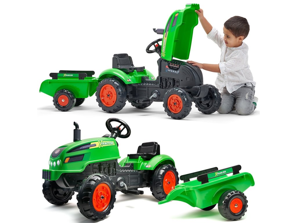 Pedálový traktorX-Tractor v zelenej farbe je jedinečné vozidlo značkyFalkurčené špeciálne pre mladých záhradkárov2 až 5 rokov. Je to hračka, ktorá spája zábavu z jazdy so starostlivosťou o životné prostredie, pretože bola vyrobená v50 % z recyklovaného plastu. Vyrobené v100% vo Francúzsku, traktor poskytuje pevnú platformu na hranie vonku. Vozidlo je vybavenéodnímateľný prívesktorá umožňuje deťom nakladať a prepravovať piesok, lístie, zeminu alebo kamene do najvzdialenejších kútov záhrady. Dodáva hre na realistickostiotváranie kapotys ktorými sa batoľa môže hrať na mechaniku, avolant s klaksónomsúprava má špeciálnu konštrukciu, vďaka ktorej sa s ňou ľahko manévruje. Jedinečným prvkom súpravy jetabuľka s evidenčným číslomktoré si dieťa môže prispôsobiť podľa seba, aby bol jeho traktor jedinečný.