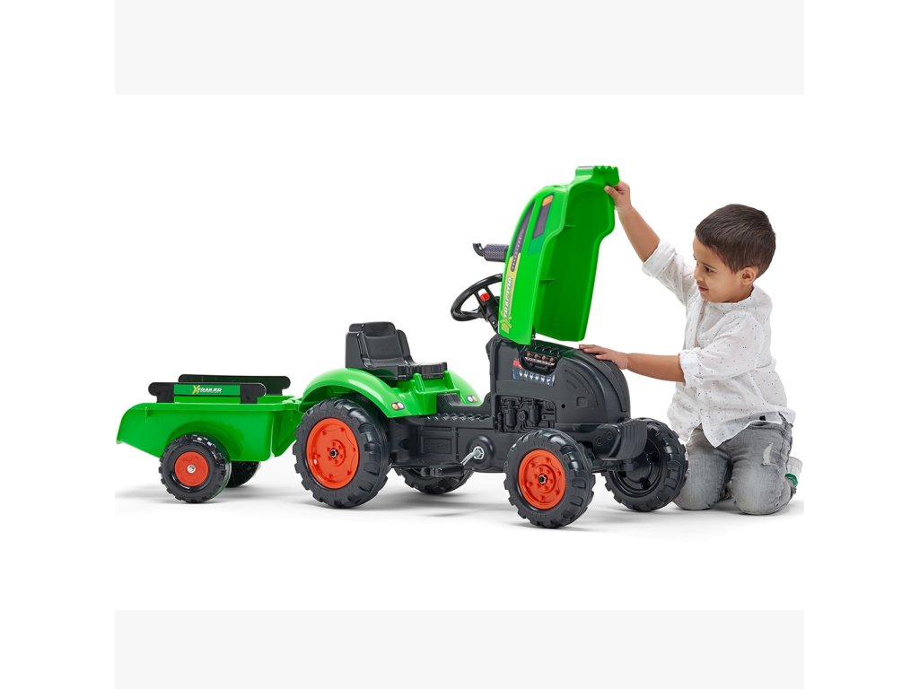 Pedálový traktor s prívesom Zelený pedálový traktor X je pre mnohých splneným snomvodič a staviteľ malých traktorov. Starostlivo spracované, s dôrazom na najmenší detail! Žiadny pravý farmár by takýmto zariadením nepohrdol.Vozidlo vyrobené z plastu najvyššej kvality určené pre detiw vek 2. Vozidlo je vybavené odnímateľným prívesom s panelmi a volantom s klaksónom. Kolesá traktora sú vyrobené z kvalitného plastu a nie sú ťažkopádne na používanie.