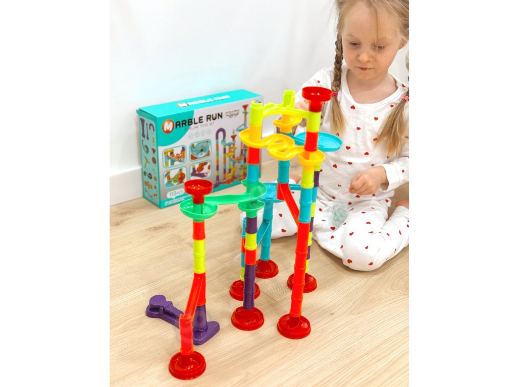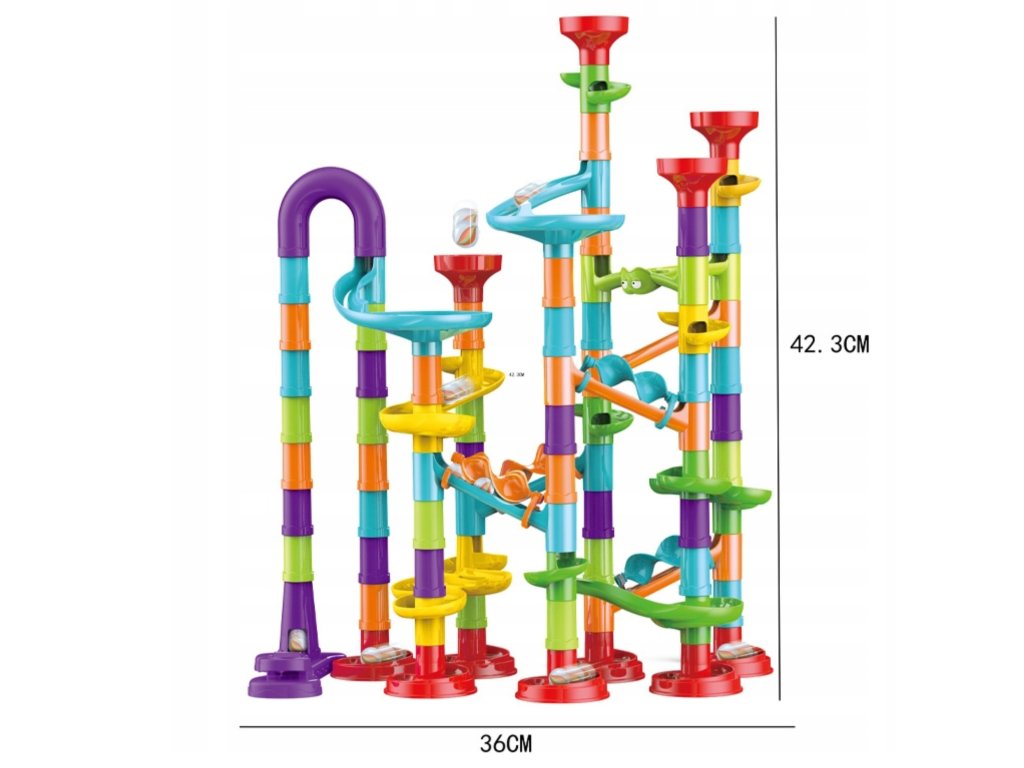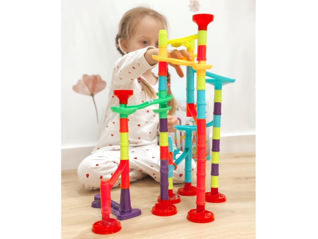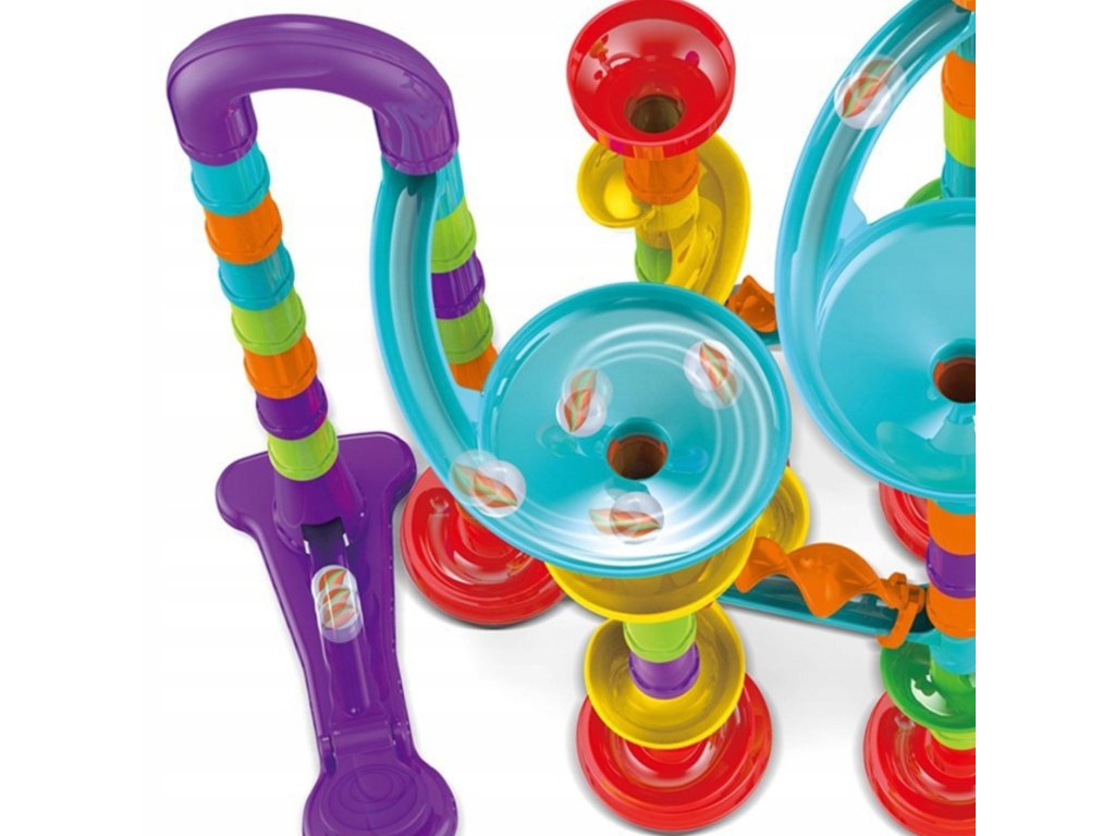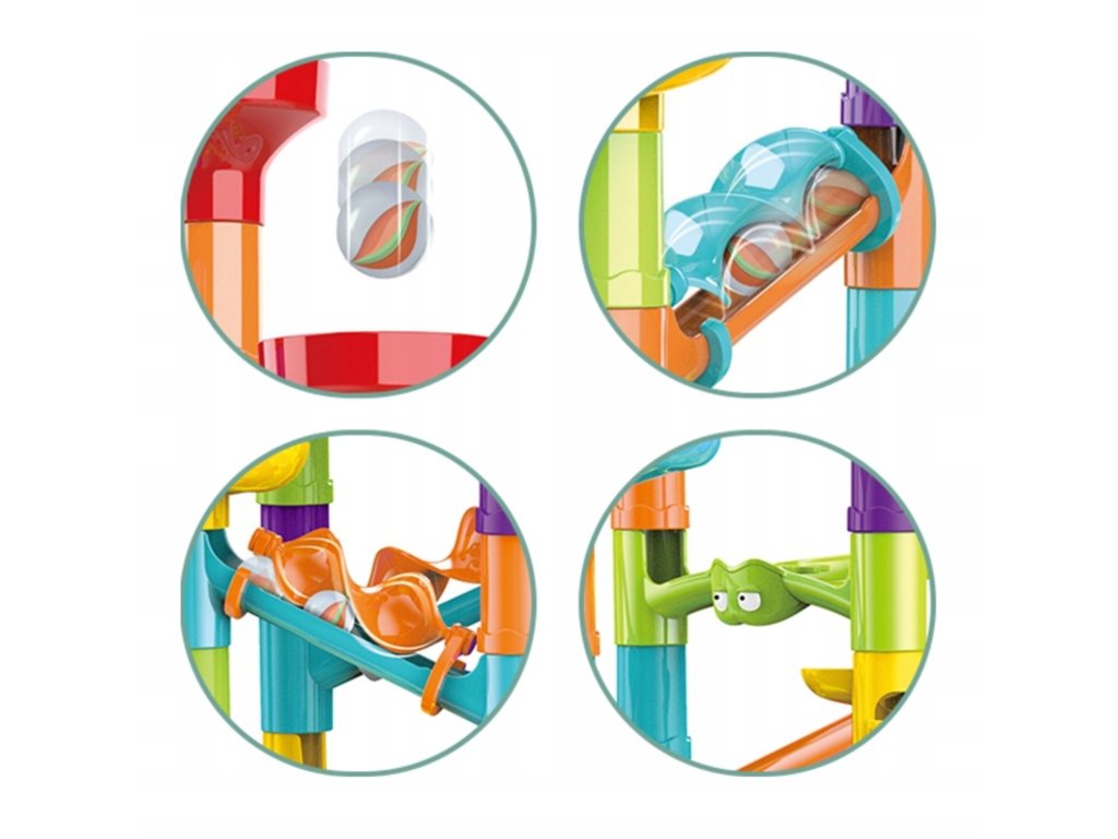 Vypustite guličky a sledujte, ako sa kotúľajú jedna za druhou. Sada obsahuje až 113 rôznych prvkov vrátane spúšťacieho zariadenia a loptičky na dráhu. Veľkosť dráhy je vhodná pre malé detské ruky a pomáha rozvíjať koordináciu očí a rúk.