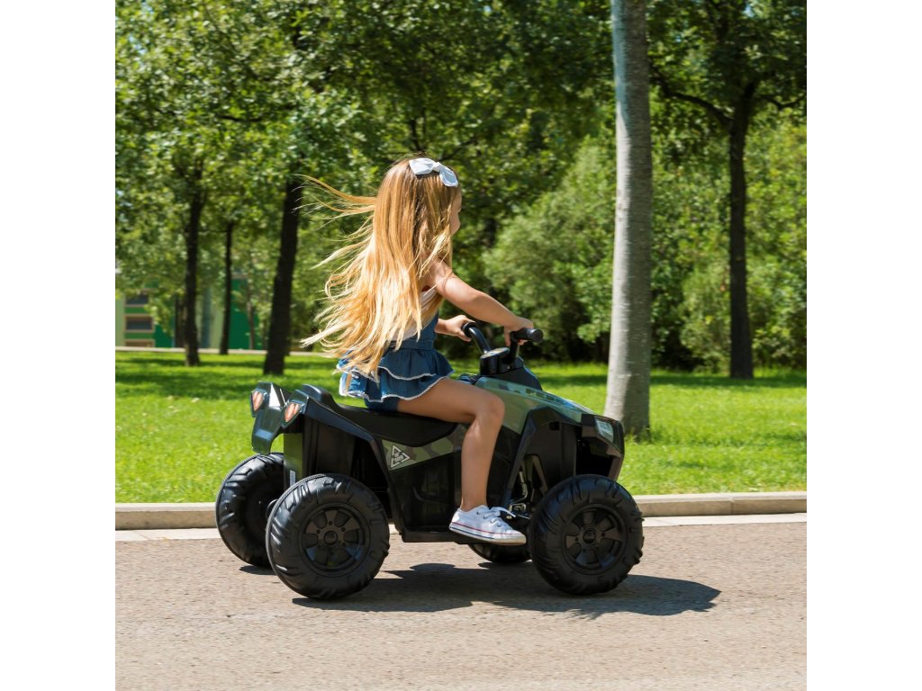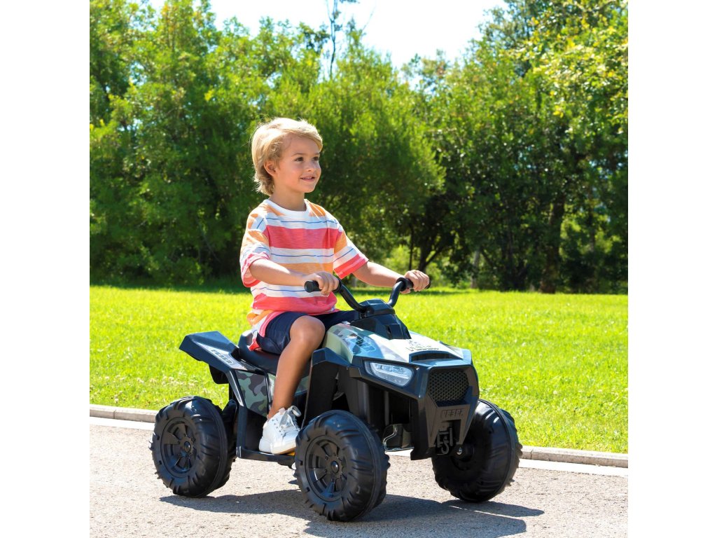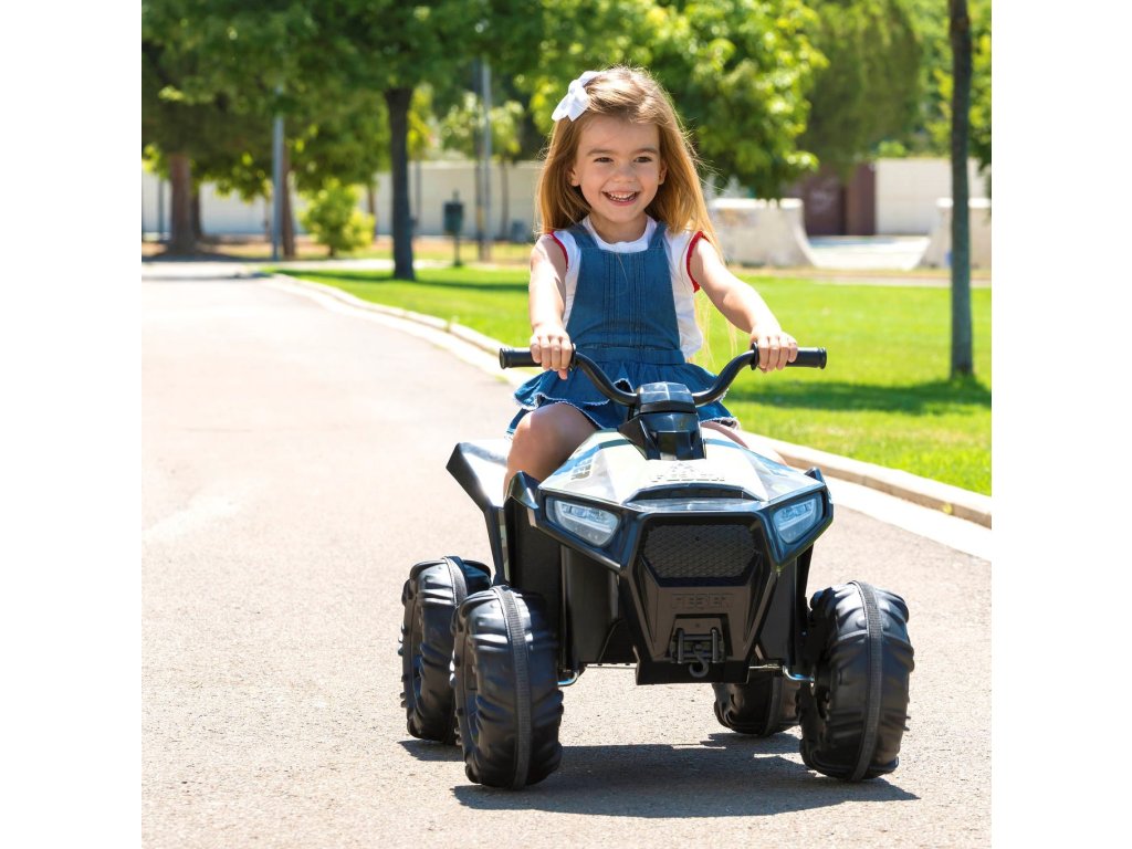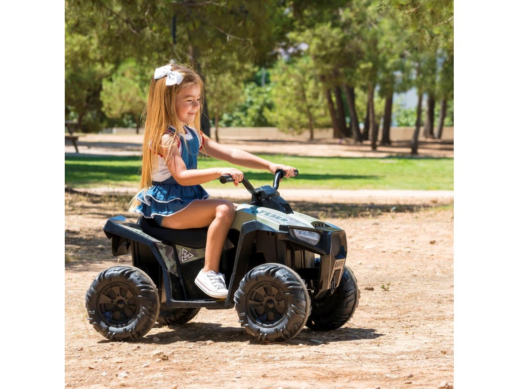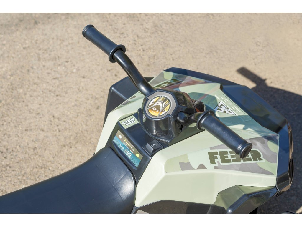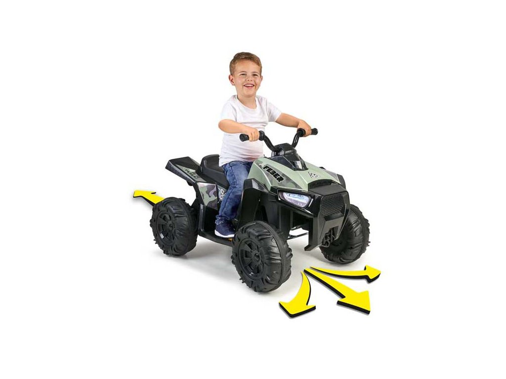 Úžasné elektrické vozidlo od renomovanej španielskej značky Feber. Farba moro dodáva terénny vzhľad. Štvorkolka je vybavená veľkými a robustnými kolesami, ktoré zabezpečia lepšiu priľnavosť a pri použití v interiéri sú tiché a nepoškodzujú podlahy. Je vybavená 12V batériou, prevodovkou na jazdu vpred a vzad a nožnou brzdou.