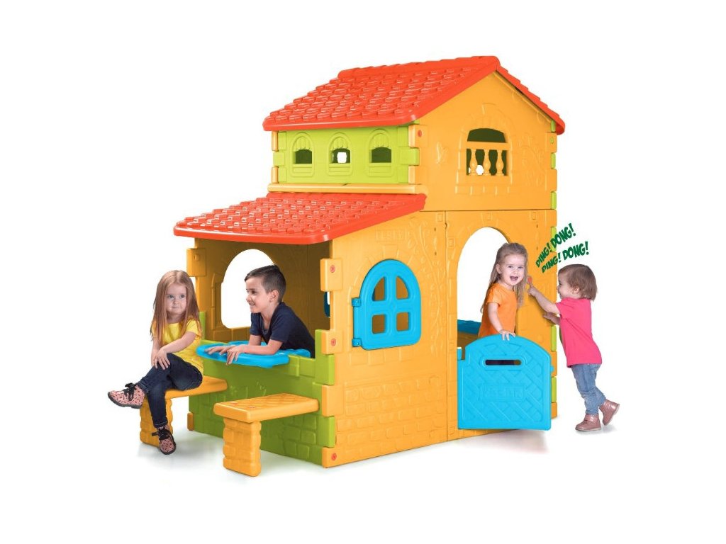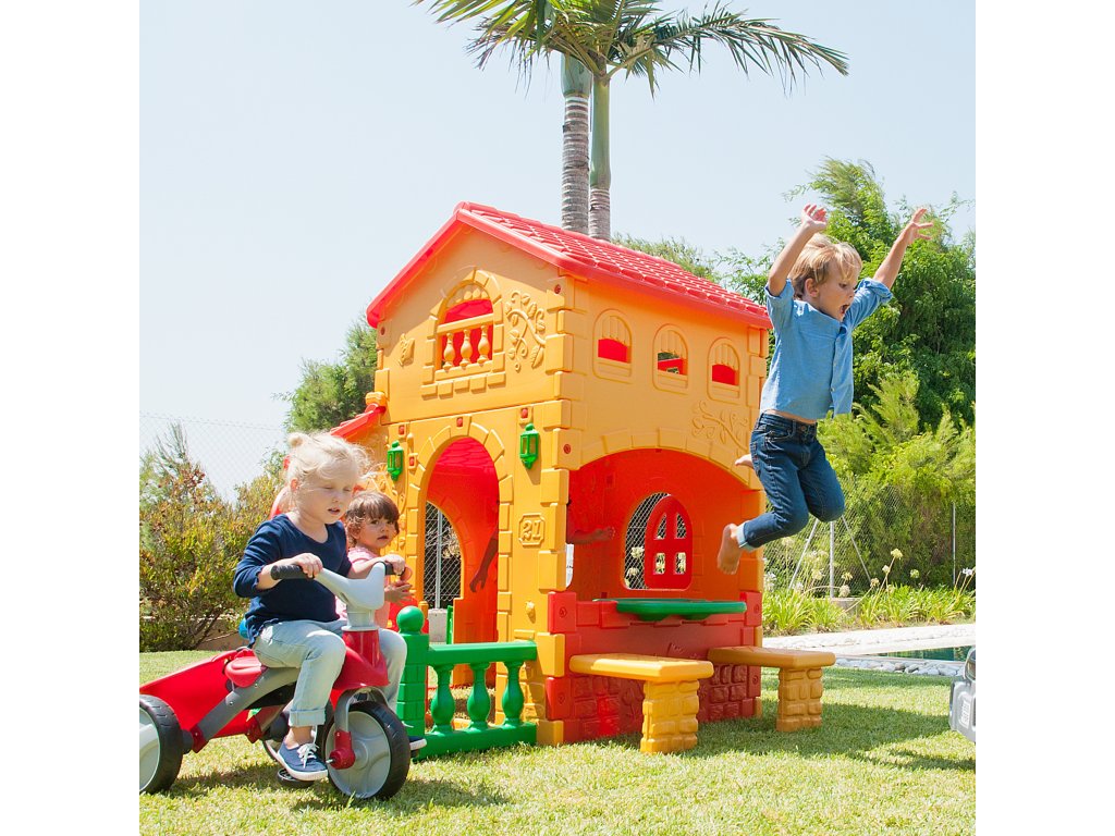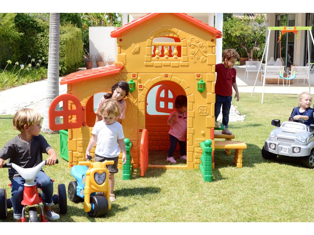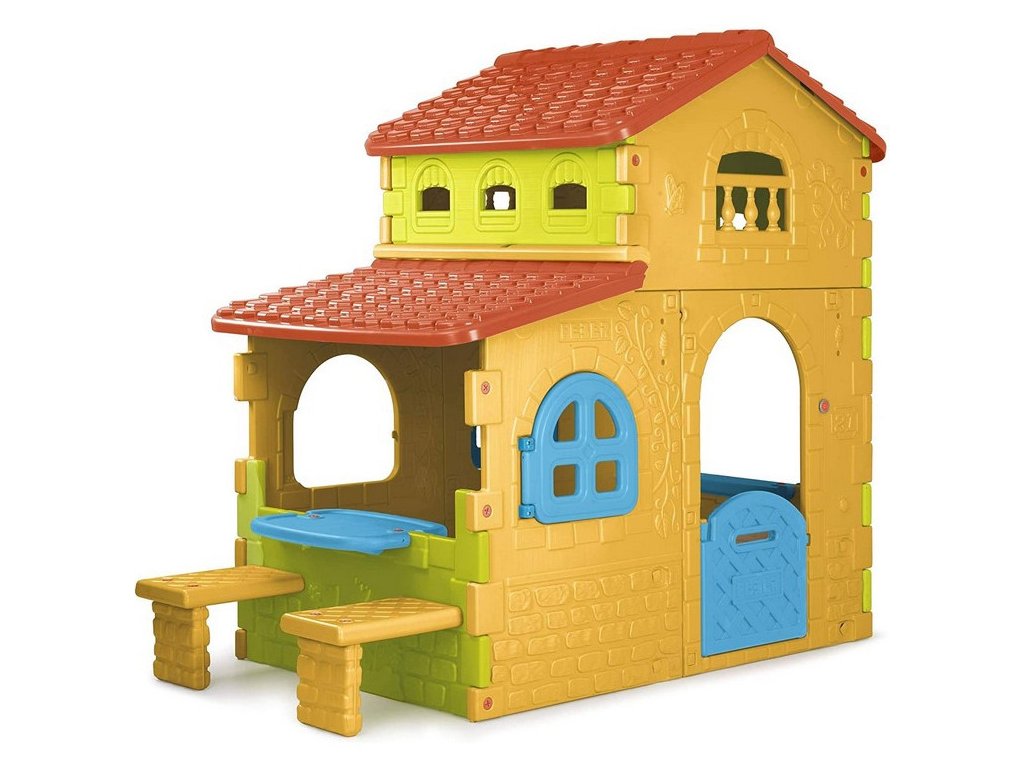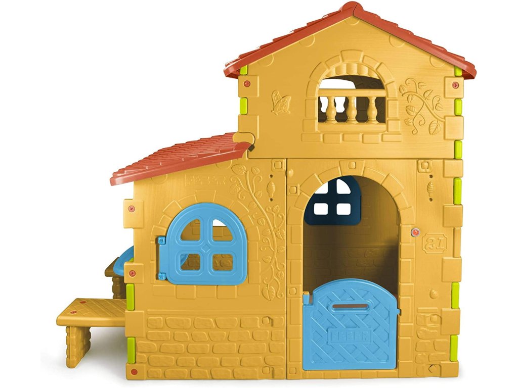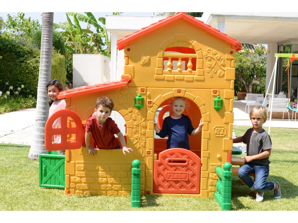 Dom značky Super VillaFeber je najväčší a najhravejší domček s veľkým priestorom na hranie v dvoch výškových zónach. Predné dvere majú otvor, ktorý slúži ako poštová schránka, a navyše má pri dverách zvonček. Domček má na stenách tehlové a kvetinové vzory. Domček má aj stôl a dve lavičky na sedenie. Celá konštrukcia je vyrobená z farebného plastu odolného voči slnečnému žiareniu a teplotám. Domček Super Villa byFeber sa veľmi ľahko inštaluje.