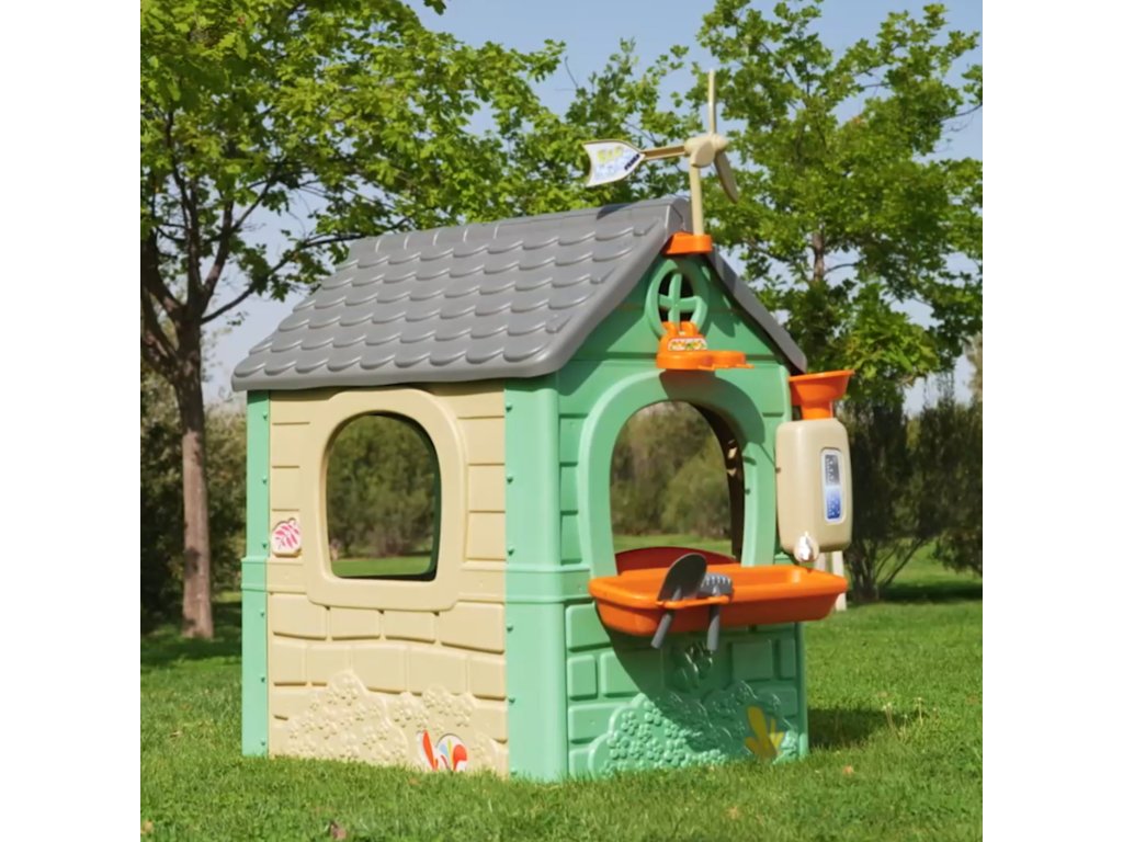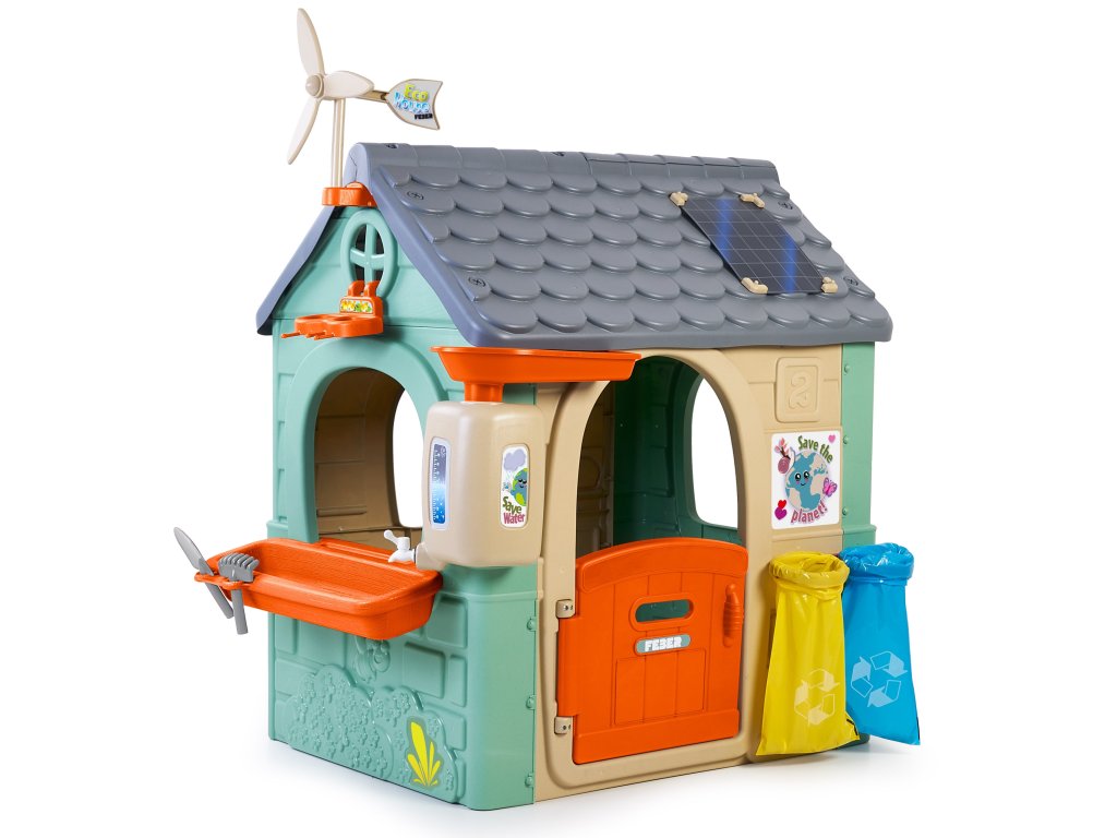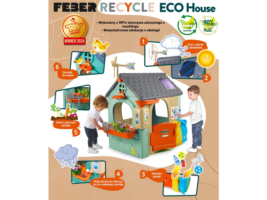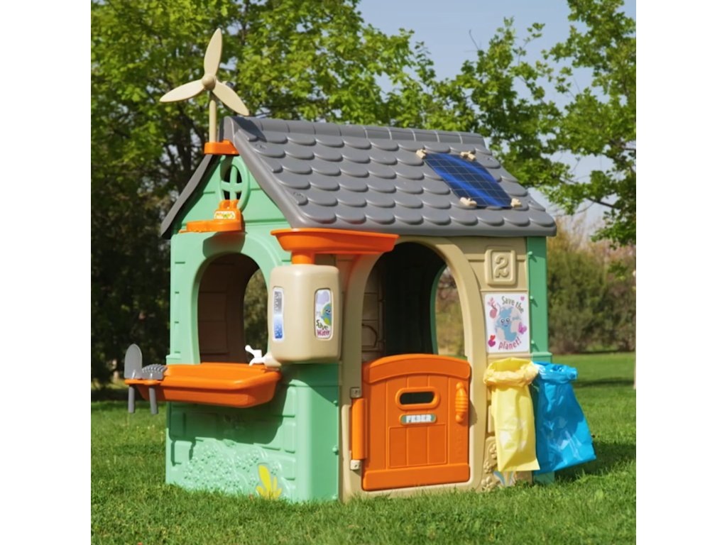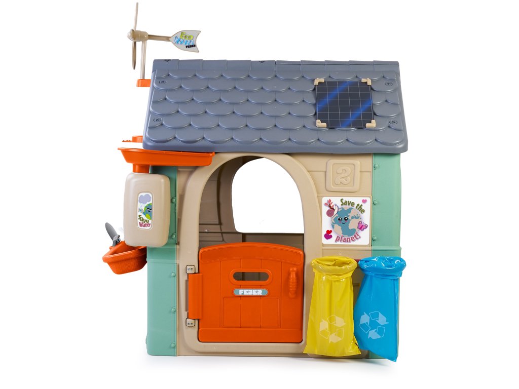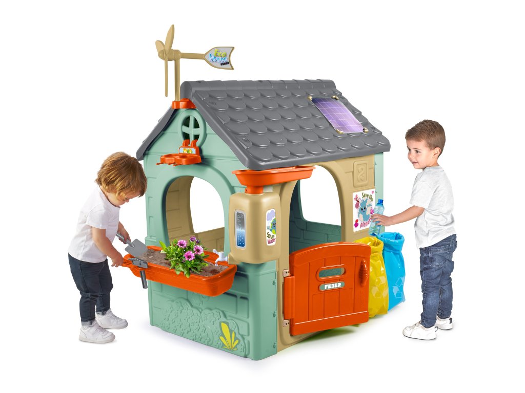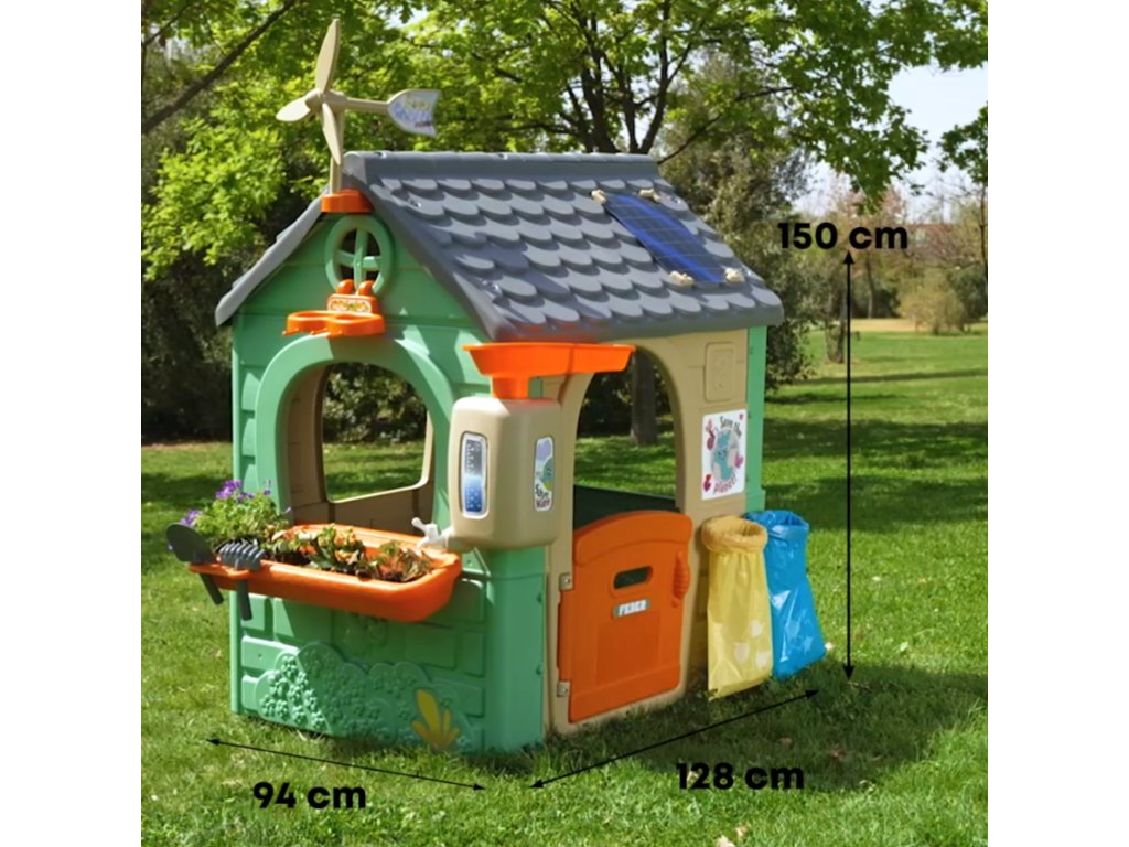 ChataFEBER Recyklácia ECO je bungalovpozostáva z 90 % vyrobené z plastových materiálov šetrných k životnému prostrediu z recyklované. Víťaz ToyAward 2024 na adresenajväčší veľtrh hračiek v Norimbergu pre svoju komplexnúvzdelávanie o ekológii.Je to precízne vytvorený domček na hranie, v ktorom všetky aktivity nájdete ktoré batoľatá potrebujú na vzbudenie zvedavosti v prírode.Skvelé miesto a skvelé učenie pre detiotriedenie odpadu, recyklácia, ekologické poľnohospodárstvo a výrobazelená energia vďakaveterná turbína asolárne panely na streche. Zahrnuté2 recyklačné koše (žltá a modrá),malá záhrada (v kvetináčoch) anástroje. Je to skvelá vonkajšia aktivita pre deti. Môžete sa zabaviť sadením semienok a pozorovaním, ako rastliny rastú. Dodáva sa aj skŕmidlo pre vtáky. Dažďová voda je ideálna na zalievanie rastlín alebo kvetov.Veterný mlyn a imitácia solárneho panelu poskytujú úžasné funkcie na učenie sa o udržateľných energiách!Odolný, ľahko sa inštaluje a je vybavený systémom proti UV žiareniu aby sa zabránilo strate farby a zvýšila sa odolnosť plastu.
