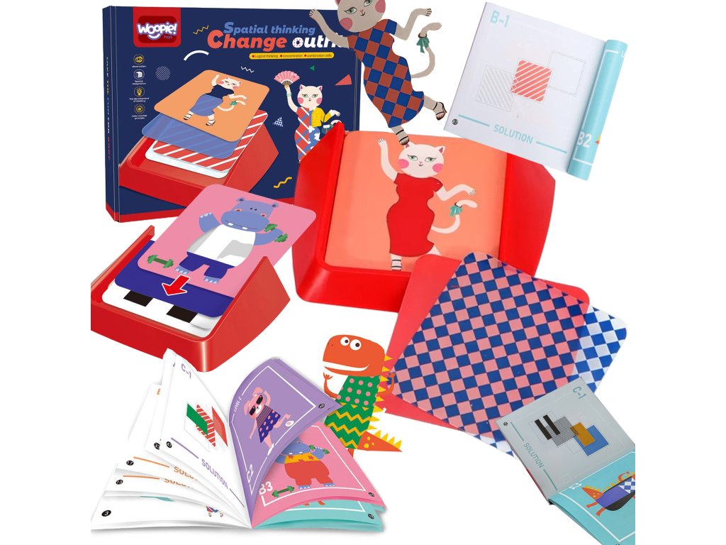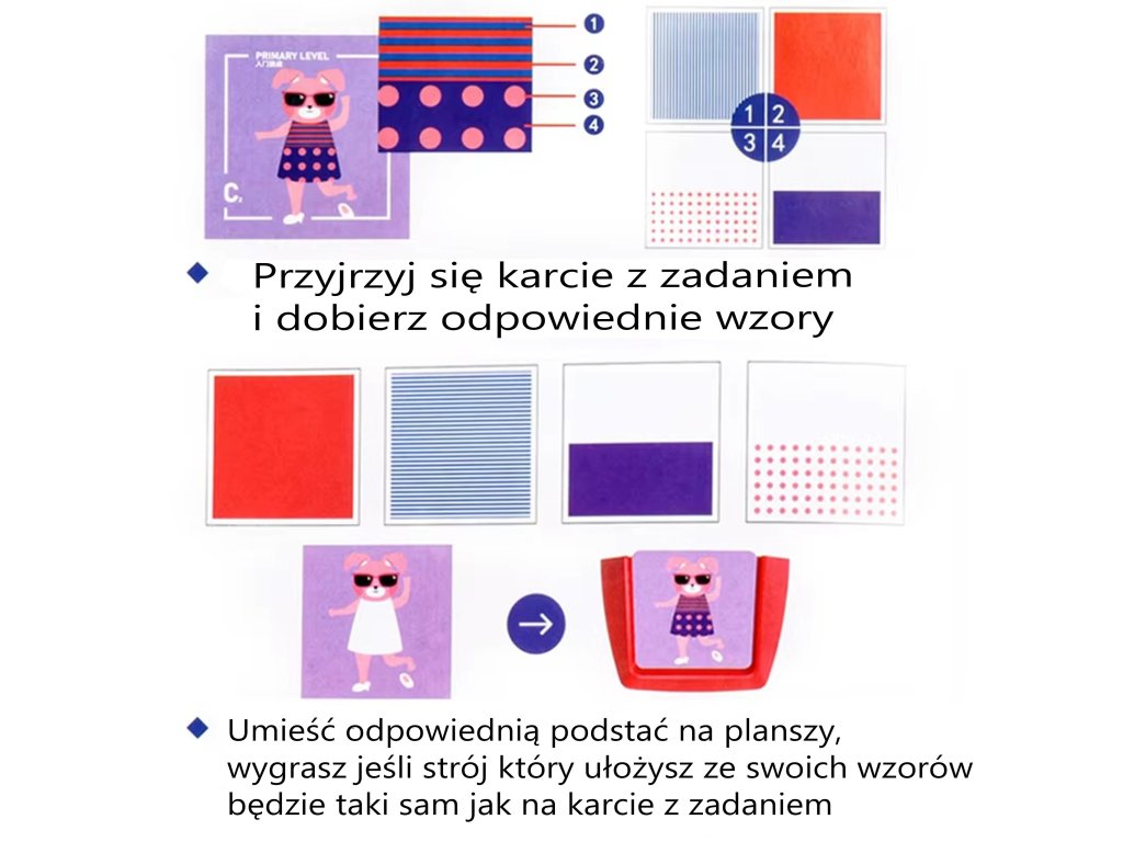 Hra "Naplánujte si oblečenie" od značkyWoopie je fantastický návrh pre deti, ktorý spája zábavu, učeniei logické výzvy. Táto vzdelávacia hra rozvíja u detí analytické schopnosti, kreativitu a schopnosť rozlišovať farby a vzory, a to všetko zábavnou a pútavou formou. Súprava obsahuje48 rôznych úlohrozdelené do 3 úrovní obtiažnosti. Na začiatku si vyberiete model, ktorým môže byť mačka, hroch, králik alebo priateľský dinosaurus, a potom vstúpite do výzvy! Vašou úlohou je zladiť správny outfit s vybranou postavičkou podľa pokynov z výzvy.Každá karta s výzvou predstavuje inú kombináciu farieb a vzorovktoré musia byť presne reprodukované. Hra je nielen veľmi zábavná, ale ajstimuluje logické myslenie a učí sústredeniu a plánovaniu. Po dokončení všetkých úrovní sa môže malý hráč hrdo vyhlásiť za majstra detskej módy!