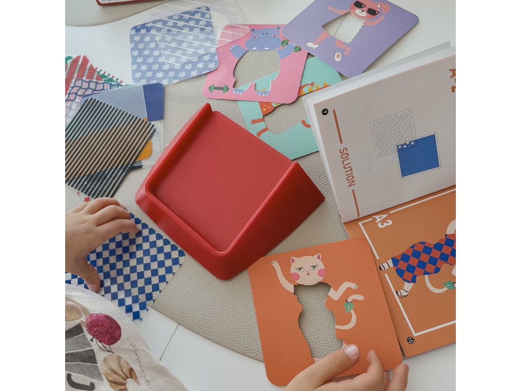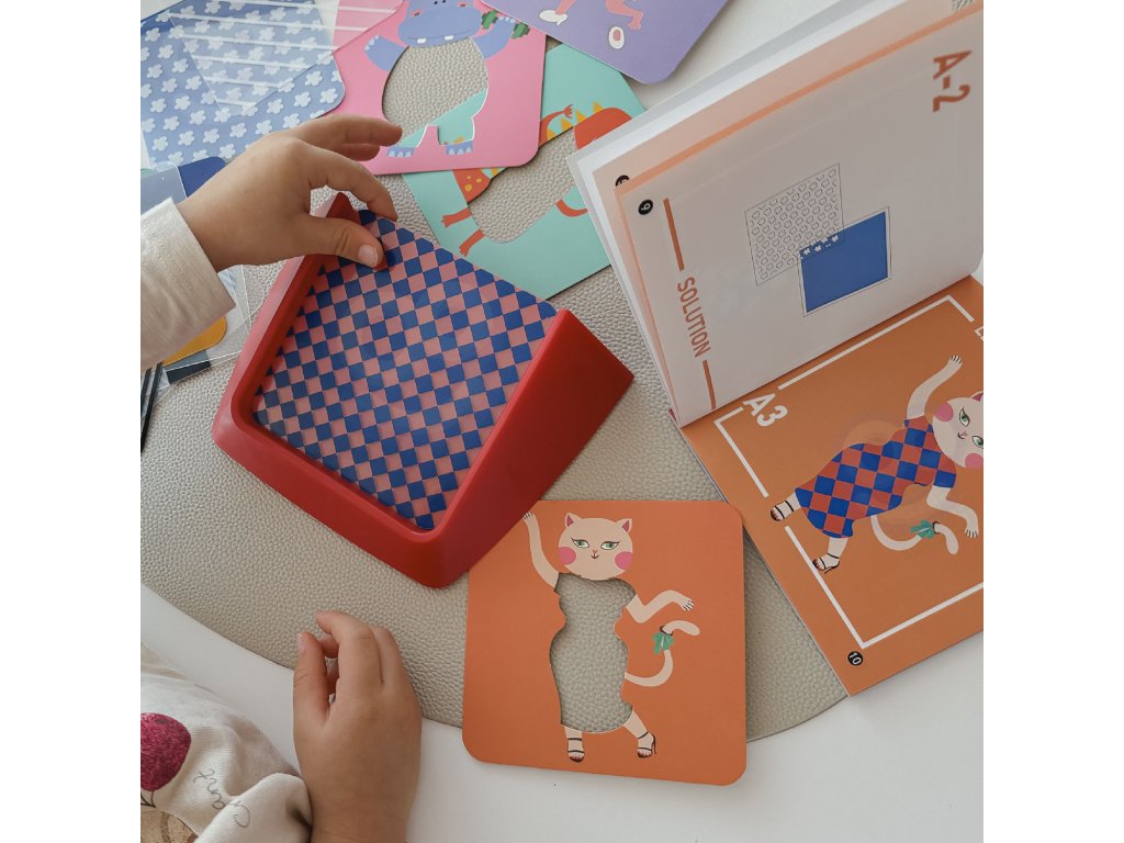 - - W nastaviť: stojan na hru, 4 šablóny, 18 kariet so vzormi a brožúra s aktivitami